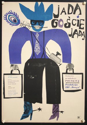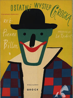 Dans cette affiche, on voit un élément graphique central qui semble une fois encore être un personnage. On retrouve également un tracé proche d’un dessin enfantin. On observe la grande présence de formes géométriques comme les carrés étroits sur la veste d’un protagoniste ou encore le trapèze qui vient former sa tête. Le choix typographique s’articule de nouveau autour du personnage, il participe avec lui mais sans l’effacer. Tomaszewski a opté pour une police de titrage en capitale avec un léger ornement sur le nom du personnage GROCKA . Pour la police de labeur, elle semble un peu moins stable comme si elle avait été tracé à la main. Le choix de la colorimétrie est un peu différent de Lenica car plus coloré sur cette proposition. En effet, on vient poser un personnage où les couleurs qui prédominent sont le bleu foncé, le violet et le vert.