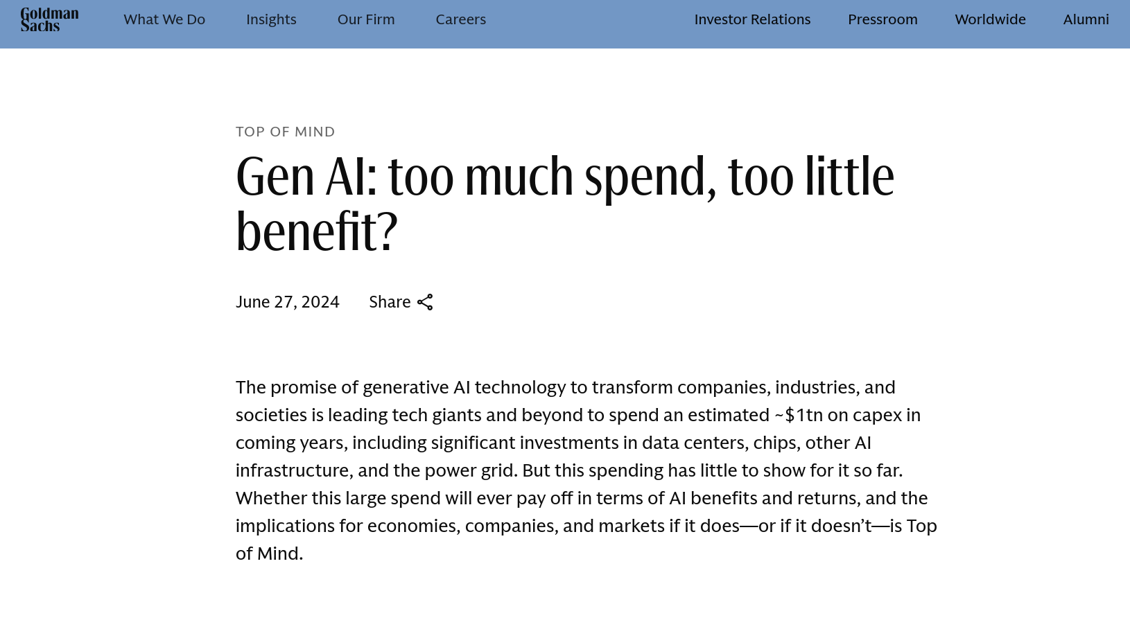 La vérité, a un jour écrit l'immense Philip K. Dick, c'est ce qui perdure lorsque l'on cesse d'y croire. Ce sont les faits, têtus et inexpugnables, qui s'installent lorsque la psychose reflue et que l'hallucination se dissipe. Parfois, le retour au réel se fait en douceur. Parfois, seul un choc violent avec le réel peut desserrer l'emprise de l'illusion. Depuis le début de l'été, l'industrie de l'intelligence artificielle et le techno-capitalisme dans son ensemble vivent enfin un début de crise de foi. Après dix-huit mois à empiler les superlatifs jusqu'à l'absurde pour nous convaincre (et s'auto-convaincre) que des générateurs de texte améliorés étaient l'inévitable futur des sociétés, les voilà obligés d'admettre une possibilité encore impensable il y a six mois : l'IA censée révolutionner le monde ne sert en réalité à rien, et la bulle financière qui la soutient s'apprête à éclater. Les indices s'amoncellent, pour peu qu'on se force à regarder au-delà du brouillard médiatique hallucinogène qui entoure la technique depuis les premiers balbutiements de ChatGPT.Petit tour d'horizon. En 2023, le fonds d'investissement Sequoia Capital, pas exactement connu pour son agit-prop altermondialiste, écrivait que les "Sept Magnifiques", le surnom énamouré des sept plus grosses valeurs boursières de la tech (Alphabet, Amazon, Apple, Meta, Microsoft, Nvidia, Tesla) devaient répondre à "une question à 200 milliards de dollars". Une question toute simple : comment comptent-ils gagner de l'argent à court ou moyen terme avec l'IA lorsqu'elle nécessite des investissements gigantesques dans l'infrastructure - data centers, cartes graphiques et désormais centrales nucléaires pour alimenter le tout - tout en ne rapportant absolument rien? La seule réponse que l'industrie daigne fournir, par la voix de ses PDG prophètes : gardez la foi et laissez-nous faire. Mark Zuckerberg, un patron qui a un jour dépensé 36 milliards de dollars en 18 mois dans un métavers totalement inutile sans être une seconde inquiété par son conseil d'administration, explique par exemple que son prochain modèle d'IA nécessitera "10 fois plus" de puissance de calcul que l'actuel et affirme qu'il faudra "des années" avant que la technique ne soit rentable. Une foi aveugle partagée par Satya Nadella, Sundar Pichai et les autres, patrons de conglomérats devenus techno-prophètes aux poches sans fond, totalement détachés des impératifs de base de l'économie de marché - notamment celui de vendre un produit plus cher que ce qu'il coûte à produire, afin d'en tirer un bénéfice.La question (à 200 milliards) qui fâcheSequoia Capital, 20 septembre 2023Alors, en l'espace d'un an, la question à 200 milliards est devenue... une question à 600 milliards, estimait ce même Sequoia Capital en juin. À ce rythme infernal, l'industrie aura bientôt une question à 1000 milliards de dollars sur les bras, "sans résultats probants" pour y répondre, hallucinait pour sa part un autre faiseur de pluie du capitalisme, Goldman Sachs, dans un rapport de juin. Au seul second trimestre 2024, les dépenses en capital ("capex", en jargon de téléspectateur de BFM Business) d' Alphabet, Apple, Amazon, Meta et Microsoft ont atteint 59 milliards de dollars, et plus de 106 milliards au premier semestre 2024. Du délire. Selon le média The Information, OpenAI, "leader" du marché (inexistant) de l'IA générative, pourrait perdre 5 milliards de dollars en 2024 - dix fois plus qu'en 2022. Réaction de son PDG Sam Altman, interrogé en mai sur l'inanité de son business model : "Cramer 500 millions ou 5 milliards de dollars par an, je m'en fous - vraiment, je m'en fous." Altman le dit et le répète, il est au-dessus des basses motivations pécuniaires. Son truc à lui, c'est d'atteindre la "singularité technologique" et de l'offrir à toute l'humanité. Le fait que sa philanthropie ait fait de lui un milliardaire en avril dernier relève de la coïncidence.Conséquence logique d'une caste de patrons qui a visiblement décidé de laisser le bon sens économique au vestiaire, un seul réel gagnant se détache de cette hallucination collective : Nvidia, qui fabrique et vend les cartes graphiques sur lesquelles fonctionnent les machines à désinformation vendues par la clique de camelots californiens. Mais là encore, quelque chose cloche. L'entreprise vaut désormais 3000 milliards de dollars en Bourse - soit 500 millions de dollars de plus que l'intégralité du CAC 40 - et talonne Apple pour la position d'entreprise la plus chère du monde. Pendant la ruée vers l'or, il fait bon être vendeur de pioches.IA générative : trop de dépenses, pas assez de bénéfices?Goldman Sachs, 27 juin 2024Les chiffres donnent le tournis. L'IA générative est le vaporware le plus cher, le plus inutile et le plus polluant de l'histoire des gadgets inutiles. Ce n'est pas moi qui le dis. Même chez les gardiens du temple sociopathes du capitalisme spéculatif, pourtant habitués à s'enrichir en prédateur sur des conditions macroéconomiques absurdes, l'industrie de l'IA générative passe pour une secte millénariste. Dans un courrier supposément confidentiel envoyé à ses clients début août, le fonds spéculatif Elliott Management conseille à ses clients de prendre ses distances avec les entreprises de l'IA, qu'il décrit comme une technique "surévaluée dont la plupart des applications ne sont pas prêtes", qui ne sera "jamais économique, ne fonctionnera jamais correctement, consommera trop d'énergie et restera perpétuellement faillible". Ippon. Chez Goldman Sachs, le ton se fait presque menaçant : "Plus le temps passe sans usages significatifs, plus le récit de l'intelligence artificielle deviendra difficile à tenir. Si aucun cas d'usage important n'apparaît dans les 12 à 18 prochains mois, l'enthousiasme des investisseurs va peut-être se dissiper." Même le cabinet McKinsey, qui promettait en