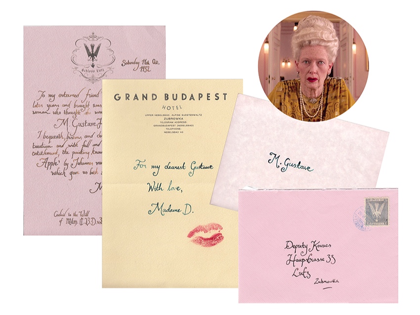 Enfin, je m’attarde un peu plus en détail sur les éléments graphiques propres des personnages comme la lettre des dernières volontés de l’amante Madame D. pour Monsieur Gustave. Annie Atkins a pris en compte les événements temporels du script venant à dire que cette lettre a été écrite aux alentours de 1886 avant la mort de son mari. Ce faisant, Annie Atkins a utilisé un papier japonais fait main qu’elle vieilli avec des taches de thé avec par dessus une calligraphie écrite au stylo à plume avec une encre couleur sépia suivi du baiser en bas de note réalisé avec le rouge à lèvres correspondant à celui que l’actrice portait lors de son apparition dans le film. De surcroît, il y a par exemple la carte de visite du personnage de Jopling : un des antagonistes du film qui a notamment assassiné le député Vilmos Kovacs afin qu’il garde le silence.