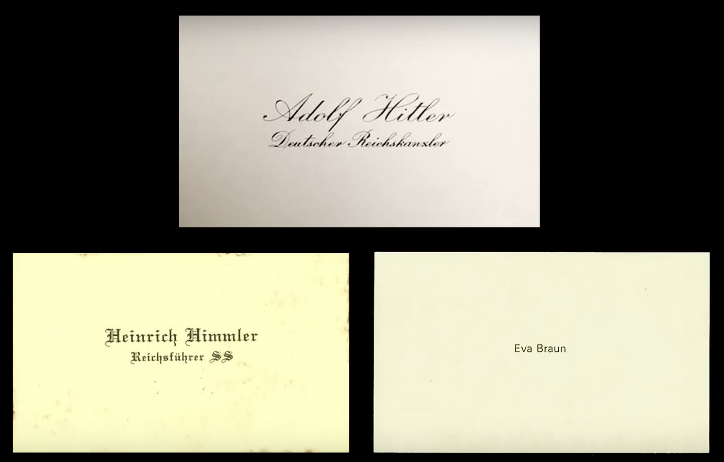 Références de cartes de visite de nazis utilisés par Annie Atkins comme inspiration. On peut apercevoir cette carte alors qu’il se présente au domicile de la sœur du personnage de Serge X. qu’il recherche. Cette carte présente le nom du personnage dans une police de caractère gothique suivi de sa fonction dans une police de caractère plus simple sans serif tout en capital. Ces choix typographiques ne sont pas laissés au hasard car ils s’inspirent de typographies présentées sur des vraies cartes de visite de fascistes allemands des années 1930. Pour finir, il y a une scène où Zéro, le lobby boy, offre un livre de poésie romantique à sa bien aimée Agata lors d’un tour de manège.