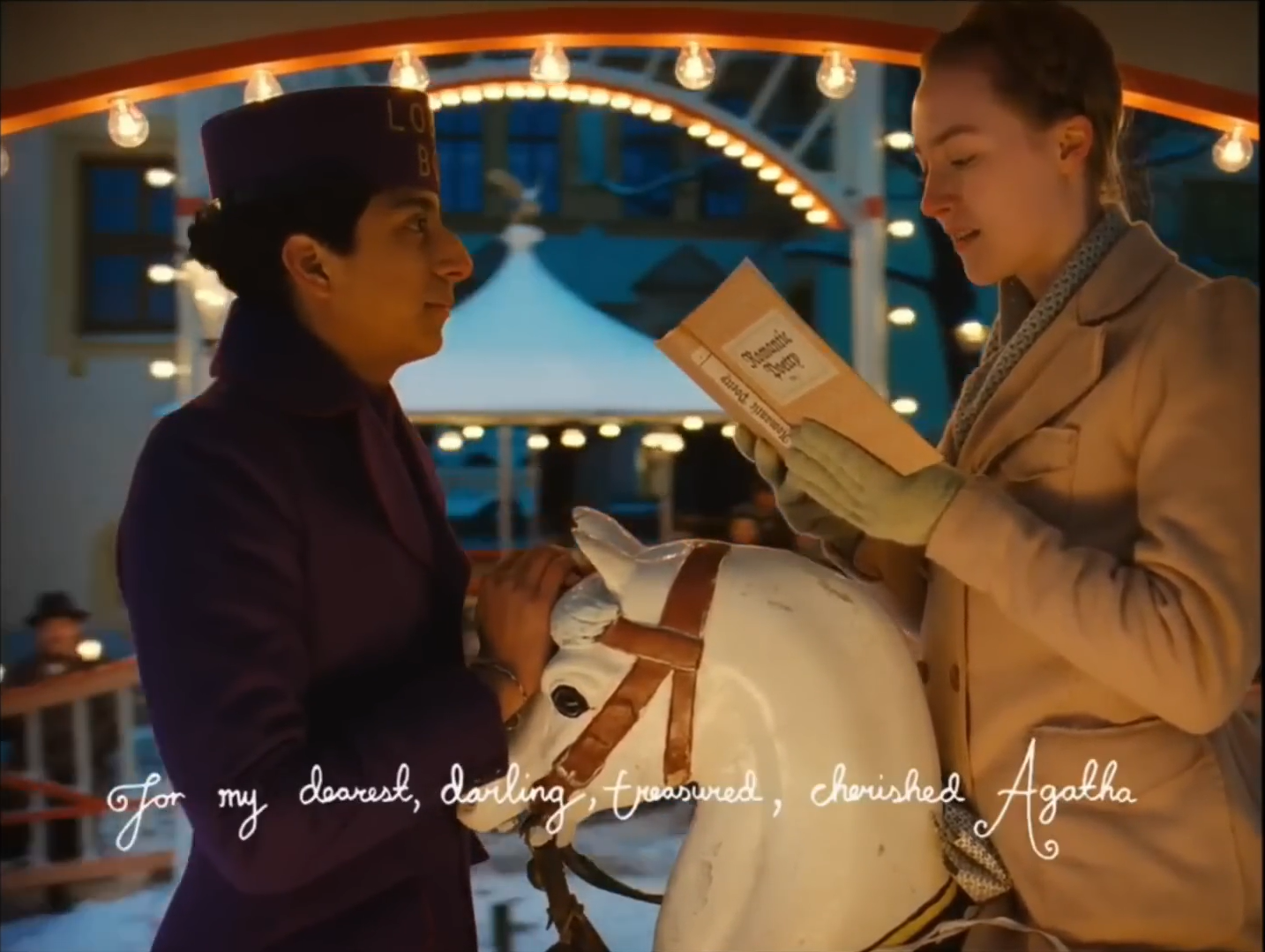 Scène du caroussel avec Zéro et Agatha avec les mots de Zéro qui apparaissent sous forme de sous titre à l’écran reprenant l’écriture du personnage. Celle-ci lit alors les mots écrits par Zéro à la première page. Nous ne voyons pas l’intérieur du livre mais ses mots sont retranscrits sur l’écran à travers des sous-titres. Et il s’avère que l’écriture manuscrite montrée est celle de l’acteur lui-même car les premiers tests étant trop formels et semblent être réalisés par un calligraphe.