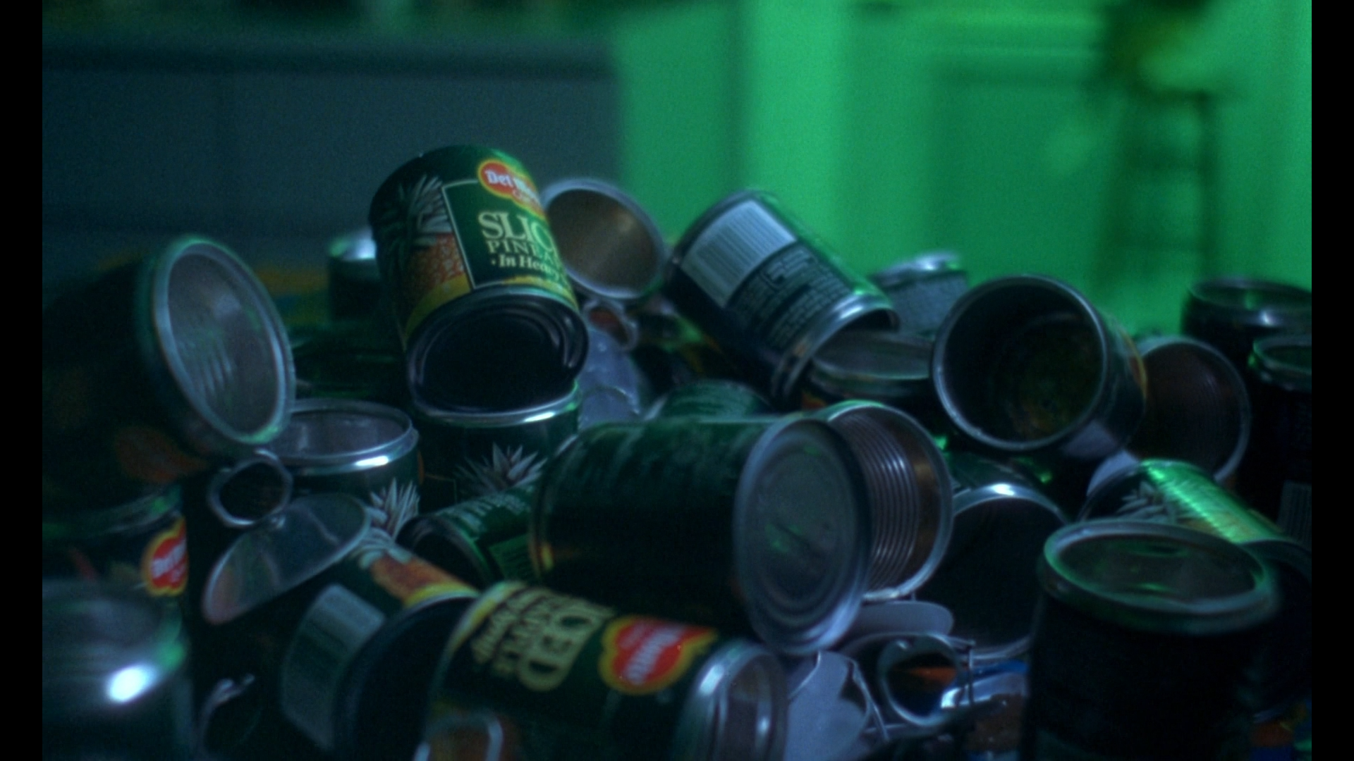 Boîtes d’ananas périmés consommées par le personnage du matricule 223. depuis le 1er mai présentées à plusieurs reprises caractérisant la souffrance du personnage de matricule 223 suite à sa rupture le même jour. Cette scène interprète une tentative d’arrêt du temps face à ce monde transitoire. Ou encore les boîtes de sardines que Faye remplace au domicile du policier matricule 663 à son issu. Ces objets graphiques témoignent l’inscription d’une société de consommation qui participe à la sensation d’aliénation de la ville. D’autre part, la forte présence de néon lumineux sur les enseignes de la ville