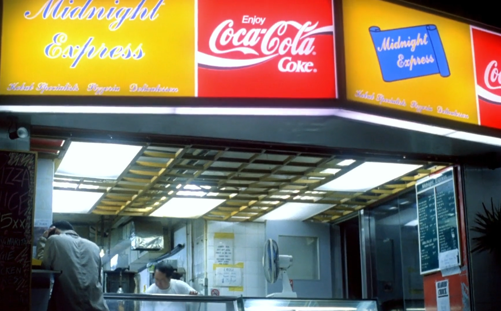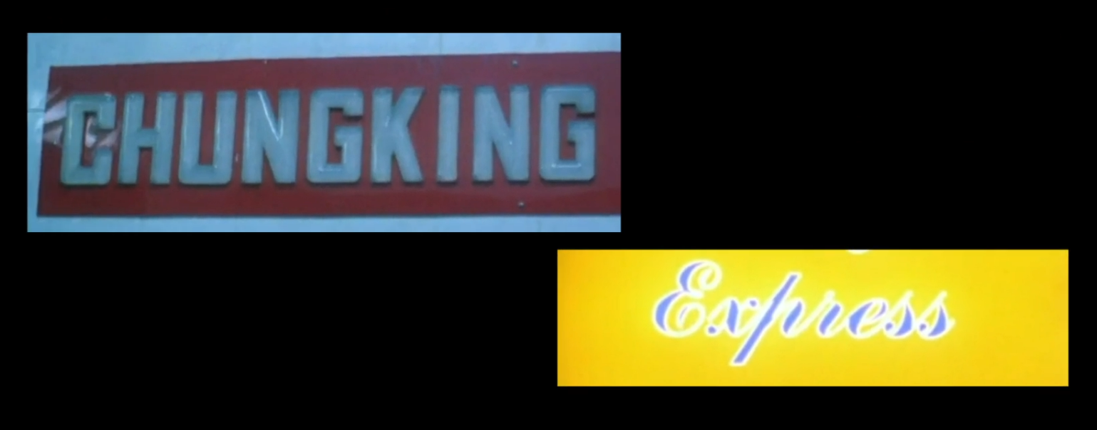 Détail des enseignes de la Chungking House et du Midnight Express.. Ces lieux existent réellement à Hong Kong et l’on perçoit leurs enseignes dans le film. Et bien qu’il n’y aurait pas eu de designer graphique spécifique qui ait travaillé pour le film, Wong Kar Wai a su y porter attention en mêlant des éléments graphiques dans son film : que ce soit à travers son fétichisme pour les objets comme matérialisation des sentiments des personnages, ou par des nombreux éléments participants à la représentation de la ville et de la modernité ou encore par un style visuel fragmenté effectué au montage par son directeur de photographie directeur Christopher Doyle.