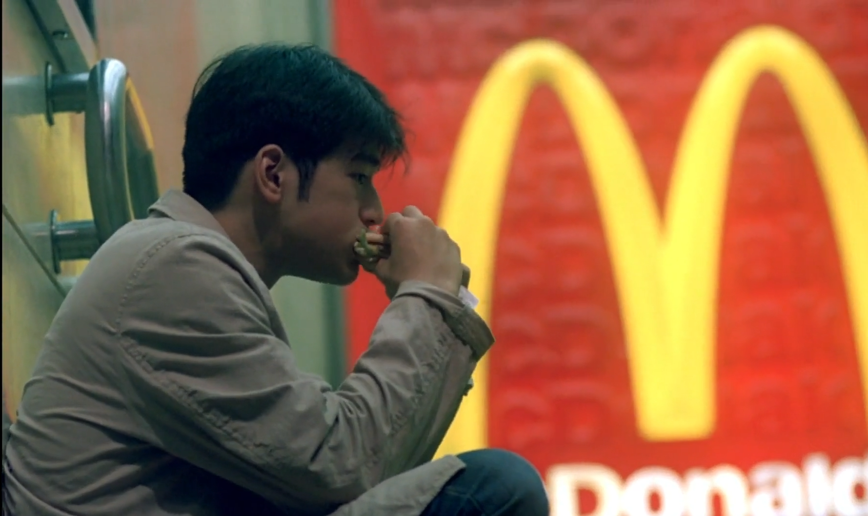 Le personnage du matricule 223 devant l’enseigne lumineuse du Mc’Donald.ou les enseignes commerciales importés mêlées aux enseignes locales traduisant la culture hongkongaise des années 1990. Il y a également les boîtes de conserves d’ananas périmé