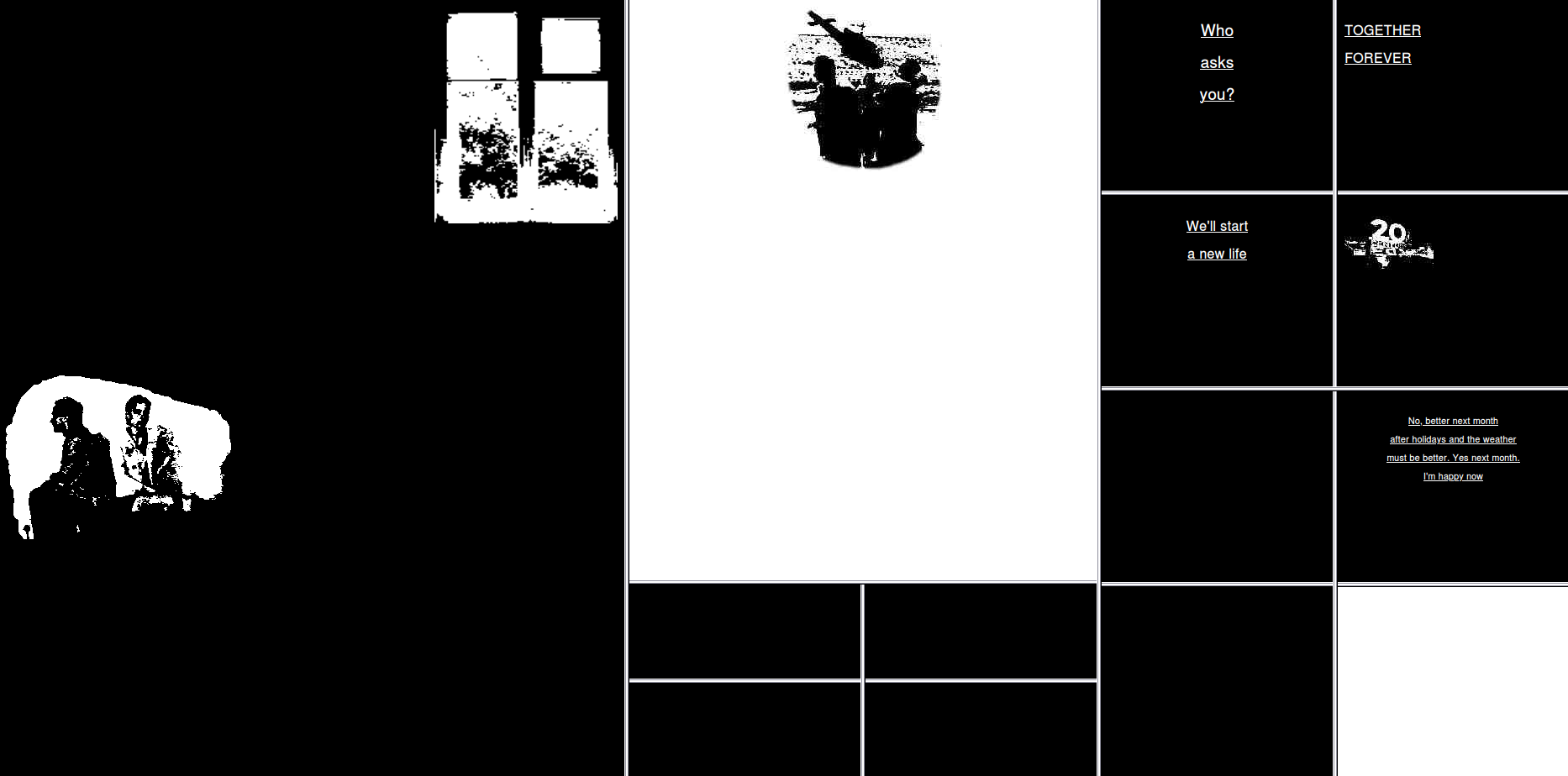 My Boyfriend came back from the war est sûrement l'oeuvre la plus connue d'Olia Lialina. Sortie en 1996 c'est une oeuvre interactive nous plongeant au coeur d'une relation amoureuse. L'oeuvre nous invite à cliquer sur le peu d'éléments présent sur la page pour ensuite déployer une histoire modulable, où nos cliques change le cours du récit.