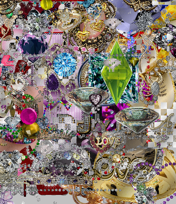 "expropriation of glitter and bling" 2017. Une apparition de dizaines de strass, bijoux, et GIFs de diamants, à disposer, déplacer où on veut.