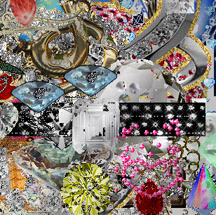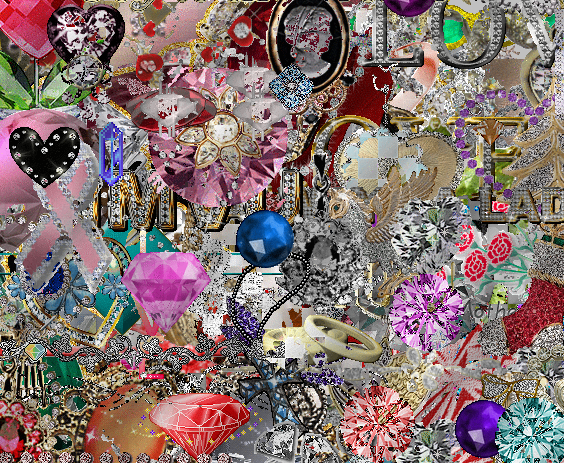 "expropriation of glitter and bling" 2017. Une apparition de dizaines de strass, bijoux, et gif de diamant, à disposer, déplacer où on veut.