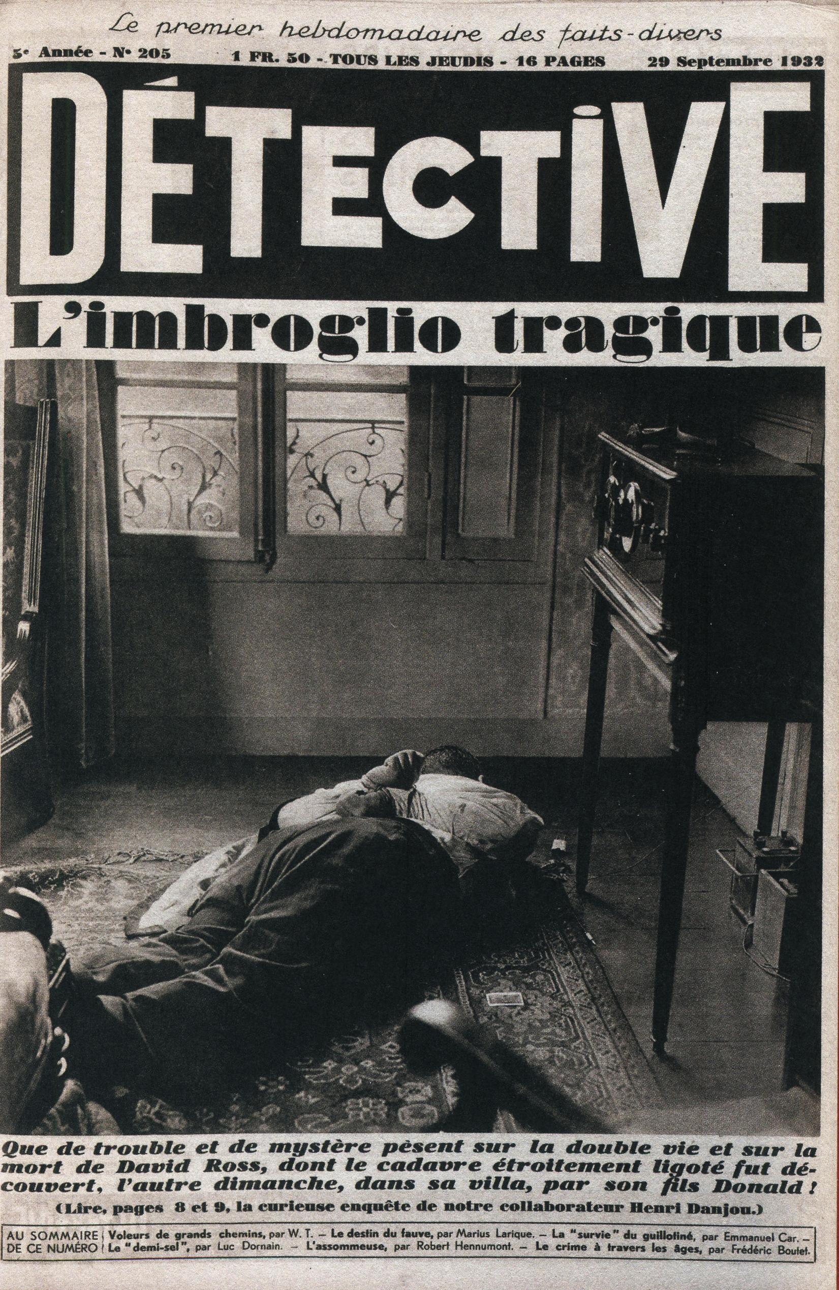 La revue Détective voit alors le jour dans un contexte singulier : la France est en plein “boom médiatique” après la Première Guerre mondiale, avec une certaine modernisation de la presse/une révolution de l’information. Première revue de France entièrement consacrée aux faits divers, elle se qualifie de “plus grand hebdomadaire des faits divers”, sous-titre de cette dernière ayant perduré durant de nombreuses années. Ainsi, elle s’inspire en premier lieu de la rubrique “Faits Divers”, de la Nouvelle Revue Française, revue littéraire et critique, lancée par Gide en 1926. Effectivement, alors que Gaston Gallimard cherche à renouveler ses publications, il s’inspire de celle-ci. Pour se faire, il fait appel aux reporters dits les frères Kessel. Ces derniers participent autant à la direction qu’à la rédaction, l’un l’autre, s’entourant d’une équipe de reporters. Avec un premier numéro sortant le 28 octobre 1928, la revue se lance alors dans un long périple éditorial dédié aux sujets lourds, mais surtout tabous, nourrissant la curiosité malsaine de ses lecteurs : sexe, drogue, crimes en tous genres, grands reportages sur le bagne, prostitution, … Des écrivains de renom aux débuts de la revue participent ainsi à la construction de l’hebdomadaire, au grand format à tonalité sépia, débordant de photographies pour l’époque, par les mots, tels que Joseph Kessel, Pierre Mac Orlan, ou encore Francis Carco. Les “faibles” faits divers des rubriques de journaux à grands tirages de l’époque, se concrétisent ainsi, et deviennent par conséquent de réels “récits d’enquêtes”, dans lesquels le lecteur devient presque lui-même détective.