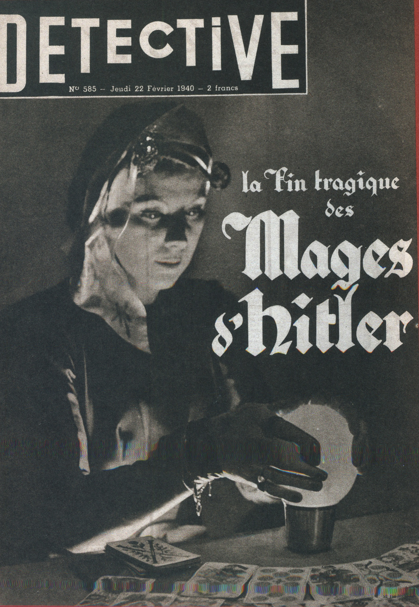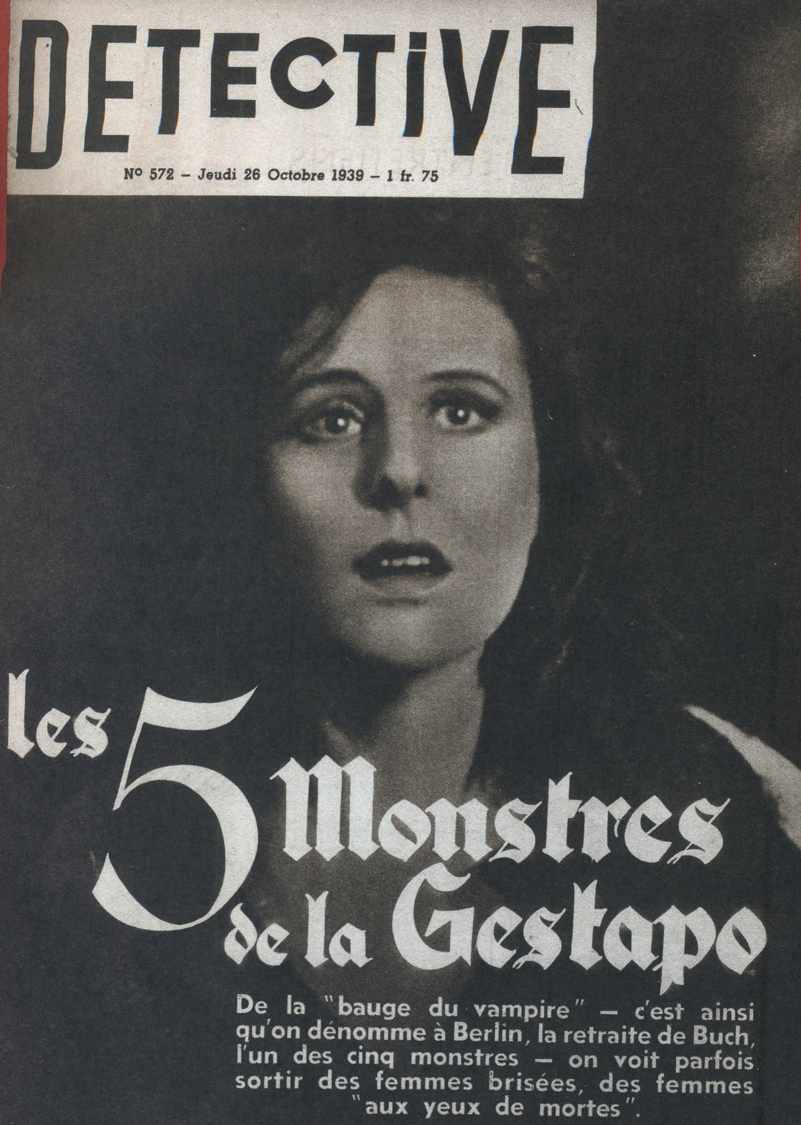 À partir de la création de la revue jusqu’en 1940, Détective construit son esthétique de première page autour de ses “images-chocs”. Évoquées précédemment, aussi qualifiées de “photos-traumatiques”, la notion se développe grâce à Roland Barthes. Ce dernier utilise cette notion afin de désigner un type d’image comme si violent qu’il en devient insignifiant. Ces photographies sont alors le point culminant, l’élément principal de la mise en page du magazine. En effet, occupant a minima la moitié de la couverture, jusqu’en 1937, pour ensuite arriver en pleine page, les images, représentatives du crime de l’époque, défilent. Ces dernières sont alors accompagnées du nom de la revue pour titre, en capitales massives, sans empattement et aux lettres étirées, agissant comme un bandeau institutionnel, qui restera jusque dans les années 1960. Avant l’arrivée des années 1940, la mise en page reste de ce fait assez simple, avec trois éléments sautant aux yeux : le nom de la revue, naturellement, le titre du numéro, “annonçant la couleur”, et une photographie. En dessous de cette dernière, un texte la sur-explicitant, témoignant l’horreur de l’époque par la relation image/texte. On retrouve alors un certain schéma dans le type de photographies relayées. Scènes de crimes aux cadavres apparents, gros plans sur des accusés, scènes de rue, présence policière, … Le fait divers se théâtralise. L’image devient un objet de consommation visuelle s’ancrant dans un système photojournalistique. C’est une forme de journalisme combinant textes et photos légendées, dans laquelle la photographie se transforme comme preuve irréfutable. C’est comme si on n’avait pas besoin de lire l’article, l’image contient le crime. Les tons sépias de l’époque, amènent alors une tension dramatique figeant les corps dans une atmosphère sombre et légèrement coloré. Dans les nombreux numéros publiés durant cette période, on observe que le fait divers principal est le meurtre. Un lexique propre à l’enquête criminelle est de ce fait employé, et les crimes ne sont plus uniquement montrés, ils se voient incarnés. La couverture ne traduit plus l’acte criminel, mais ses résonances politiques, morales et sociales. Ainsi, l’approche des années 1940 marque un premier tournant pour la revue qui décide de reprendre l’agencement et la façon de traiter les informations retransmises. En effet, les unes ont pour “mission” d’attirer le lecteur dans les kiosques à journaux, en étalant une ribambelle de titres chocs. Optant pour, comme évoqué précédemment, des images en pleine page, la revue amène du titrage secondaire, au contenu dramatique, procédant comme des blocs graphiques. Ils se superposent à l’image, contrairement à l’ancienne mise en page qui faisait effet d’“encadrement judiciaire”, venant toujours poser ses titres et accroches autour de l’image. Différentes polices de caractères sont employées. Sans empattements, avec, cursives, et même gothiques pour certaines unes sur la Seconde Guerre mondiale, Détective s’essaye à la multiplication de polices sur une même couverture. Alors, le contexte de l’époque se fait ressentir sur le choix graphique des couvertures de la revue. En effet, bien que les locaux de cette dernière aient été saisis par l’armée allemande en mai 1940, quelques numéros sont publiés, dont certains sont entièrement dédiés aux crimes de guerre commis par la gestapo. La médiatisation du crime était devenue matérielle narrative et idéologique. La propagande nazie façonnant les codes graphiques et médiatiques de la presse de masse de l’époque.