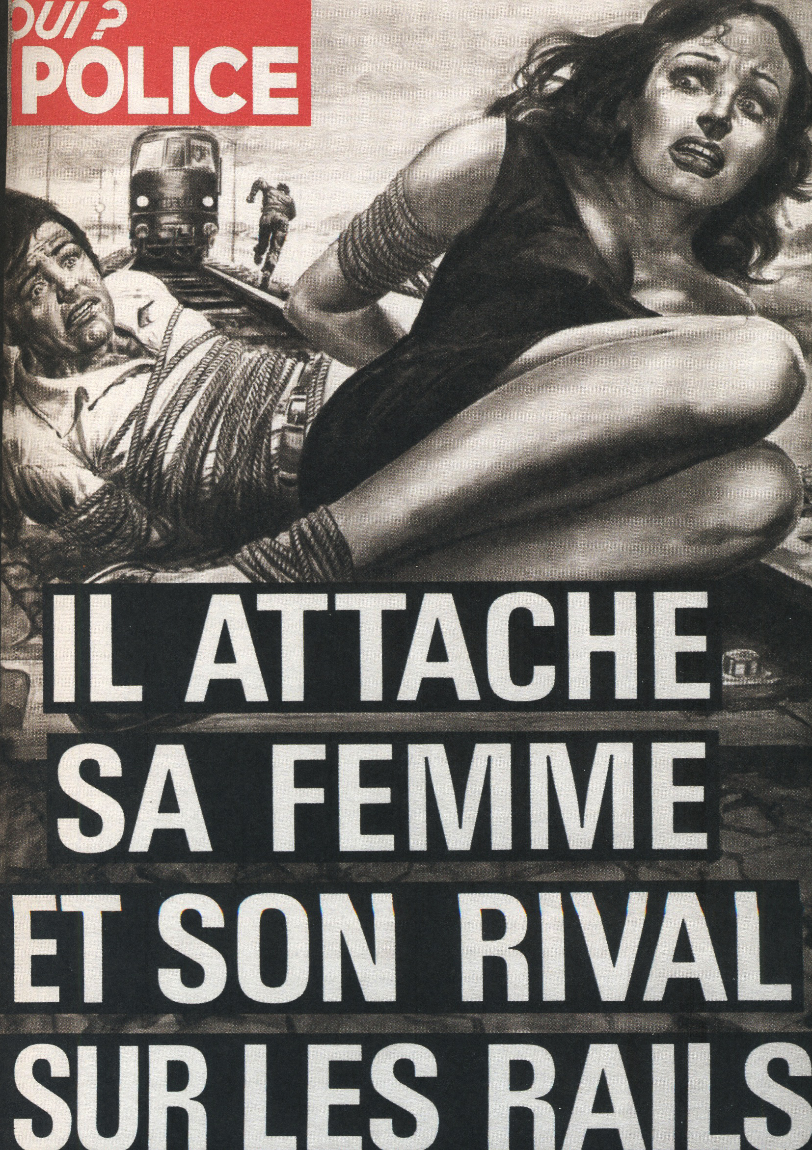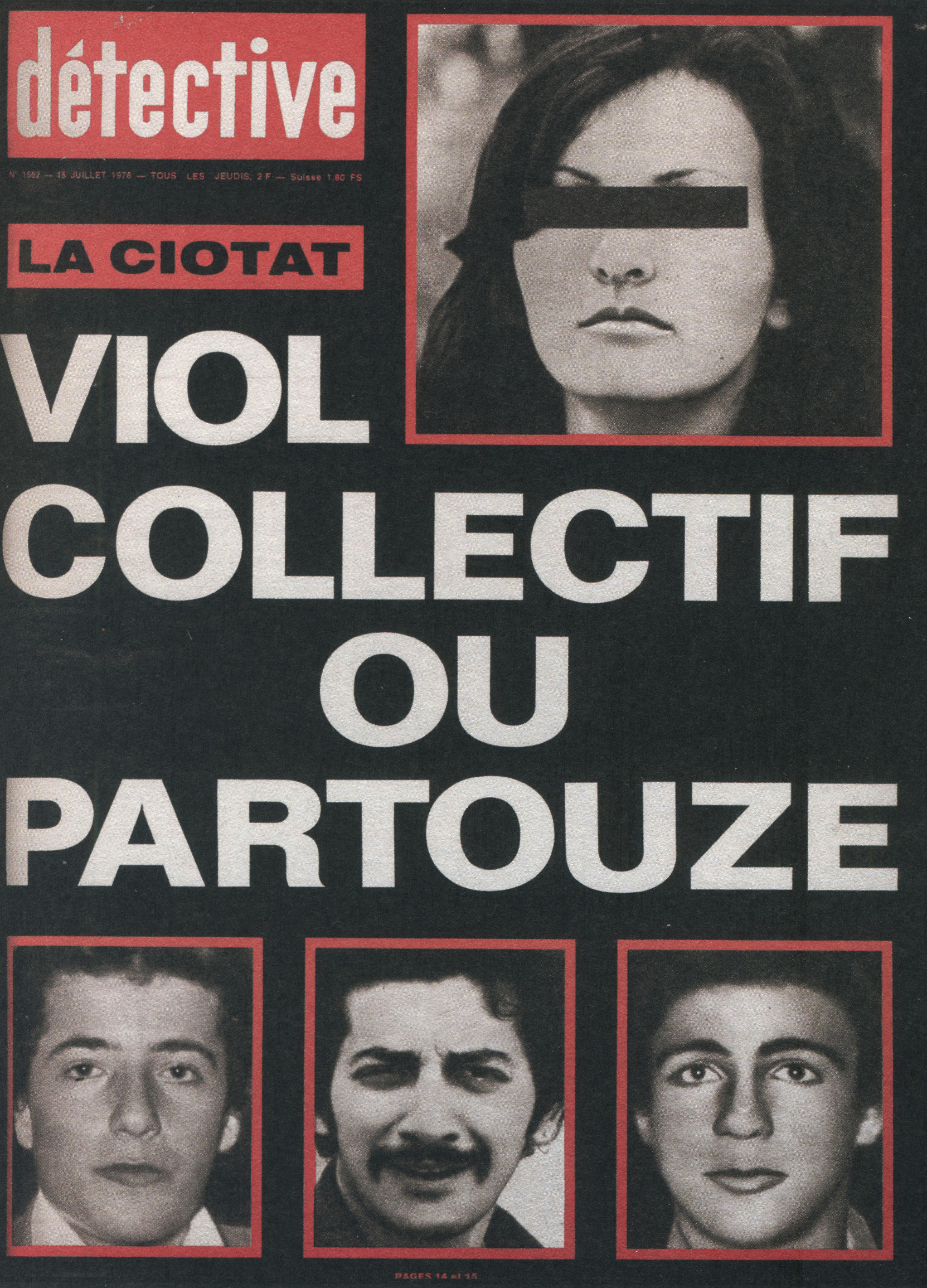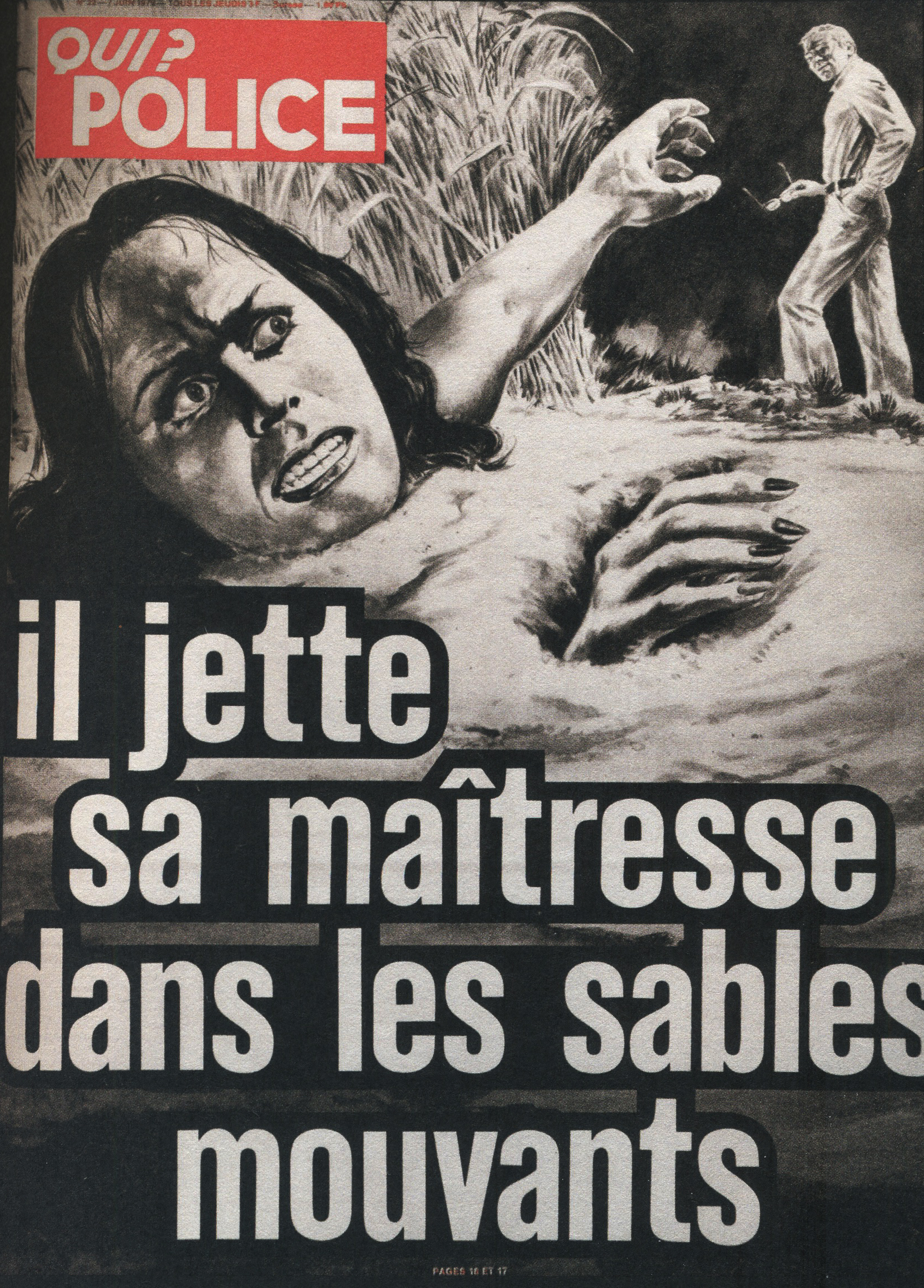 Ainsi, le titre a été racheté par les éditions Beyler. Après 1946, une nouvelle identité visuelle prend la couverture. Le nom change aussi. On passe de “Détective” à “Qui ? Détective”, jusqu’en 1958. Les anciens tons sépias disparaissent pour donner place à des couvertures noires et blanches. Ainsi, la guerre constitue un grand changement au niveau de la représentation criminelle au sein de la société. En effet, les horreurs de cette dernière, ayant exposé les français à des images d’une violence inédite (camps, ruines, morts de masse,…), le crime individuel paraît presque mineur face à un génocide. Ainsi, le fait divers n’est plus l’horreur suprême, et le crime ne peut plus être montré, ni pensé, de la même manière. Alors progressivement, on assiste à une disparition des cadavres visibles en couverture. Ne pouvant plus miser uniquement sur le choc, moins de scènes de crime sont explicitées, et le photojournalisme devient plus suggestif que démonstratif : reconstitutions photographiques, images prises après coup, photographies d’objets, de lieux vides, de traces, … Le crime est traduit par indices, reprenant les codes de l’enquête. Ainsi, la violence du fait divers est moins frontale. En 1958, le bandeau de titrage finit alors lui aussi par disparaître, pour faire revenir le nom d’origine de la revue, et finir en simple cartouche, en coin supérieur gauche de la page. Même police de caractère, mais cette fois-ci toute en minuscule, Détective accueille une deuxième couleur qu’il ne quittera plus : le rouge. Utilisée seulement pour des éléments de titrage, jamais dans ses photographies, elle devient une couleur de substitut au choc photographique des années sépias. S’inscrivant d’abord dans l’évolution des techniques d’impression de l’après-guerre, généralisant l’impression en bichromie ou trichromie, moins coûteuse et plus stable, le rouge est immédiatement perceptible. Captant l’œil à distance, hiérarchisant la page, le rouge n’informe pas, il signale. Le crime annoncé visuellement, on assiste alors à un réel appel au regard dans l’espace saturé des kiosques. Commence, de ce fait, à pointer le bout de son nez, les “crimes passionnels”, atteignant réellement leur pic de popularité durant les années 1970 – 1980. Jalousie, amour, drame conjugal, … les sujets intéressent d’autant plus, et circulent dans le climat du crime, approfondissant l’aspect psychologique (mobiles, troubles, enfance, caractère) des horreurs énoncées. Alors défilent une longue série de portraits, que ce soit de victimes ou de tortionnaires. Des cadrages cinématographiques au compositions plus aérées, la sans sérif finit par dominer la une, et les titres secondaires s’amoindrissent, eux aussi, peu à peu.
