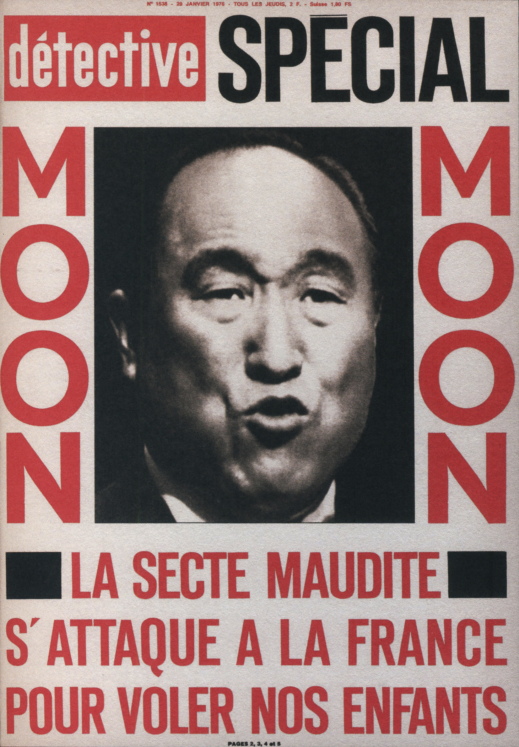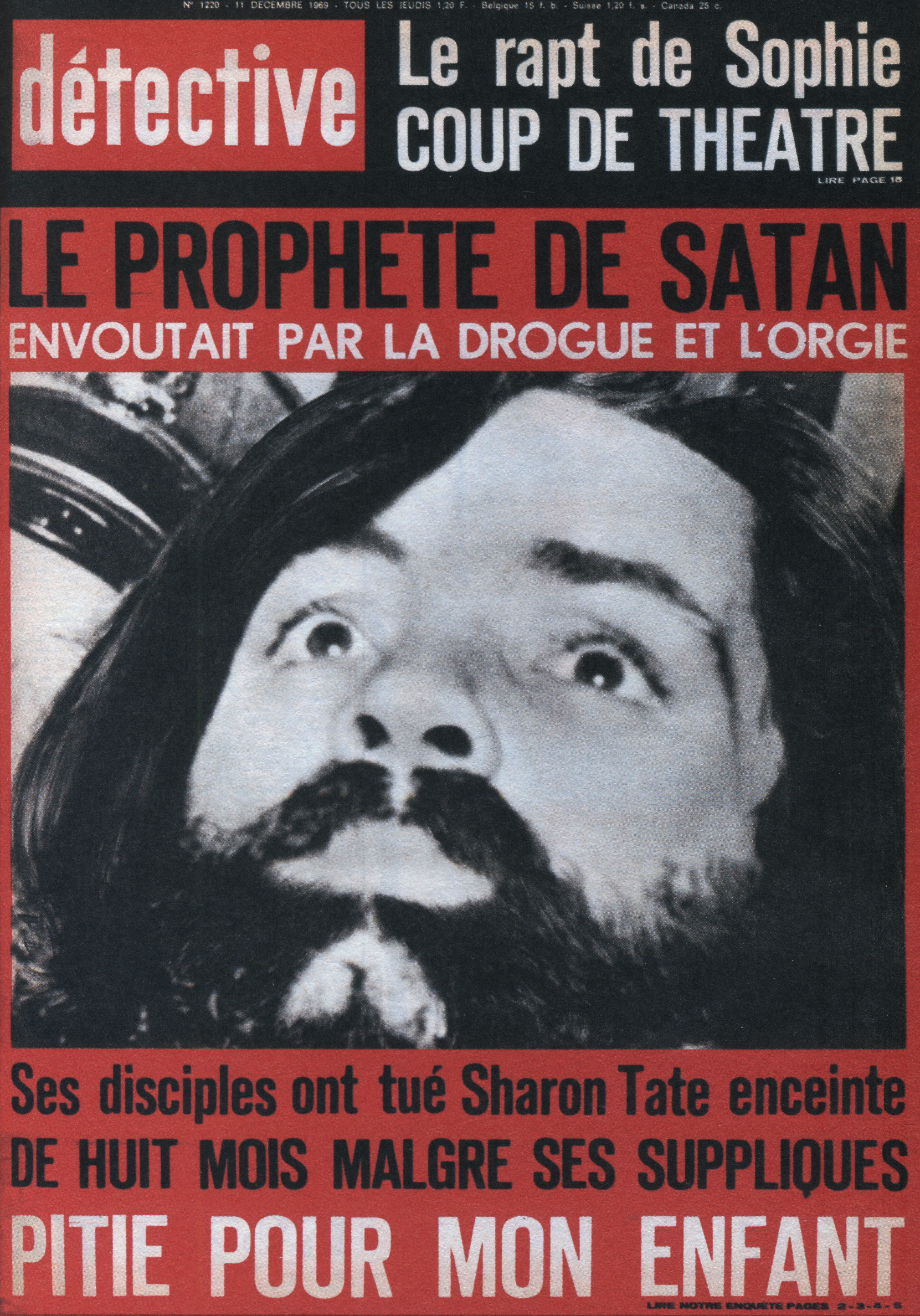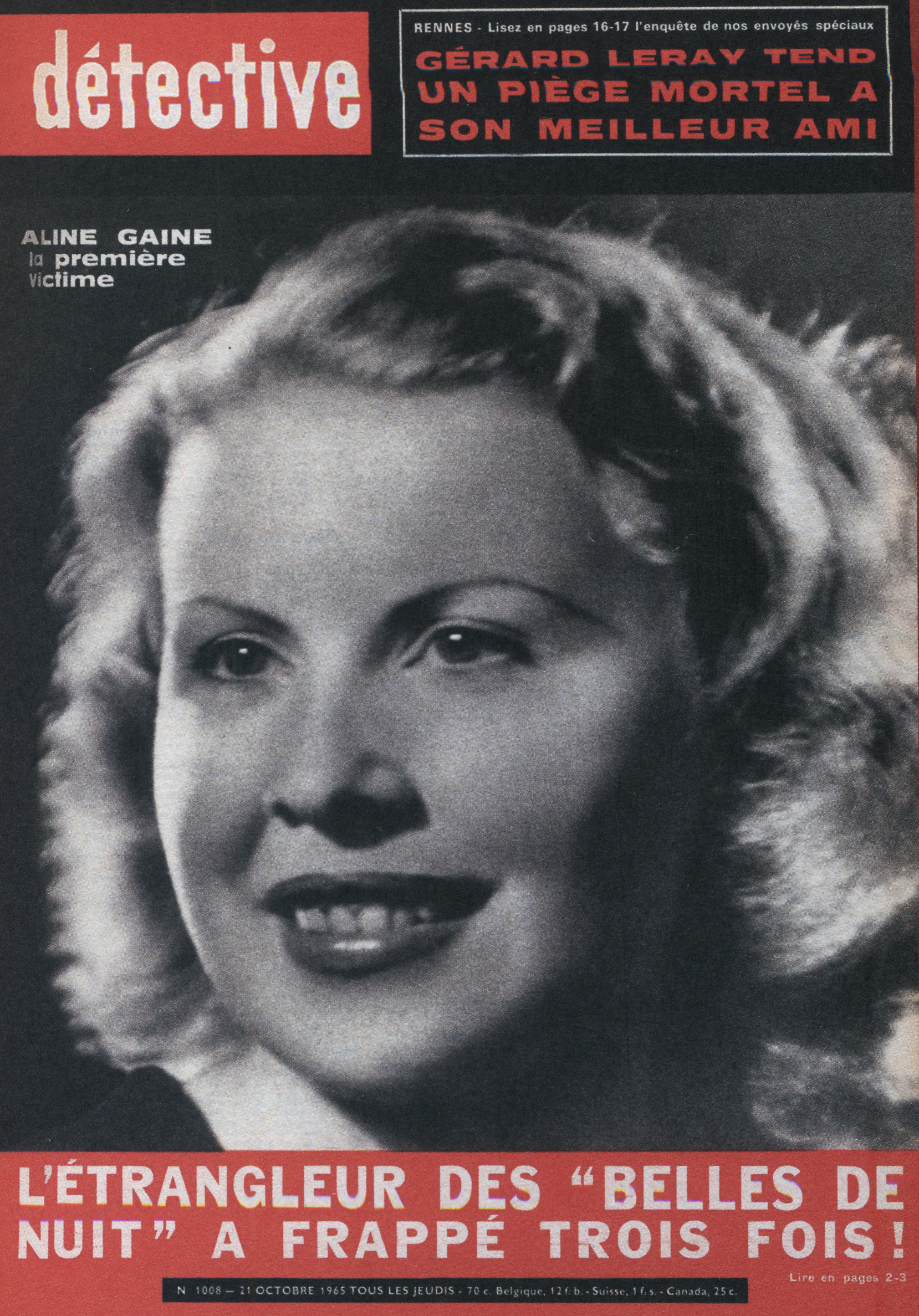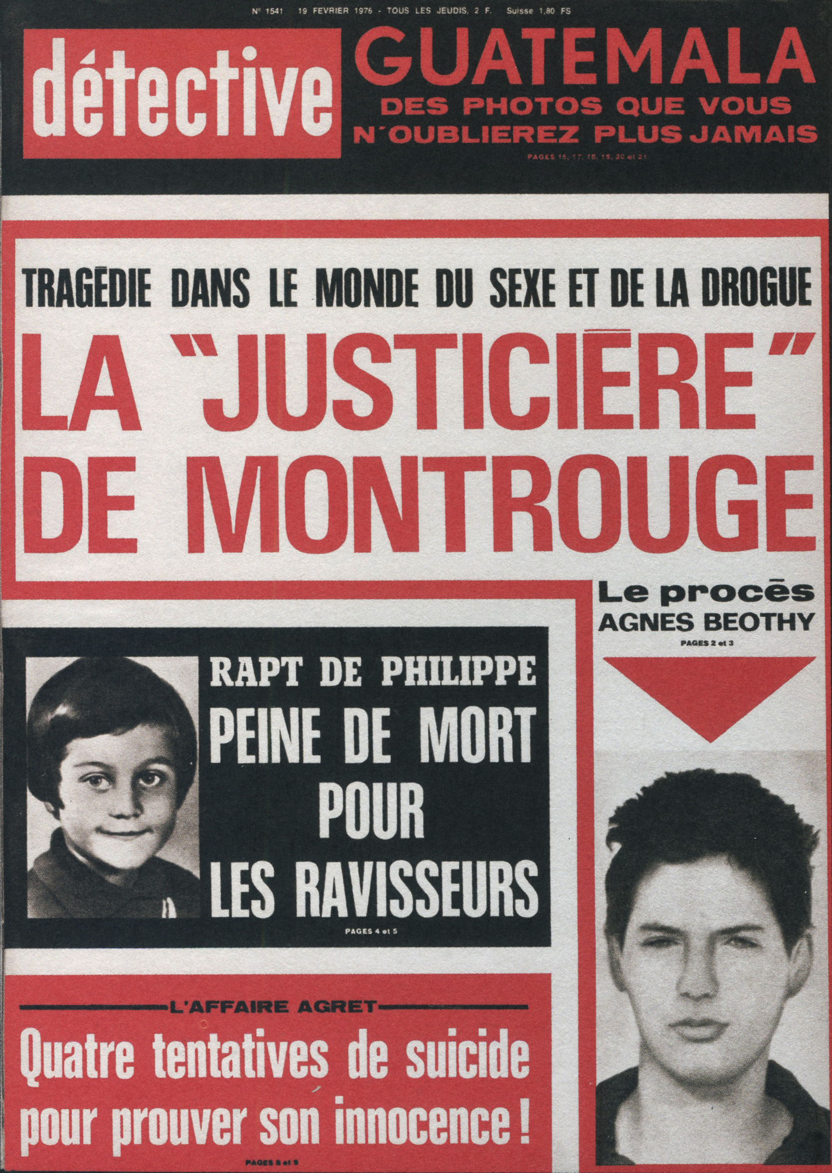 Ainsi, le titre a été racheté par les éditions Beyler. Après 1946, une nouvelle identité visuelle prend la couverture. Le nom change aussi. On passe de “Détective” à “Qui ? Détective”, jusqu’en 1958. Les anciens tons sépias disparaissent pour donner place à des couvertures noires et blanches. Ainsi, la guerre constitue un grand changement au niveau de la représentation criminelle au sein de la société. En effet, les horreurs de cette dernière, ayant exposé les français à des images d’une violence inédite (camps, ruines, morts de masse,…), le crime individuel paraît presque mineur face à un génocide. Ainsi, le fait divers n’est plus l’horreur suprême, et le crime ne peut plus être montré, ni pensé, de la même manière. Alors progressivement, on assiste à une disparition des cadavres visibles en couverture. Ne pouvant plus miser uniquement sur le choc, moins de scènes de crime sont explicitées, et le photojournalisme devient plus suggestif que démonstratif : reconstitutions photographiques, images prises après coup, photographies d’objets, de lieux vides, de traces, … Le crime est traduit par indices, reprenant les codes de l’enquête. Ainsi, la violence du fait divers est moins frontale. En 1958, le bandeau de titrage finit alors lui aussi par disparaître, pour faire revenir le nom d’origine de la revue, et finir en simple cartouche, en coin supérieur gauche de la page. Même police de caractère, mais cette fois-ci toute en minuscule, Détective accueille une deuxième couleur qu’il ne quittera plus : le rouge. Utilisée seulement pour des éléments de titrage, jamais dans ses photographies, elle devient une couleur de substitut au choc photographique des années sépias. S’inscrivant d’abord dans l’évolution des techniques d’impression de l’après-guerre, généralisant l’impression en bichromie ou trichromie, moins coûteuse et plus stable, le rouge est immédiatement perceptible. Captant l’œil à distance, hiérarchisant la page, le rouge n’informe pas, il signale. Le crime annoncé visuellement, on assiste alors à un réel appel au regard dans l’espace saturé des kiosques. Commence, de ce fait, à pointer le bout de son nez, les “crimes passionnels”, atteignant réellement leur pic de popularité durant les années 1970 – 1980. Jalousie, amour, drame conjugal, … les sujets intéressent d’autant plus, et circulent dans le climat du crime, approfondissant l’aspect psychologique (mobiles, troubles, enfance, caractère) des horreurs énoncées. Alors défilent une longue série de portraits, que ce soit de victimes ou de tortionnaires. Des cadrages cinématographiques au compositions plus aérées, la sans sérif finit par dominer la une, et les titres secondaires s’amoindrissent, eux aussi, peu à peu.