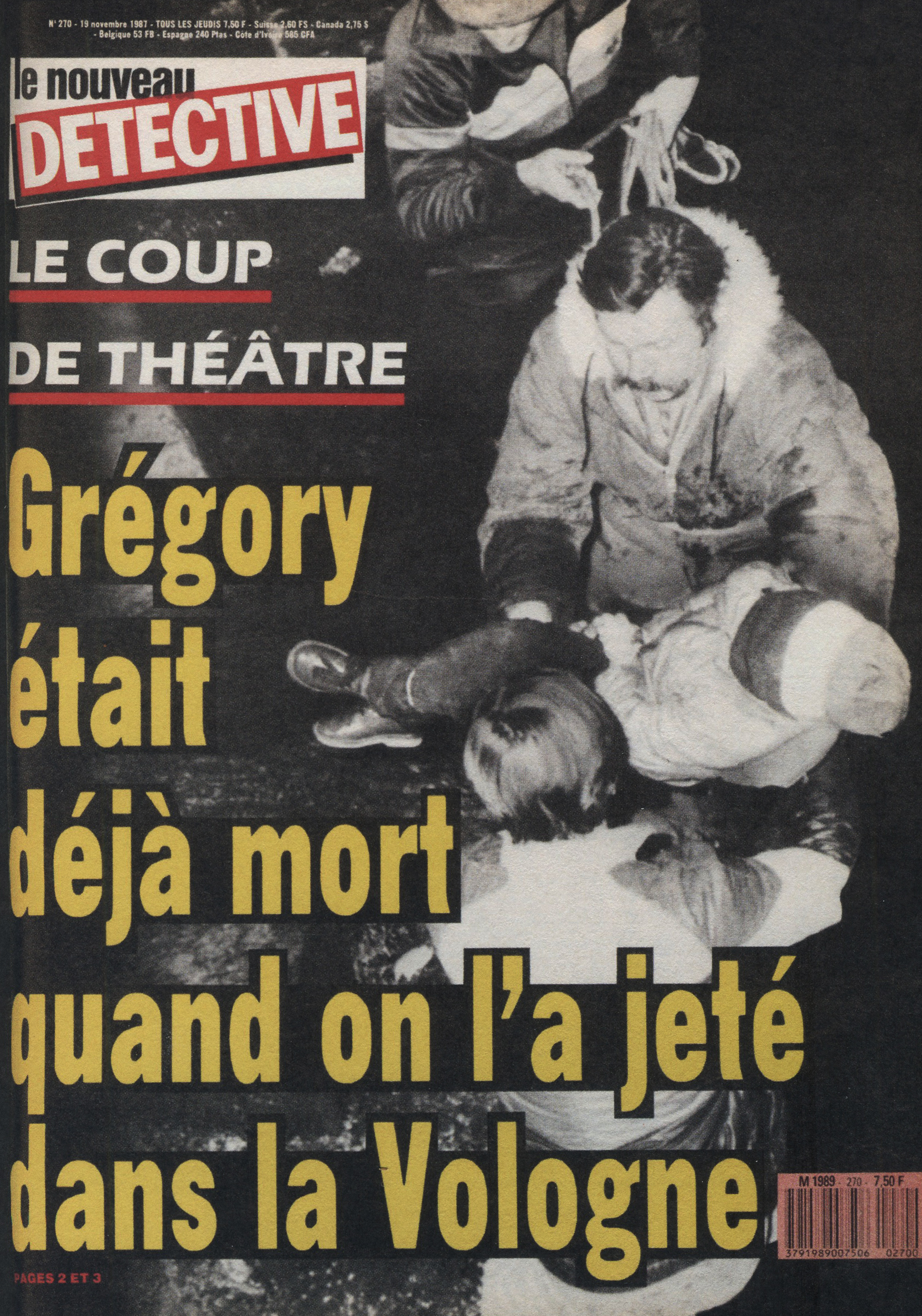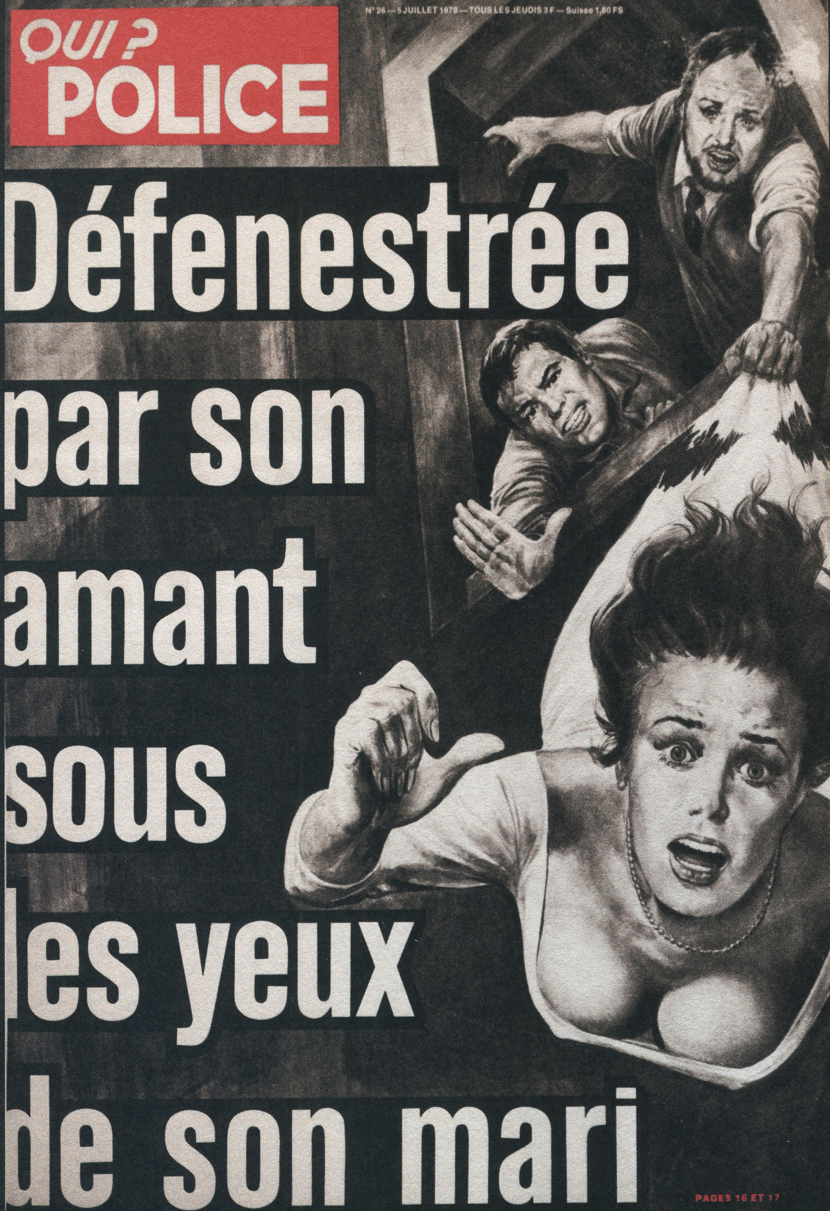 Comme susmentionné, les années 1970 – 1980, marquent un basculement net dans ce qu’on pourrait qualifier de mutation politique, sociale et médiatique pour Détective. Dépeignant une société fragmentée et anxieuse au vu des récents enjeux sociétaux (mai 68, crises économiques, montée du chômage, des inégalités, sentiment d’insécurité,…), la revue met principalement en avant crimes urbains, délinquance juvénile, violence sociale, et institutions débordées dans ses unes. Des thèmes récurrents, accompagnés de numéros traitant des tueurs en série, crimes sexuels, enlèvements, … On dénote alors une forte montée des crimes de femmes et d’enfants. En effet, le délit envahit le quotidien domestique : drames familiaux, crimes conjugaux, violences sur enfants, … faits divers n’est plus de l’ordre de l’affaire singulière, hors du commun, mais se banalise et devient ordinaire. Au niveau des choix graphiques, on observe alors des décisions photographiques surprenantes. Modèles en lingerie, canons de beauté à moitié dénudés, et nouvelles horrifiantes, les corps presque nus, au physique “parfait”, aussi étrange soit-il, cohabitent avec des titres plus sinistres les uns que les autres. Féminicides, prostitution, crimes comis par des femmes, viols… Ces sujets n’étaient pas autant représentés auparavant, du moins pas à la une. Ils apparaissent par conséquent en même temps que ces mêmes images “sexualisant” la femme. Dans le choix des mises en page, on ressent aussi la volonté de choquer le lecteur. Titrage beaucoup plus familier, Détective donne la parole aux victimes, mais aussi aux accusés. Se rapprochant de ce qu’on pourrait caractériser de “magazine people”, les images et les titres “choquent” non plus par leur violence criminelle, mais par la recherche unique du scandale, du provoquant, du dérangeant. Ces accroches occupent alors de plus en plus d’espace sur la couverture, massifs, absorbant totalement le nom de la revue, pour parfois ne laisser qu’un petit cadre où l’on aperçoit des portraits très saturés et autres. Mais à partir des années 1970, c’est surtout Angelo di Marco, célèbre illustrateur français, qui collabore avec le journal jusque dans les années 1980. En effet, réalisant des dizaines et des dizaines de couvertures pour le magazine, di Marco dessine des scènes réalistes, rejouant les crimes de la une. Souvent en cours ou imminent, les corps sont tendus, les gestes figés, juste avant ou juste après l’acte. Alors, l’entrée dans une sorte de “culture de la reconstitution” paraît comme l’aboutissement logique de Détective pour l’époque. Le fait divers, repensé comme une fiction plausible, quitte la piste de la “photo-documentaire”, et interroge une certaine désensibilisation du crime. L’illustration au centre de la couverture, en pleine page, bien que les titres restent massifs, on en oublie de ce fait ce qui l’entoure. Même le rouge vif, toujours présent et assez contrastant, s’abandonne dans les lavis de di Marco. Alors, la construction d’un imaginaire de la menace permanente s’installe progressivement dans la revue. Changeant d’ailleurs de nom pendant toute cette période di Marco, pour se nommer “Qui ? Police”. Ainsi, à la fin des années 1980, le journal rechange de nom, et devient “Le nouveau Détective”, pour ensuite afficher une nouvelle couleur à la une, notamment avec l’affaire du petit Grégory, qui a entraîné une multitude de couvertures pour Détective : le jaune. Une couleur à la lourde signification dans la presse puisqu’on l’associe souvent au “journalisme jaune”, un type de journalisme qui présente des nouvelles de faible qualité et qui mise sur des techniques tape-à-l’œil afin de se vendre davantage. Une association alors pas si insensée pour la revue de faits divers, puisque bien qu’elle ai eu un véritable succès commercial dans les années 1930, les ventes avaient diminuées. Alors la recherche de choc passe notamment par la couleur. Avec l’affaire du petit Grégory, on observe même la réapparition de quelques “images-chocs”, comme la découverte du corps de l’enfant.