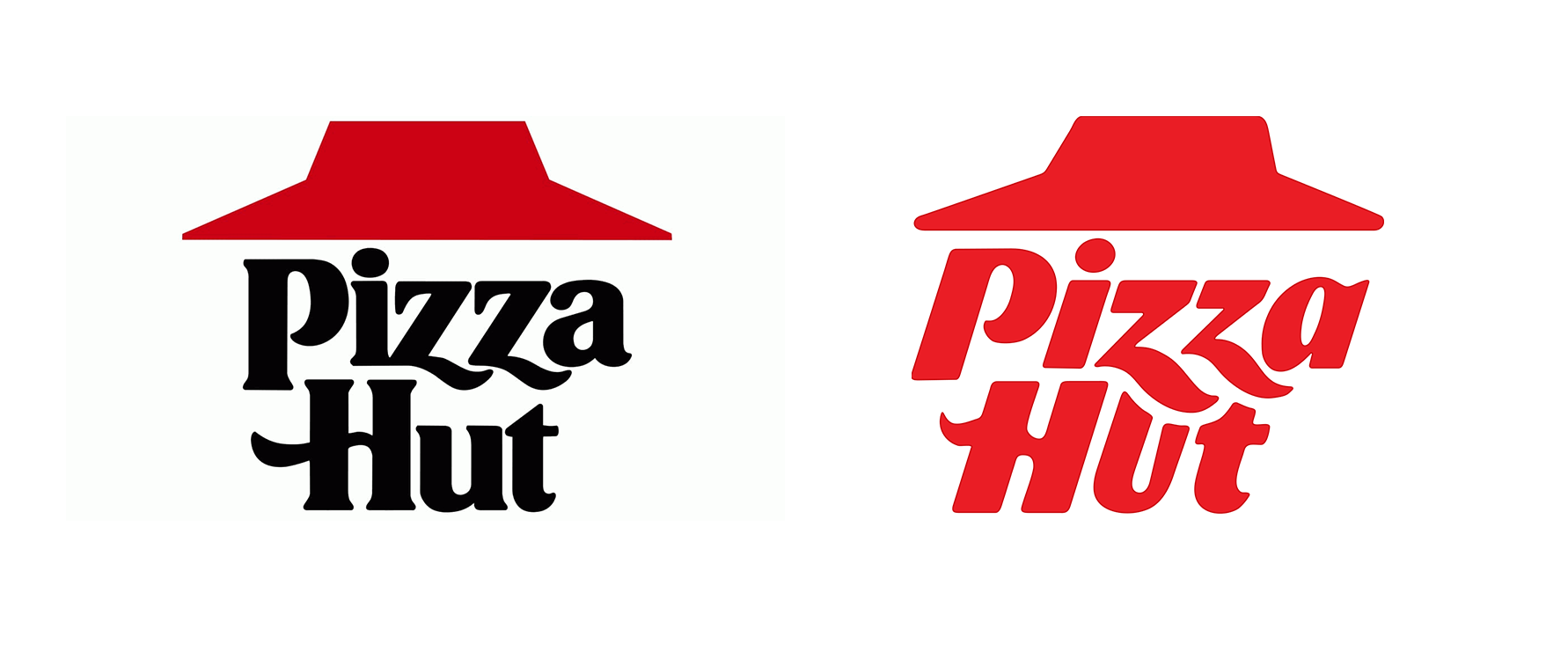 Un autre exemple emblématique de chaîne de restauration rapide, est Pizza Hut, comme son nom l’indique, une chaîne spécialisée dans la préparation et la livraison de pizzas. Historiquement, depuis la création de la chaîne en 1958, son nom n’a pas changé et est resté lié au mot-symbole : « Pizza Hut », qui renvoie à l’idée des deux étudiants fondateurs, Frank et Dan Carney, d’ouvrir un kiosque à pizza. Son logo suit le même schéma, en reprenant aussi ce mot-symbole, et en subissant que très peu de modifications au fil des années. Pendant les dix-sept premières années, le logo est uniquement typographique, passant d’une composition avec des lettres majuscules utilisant une police serif présentant des terminaisons et des sommets anguleux (notamment sur les lettres A, T et Z), de couleur rouge écarlate et non-alignées sur un même axe horizontal, donnant une touche ludique, à une composition noire sur deux niveaux, conservant un décalage sur certaines lettres. Par la suite et jusqu’aujourd’hui, l’entreprise à garder cette structure en deux niveaux, avec « Pizza » écrit au-dessus de « Hut » mais en rajoutant un chapeau rouge au-dessus, reprenant la conception du toit des bâtiments originaux, conçu par Richard D. Burke en 1969, évoquant le toit d’une hutte et symbolisant la protection et la sécurité.