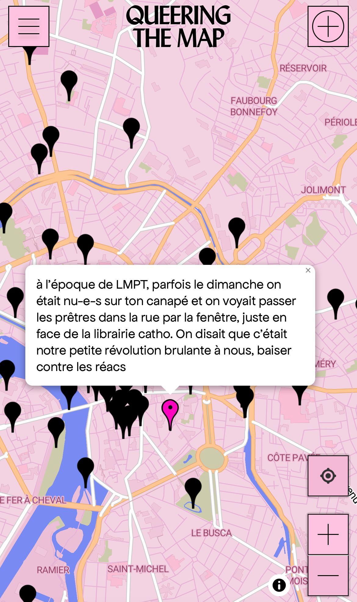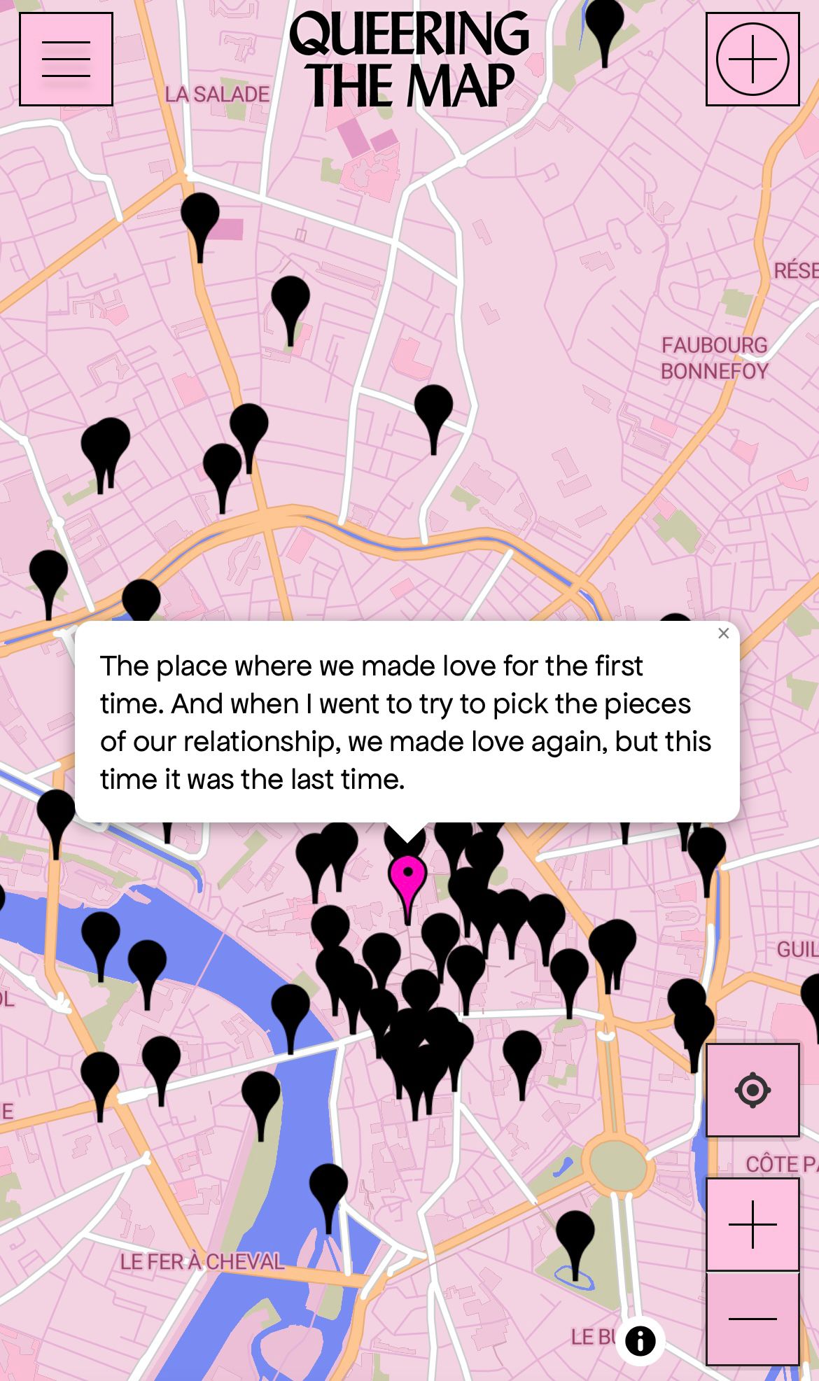 Plateforme participative permettant de cartographier des souvenirs et expériences queer, transformant la carte en dispositif narratif et politique.