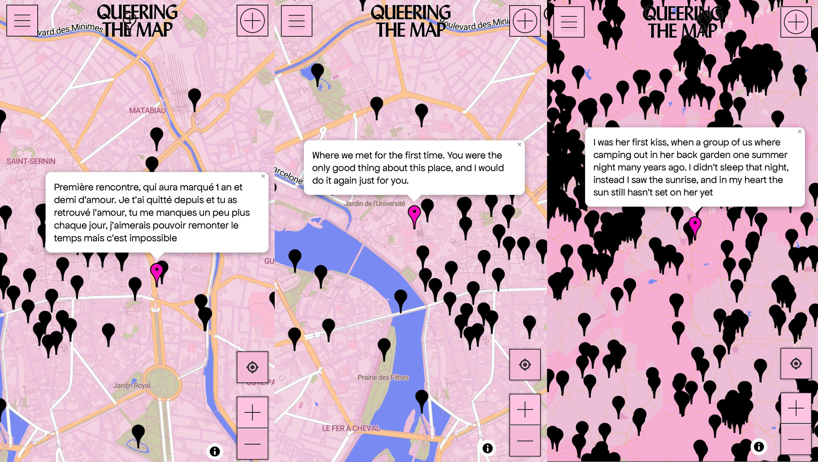 Cette approche visuelle évite la surexposition en remplaçant la représentation explicite du corps par une cartographie des émotions. Les points présents sur la carte se transforment en indices, en souvenirs qui préservent l’intimité tout en manifestant la présence queer dans l’espace public. Le fait de préserver l’anonymat des témoignages favorise une expression libre sans jugement visuel. On peut partager son expérience de première relation sexuelle, une rencontre secrète ou un instant affectueux sans jamais se dévoiler visuellement. La vulnérabilité s’exprime davantage par nos mots et nos lieux que par notre apparence physique, ce qui ouvre un espace où se dévoiler en toute sécurité. Au fil des récits qui s’accumulent, la carte devient comme un livre d’émotions où nos histoires personnelles se mêlent à une mémoire collective. Cette cartographie révèle aussi des territoires du désir et de la violence, montrant comment certains lieux portent en eux le poids de multiples vécus, entrelacés à travers le temps.
