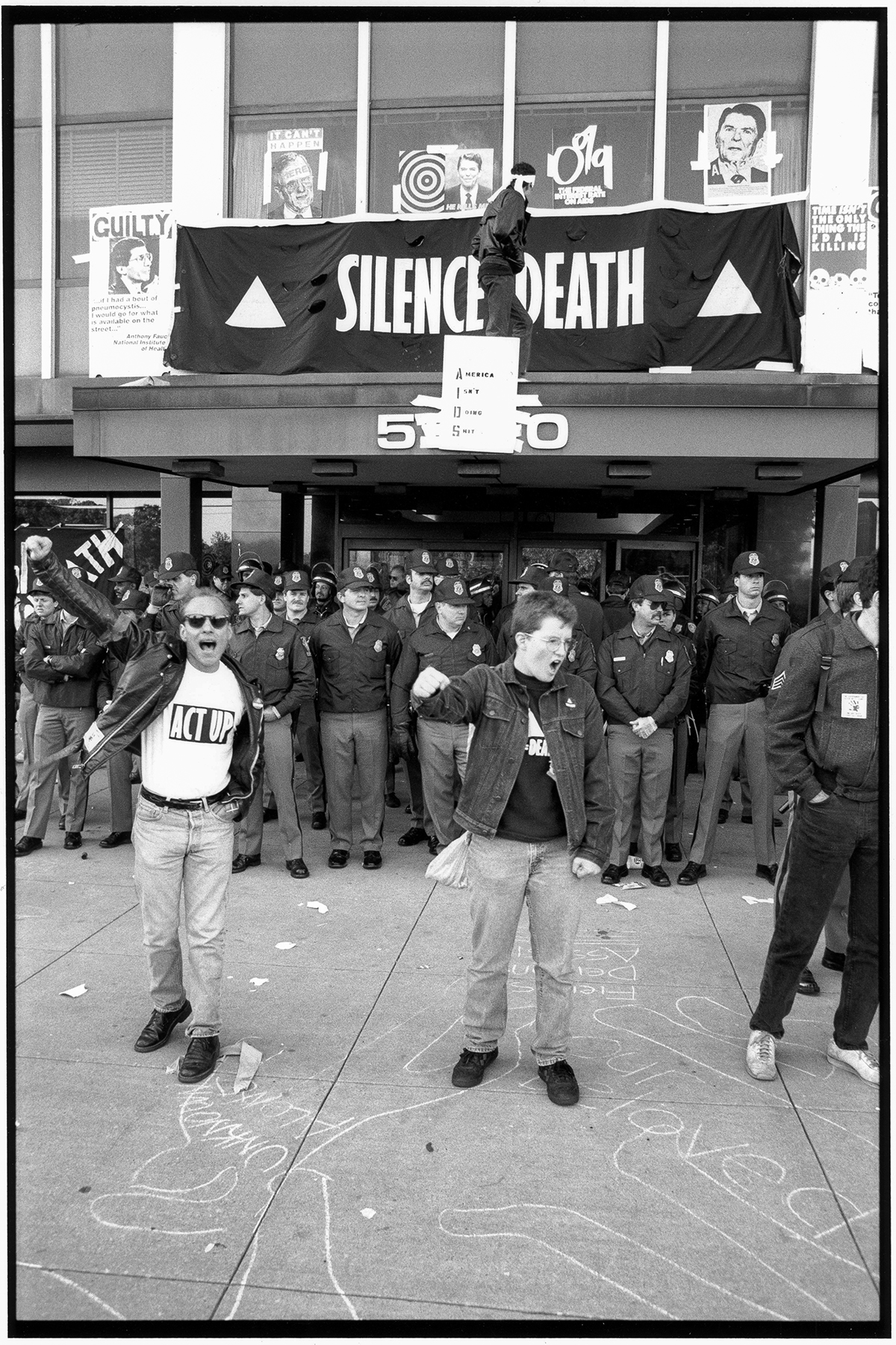 Manifestation d’ACT UP devant la Federal Drug Administration, 11 octobre 1988, Rockville (Maryland), photographie documentaire. Les militants d’ACT UP bloquent le bâtiment de la FDA afin d’exiger l’accès aux traitements expérimentaux pour les personnes vivant avec le VIH/SIDA, brandissant les slogans « Silence = Death » et « AIDS : America Is Doing Nothing ». Photographie : Peter Ansin / Getty Images.. Ses choix graphiques sont d’une grande efficacité, avec la présence d’un triangle rose inversé sur fond noir, lettres en capitales blanches. Cette simplicité radicale répond à la nécessité de percer l’espace urbain saturé de New York. Le triangle rose, symbole de la persécution nazie(1987)