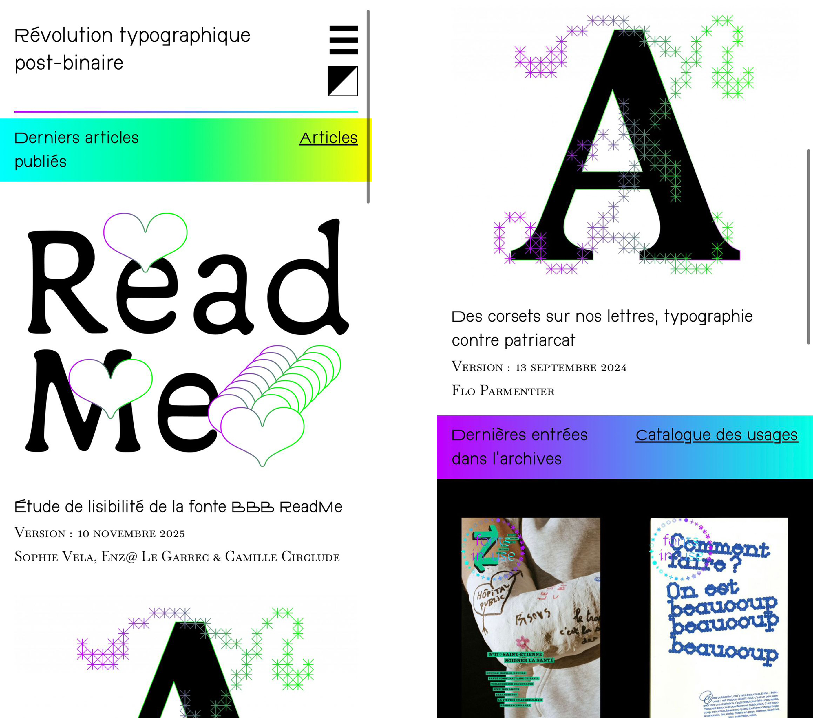 Plateforme de recherche et de partage autour de typographies inclusives, non-binaires et post-binaires, remettant en question la binarité de genre dans la langue française.