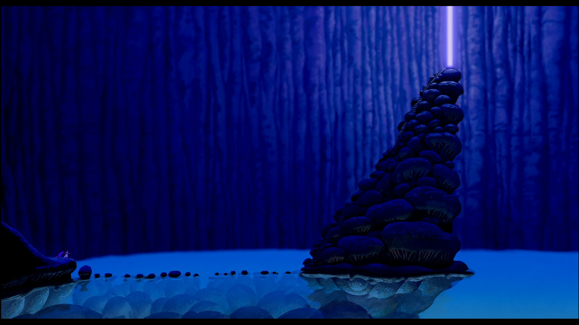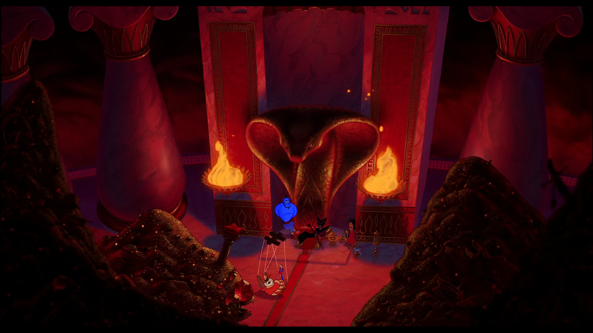 Cette logique va se retrouver également dans les décors du film. Le rouge va permettre de faire écho au sentiment de chaleur oppressante, d’un environnement aride ou maléfique. Comme endroit maléfique, nous retrouvons le repère de Jafar, la salle au trésor et plus tard dans le film la nouvelle version du royaume de Jafar. Pour les environnements arides et chauds, nous retrouvons le désert ainsi que la ville en dehors du royaume. Le bleu va permettre d’apporter de la fraîcheur, la magie et le bien. C’est pour cela qu’on en retrouve dans les endroits du désert où il y a une source d’eau. Il va aussi être utilisé pour symboliser la chambre de Jasmine, dans laquelle le bleu renvoie l’image d’un oiseau pur, irradiant de vitalité, enfermé dans une cage, ici le palace.12
