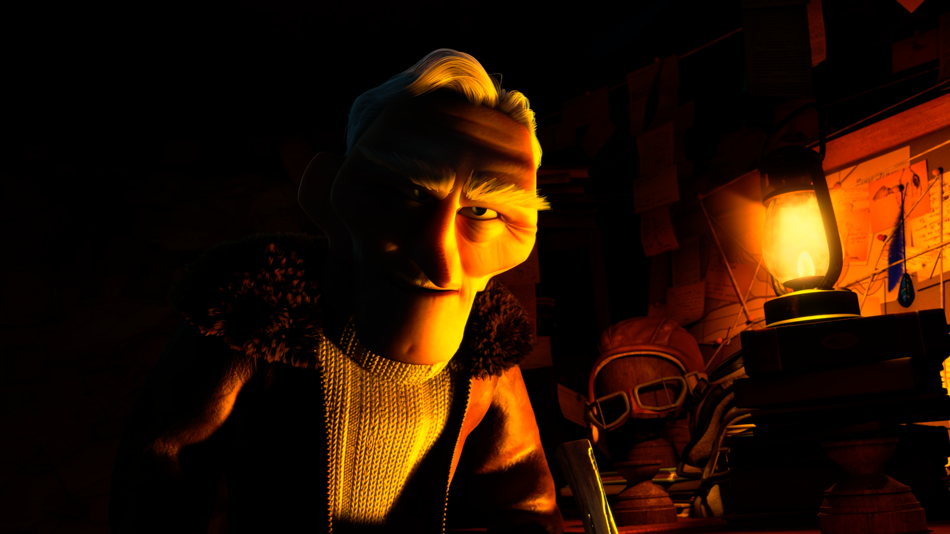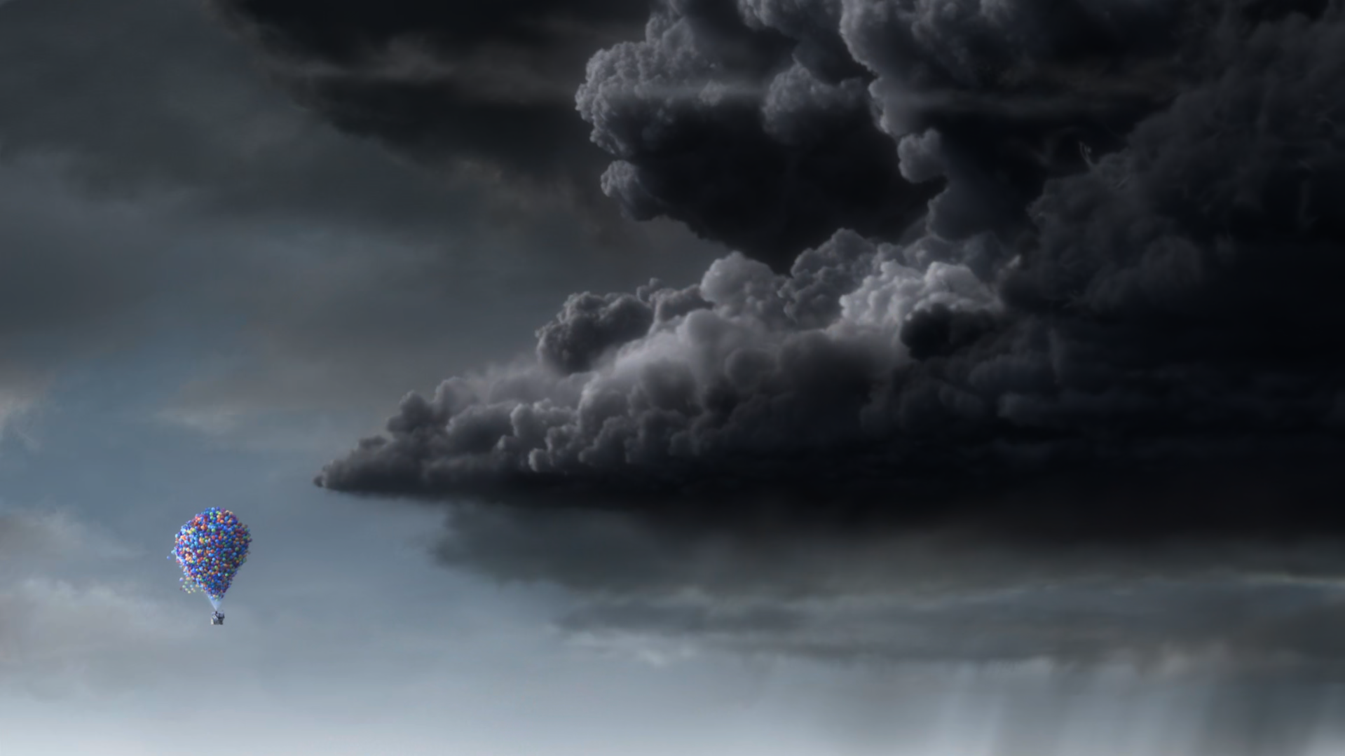 La maison de Carl aussi est intéressante à développer. Elle est petite et a une base cubique. Le toit a une forme triangulaire ce qui contraste avec la masse du cube, et élève cette maison vers le ciel d’où le titre du film. Cela permet de faire un parallèle entre le personnage de Carl et l’apparence de sa demeure. Elle est d’abord enfoncée dans le sol, puis s’envole dans les airs et paraît plus grande.18 En ce qui concerne la couleur dans les scènes, le color-script de Lou Romano permet vraiment d’identifier l’humeur des différentes scènes du film. Elles sont là pour produire un maximum d’émotions chez le spectateur. Les séquences contenant du gris, du noir, ou simplement des nuances foncées seront plus utilisées pour signifier une scène triste ou sombre. Tandis que pour les séquences joyeuses, des couleurs vives seront choisies, comme le vert, le jaune, le rose pour renforcer le sentiment chaleureux et agréable. Il y a deux scènes en particulier avec lesquelles j’aimerais conclure mon analyse. La première se déroule lorsque la maison s’envole, nous sommes émerveillés par la richesse de couleurs qu’il y a à l’écran, notamment grâce aux ballons. Puis, l’image va virer au gris quand la maison fonce tout droit dans une tempête. Cet assombrissement se fait très subtilement et marque le tournant de la scène. La menace est montrée grâce à un plan large qui met en avant la taille monstrueuse de la tempête, comparé à la petite maison sur le coin gauche. La deuxième montre le passage entre l’admiration et le danger. Carl, Russel et le chien Doug font la découverte du célèbre explorateur Charles Muntz. La lumière est plutôt douce, mais plus on avance, plus elle va jaunir au point de devenir la seule source de lumière. C’est à ce moment où ils découvrent la face cachée de l’homme. C’est grâce à une légère contre-plongée, ainsi qu’un gros plan sur la tête du vieillard que l’on comprend sa dangerosité. La couleur jaune permet de symboliser la folie chez le personnage dans la scène, en le rendant plus qu’inquiétant.