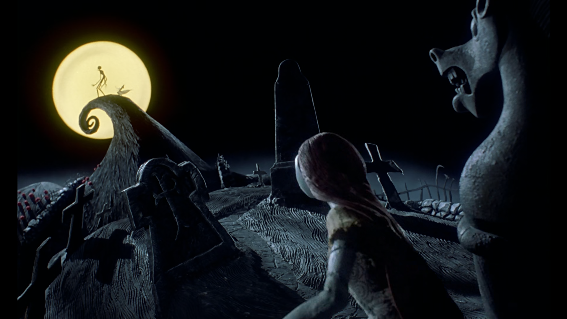 Nous allons voir comment ces codes sont utilisés par Disney pour la création du concept art. Je vais me reporter sur différents films, dont « L’Étrange Noël de Mr Jack » imaginé par Tim Burton et réalisé par Henry Selick et « Aladdin » de Ron Clements et John Musker. Si j’ai choisi ces deux films précisément, c’est parce que les codes que nous avons abordés précédemment y sont très présents, en plus d’incarner différentes techniques de film d’animation : le stop motion et l’animation 2D. Commençons avec le film de Tim Burton, sorti en 1993. Ce film est à la genèse des films d’animation de stop motion de Tim Burton. C’est lui qui a inspiré par la suite des films comme « Coraline » en 2009 ou bien « Frankenweenie » en 2012. C’est aussi l’un des seuls Disney qui raconte une histoire avec un ton sinistre. Le film raconte le quotidien de Jack Skellington, le roi d’Halloween, qui a pour rôle de trouver diverses façons d’effrayer le monde des vivants. Sauf qu’un jour, celui-ci sera lassé par sa tâche, la trouvant redondante, et décide de s’aventurer dans le monde de Noël. C’est une révélation pour lui, il va se donner comme nouvelle mission d’organiser son propre noël, tout en remplaçant le vrai.
