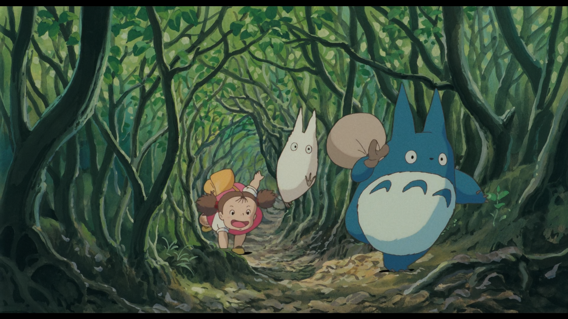 Quittons les États-Unis quelque temps pour voyager dans l’univers du cinéma d’animation japonais, avec le studio Ghibli. Je vais me servir du film de Hayao Miyazaki « Mon voisin Totoro » sorti en 1988 pour aborder le style japonais. Ce film nous replonge dans une enfance innocente, où l’imagination des enfants est sans limite, en opposition aux adultes. On suit un père et ses deux filles, l’aînée Satsuki Kusakabe et sa sœur Mei Kusakabe, qui emménagent dans une nouvelle maison. Les deux filles vont découvrir au cours du récit qu’elles sont entourées de diverses créatures fantastiques, peuplant la maison et le grand camphrier, les fameux Totoros. Ces créatures se manifestent à de rares occasions, cruciales pour le déroulement de l’histoire.