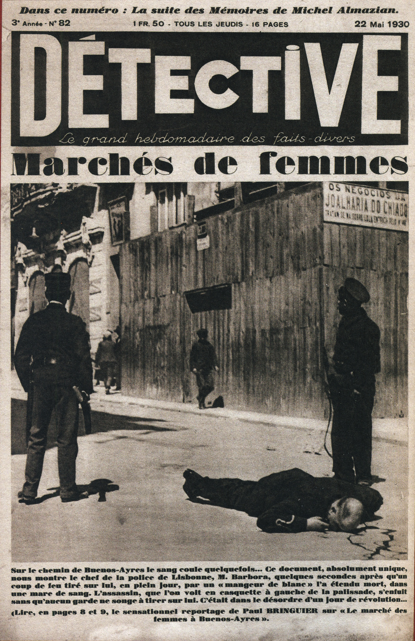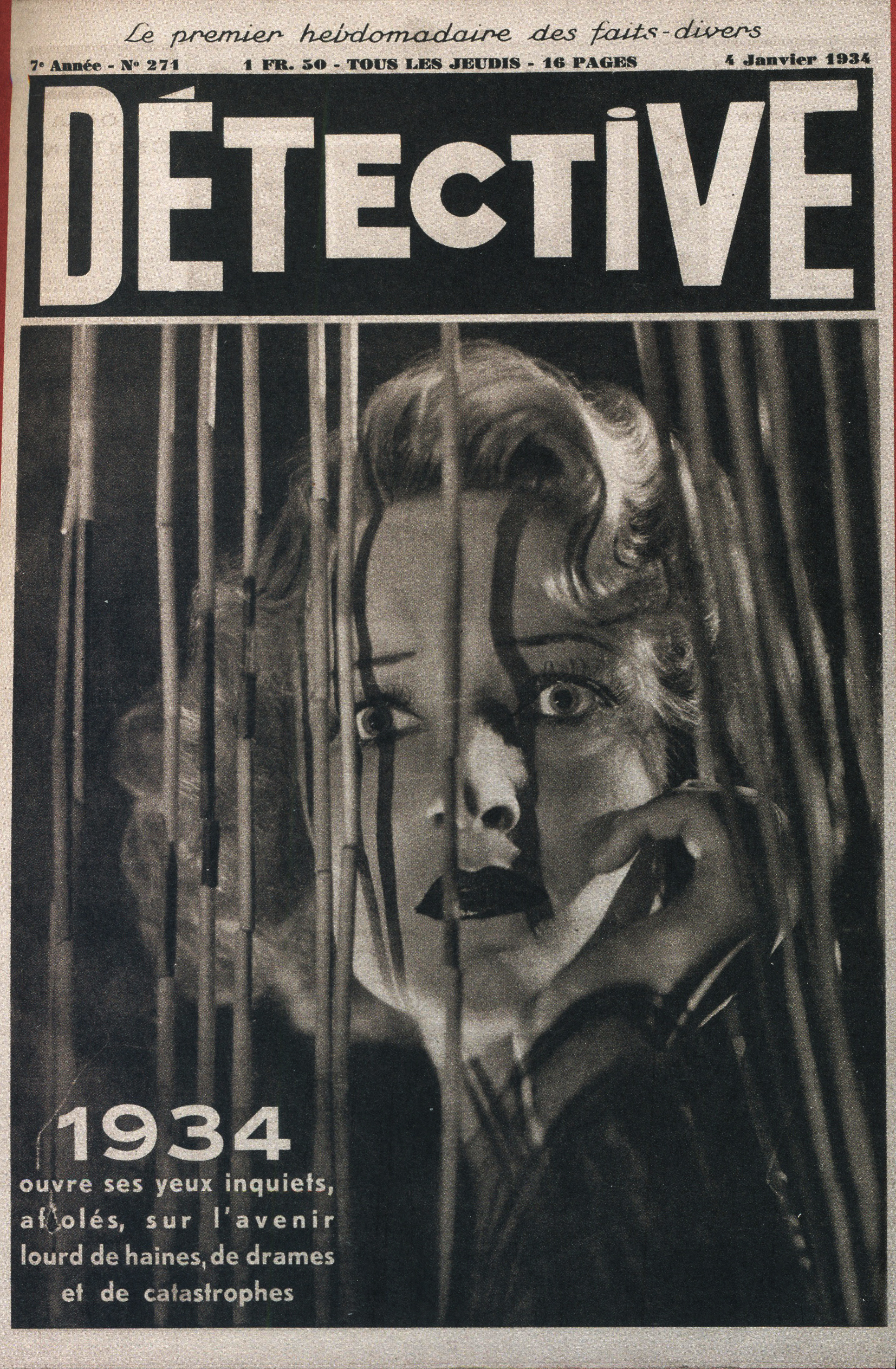 La revue Détective voit alors le jour dans un contexte singulier : la France est en plein “boom médiatique” après la Première Guerre mondiale, avec une certaine modernisation de la presse/une révolution de l’information. Première revue de France entièrement consacrée aux faits divers, elle se qualifie de “plus grand hebdomadaire des faits divers”, sous-titre de cette dernière ayant perduré durant de nombreuses années. Ainsi, elle s’inspire en premier lieu de la rubrique “Faits Divers”, de la Nouvelle Revue Française, revue littéraire et critique, lancée par Gide en 1926. Effectivement, alors que Gaston Gallimard cherche à renouveler ses publications, il s’inspire de celle-ci. Pour se faire, il fait appel aux reporters dits les frères Kessel. Ces derniers participent autant à la direction qu’à la rédaction, l’un l’autre, s’entourant d’une équipe de reporters. Avec un premier numéro sortant le 28 octobre 1928, la revue se lance alors dans un long périple éditorial dédié aux sujets lourds, mais surtout tabous, nourrissant la curiosité malsaine de ses lecteurs : sexe, drogue, crimes en tous genres, grands reportages sur le bagne, prostitution, … Des écrivains de renom aux débuts de la revue participent ainsi à la construction de l’hebdomadaire, au grand format à tonalité sépia, débordant de photographies pour l’époque, par les mots, tels que Joseph Kessel, Pierre Mac Orlan, ou encore Francis Carco. Les “faibles” faits divers des rubriques de journaux à grands tirages de l’époque, se concrétisent ainsi, et deviennent par conséquent de réels “récits d’enquêtes”, dans lesquels le lecteur devient presque lui-même détective.