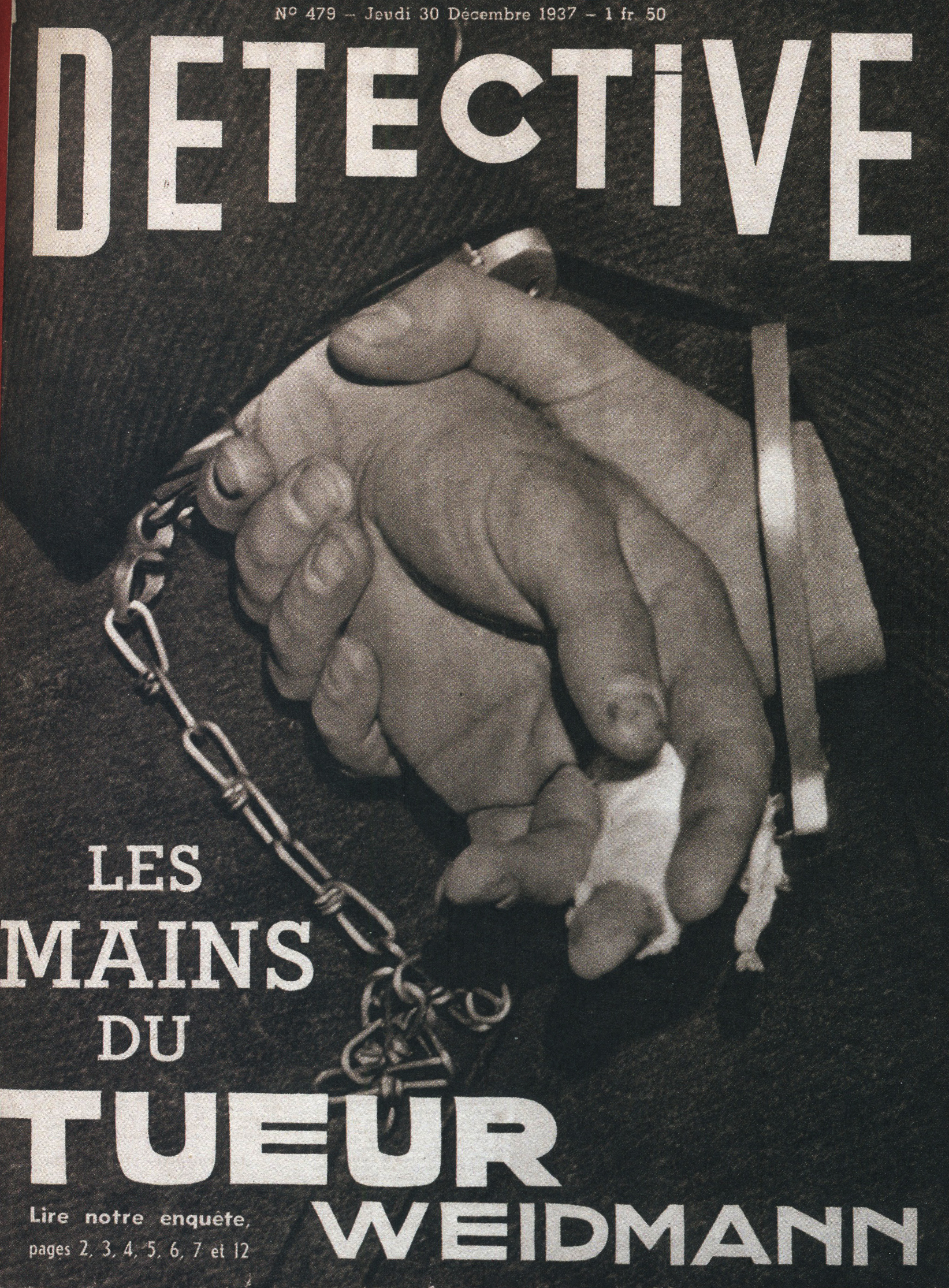 À partir de la création de la revue jusqu’en 1940, Détective construit son esthétique de première page autour de ses “images-chocs”. Évoquées précédemment, aussi qualifiées de “photos-traumatiques”, la notion se développe grâce à Roland Barthes. Ce dernier utilise cette notion afin de désigner un type d’image comme si violent qu’il en devient insignifiant. Ces photographies sont alors le point culminant, l’élément principal de la mise en page du magazine. En effet, occupant a minima la moitié de la couverture, jusqu’en 1937, pour ensuite arriver en pleine page, les images, représentatives du crime de l’époque, défilent. Ces dernières sont alors accompagnées du nom de la revue pour titre, en capitales massives, sans empattement et aux lettres étirées, agissant comme un bandeau institutionnel, qui restera jusque dans les années 1960. Avant l’arrivée des années 1940, la mise en page reste de ce fait assez simple, avec trois éléments sautant aux yeux : le nom de la revue, naturellement, le titre du numéro, “annonçant la couleur”, et une photographie. En dessous de cette dernière, un texte la sur-explicitant, témoignant l’horreur de l’époque par la relation image/texte. On retrouve alors un certain schéma dans le type de photographies relayées. Scènes de crimes aux cadavres apparents, gros plans sur des accusés, scènes de rue, présence policière, … Le fait divers se théâtralise. L’image devient un objet de consommation visuelle s’ancrant dans un système photojournalistique. C’est une forme de journalisme combinant textes et photos légendées, dans laquelle la photographie se transforme comme preuve irréfutable. C’est comme si on n’avait pas besoin de lire l’article, l’image contient le crime. Les tons sépias de l’époque, amènent alors une tension dramatique figeant les corps dans une atmosphère sombre et légèrement coloré. Dans les nombreux numéros publiés durant cette période, on observe que le fait divers principal est le meurtre. Un lexique propre à l’enquête criminelle est de ce fait employé, et les crimes ne sont plus uniquement montrés, ils se voient incarnés. La couverture ne traduit plus l’acte criminel, mais ses résonances politiques, morales et sociales. Ainsi, l’approche des années 1940 marque un premier tournant pour la revue qui décide de reprendre l’agencement et la façon de traiter les informations retransmises. En effet, les unes ont pour “mission” d’attirer le lecteur dans les kiosques à journaux, en étalant une ribambelle de titres chocs. Optant pour, comme évoqué précédemment, des images en pleine page, la revue amène du titrage secondaire, au contenu dramatique, procédant comme des blocs graphiques. Ils se superposent à l’image, contrairement à l’ancienne mise en page qui faisait effet d’“encadrement judiciaire”, venant toujours poser ses titres et accroches autour de l’image. Différentes polices de caractères sont employées. Sans empattements, avec, cursives, et même gothiques pour certaines unes sur la Seconde Guerre mondiale, Détective s’essaye à la multiplication de polices sur une même couverture. Alors, le contexte de l’époque se fait ressentir sur le choix graphique des couvertures de la revue. En effet, bien que les locaux de cette dernière aient été saisis par l’armée allemande en mai 1940, quelques numéros sont publiés, dont certains sont entièrement dédiés aux crimes de guerre commis par la gestapo. La médiatisation du crime était devenue matérielle narrative et idéologique. La propagande nazie façonnant les codes graphiques et médiatiques de la presse de masse de l’époque.