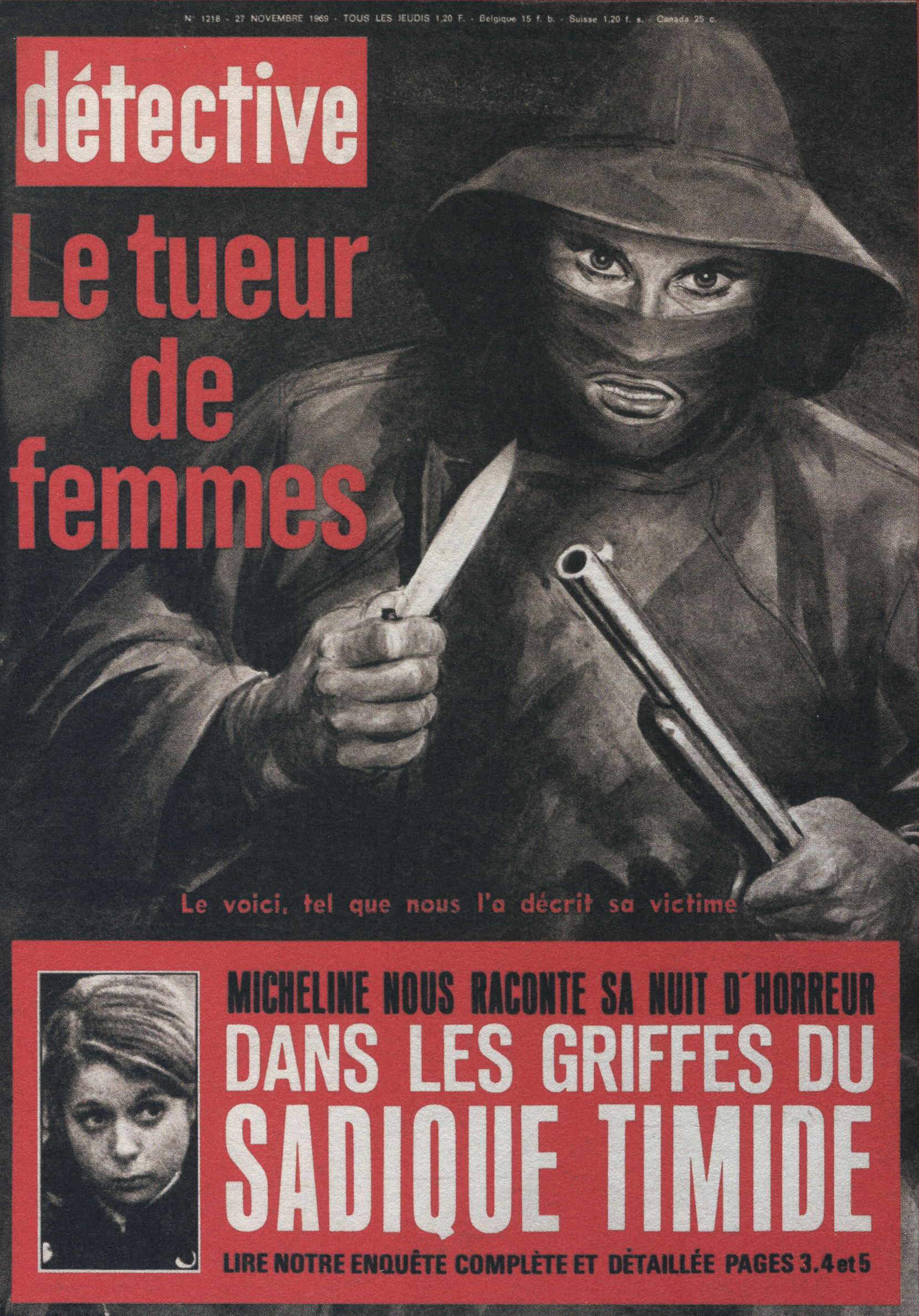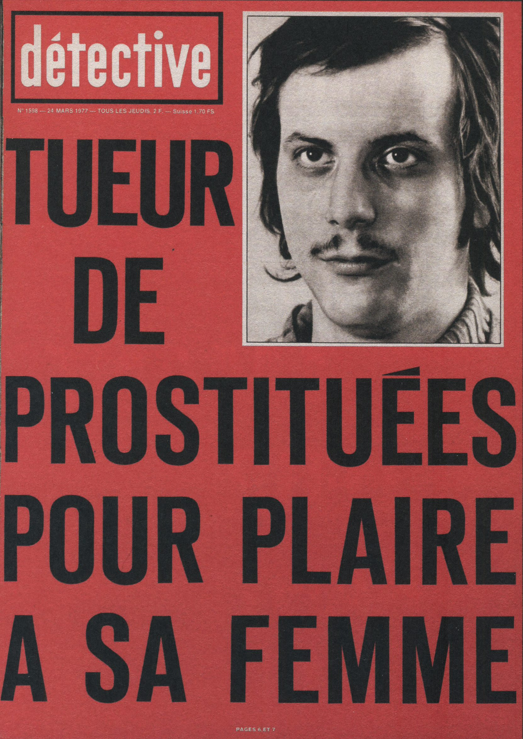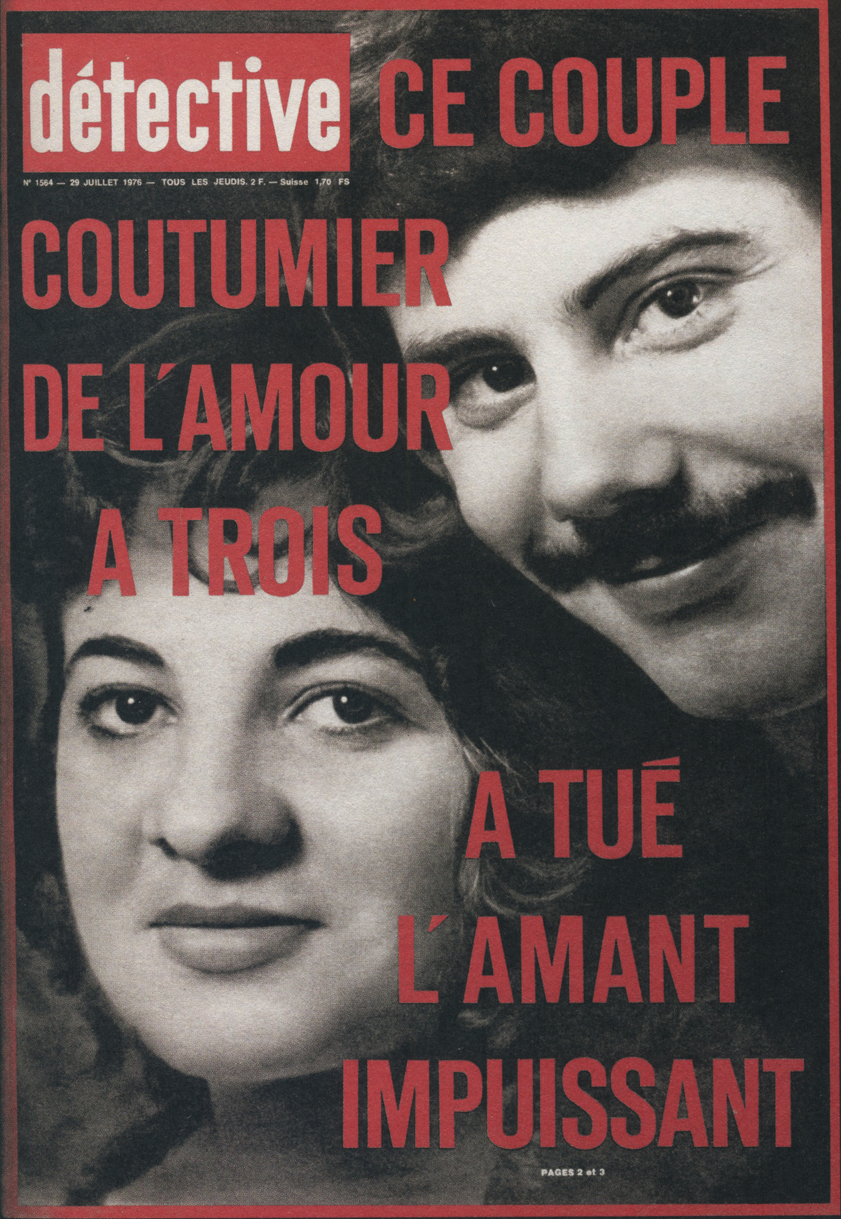 Ainsi, le titre a été racheté par les éditions Beyler. Après 1946, une nouvelle identité visuelle prend la couverture. Le nom change aussi. On passe de “Détective” à “Qui ? Détective”, jusqu’en 1958. Les anciens tons sépias disparaissent pour donner place à des couvertures noires et blanches. Ainsi, la guerre constitue un grand changement au niveau de la représentation criminelle au sein de la société. En effet, les horreurs de cette dernière, ayant exposé les français à des images d’une violence inédite (camps, ruines, morts de masse,…), le crime individuel paraît presque mineur face à un génocide. Ainsi, le fait divers n’est plus l’horreur suprême, et le crime ne peut plus être montré, ni pensé, de la même manière. Alors progressivement, on assiste à une disparition des cadavres visibles en couverture. Ne pouvant plus miser uniquement sur le choc, moins de scènes de crime sont explicitées, et le photojournalisme devient plus suggestif que démonstratif : reconstitutions photographiques, images prises après coup, photographies d’objets, de lieux vides, de traces, … Le crime est traduit par indices, reprenant les codes de l’enquête. Ainsi, la violence du fait divers est moins frontale. En 1958, le bandeau de titrage finit alors lui aussi par disparaître, pour faire revenir le nom d’origine de la revue, et finir en simple cartouche, en coin supérieur gauche de la page. Même police de caractère, mais cette fois-ci toute en minuscule, Détective accueille une deuxième couleur qu’il ne quittera plus : le rouge. Utilisée seulement pour des éléments de titrage, jamais dans ses photographies, elle devient une couleur de substitut au choc photographique des années sépias. S’inscrivant d’abord dans l’évolution des techniques d’impression de l’après-guerre, généralisant l’impression en bichromie ou trichromie, moins coûteuse et plus stable, le rouge est immédiatement perceptible. Captant l’œil à distance, hiérarchisant la page, le rouge n’informe pas, il signale. Le crime annoncé visuellement, on assiste alors à un réel appel au regard dans l’espace saturé des kiosques. Commence, de ce fait, à pointer le bout de son nez, les “crimes passionnels”, atteignant réellement leur pic de popularité durant les années 1970 – 1980. Jalousie, amour, drame conjugal, … les sujets intéressent d’autant plus, et circulent dans le climat du crime, approfondissant l’aspect psychologique (mobiles, troubles, enfance, caractère) des horreurs énoncées. Alors défilent une longue série de portraits, que ce soit de victimes ou de tortionnaires. Des cadrages cinématographiques au compositions plus aérées, la sans sérif finit par dominer la une, et les titres secondaires s’amoindrissent, eux aussi, peu à peu.