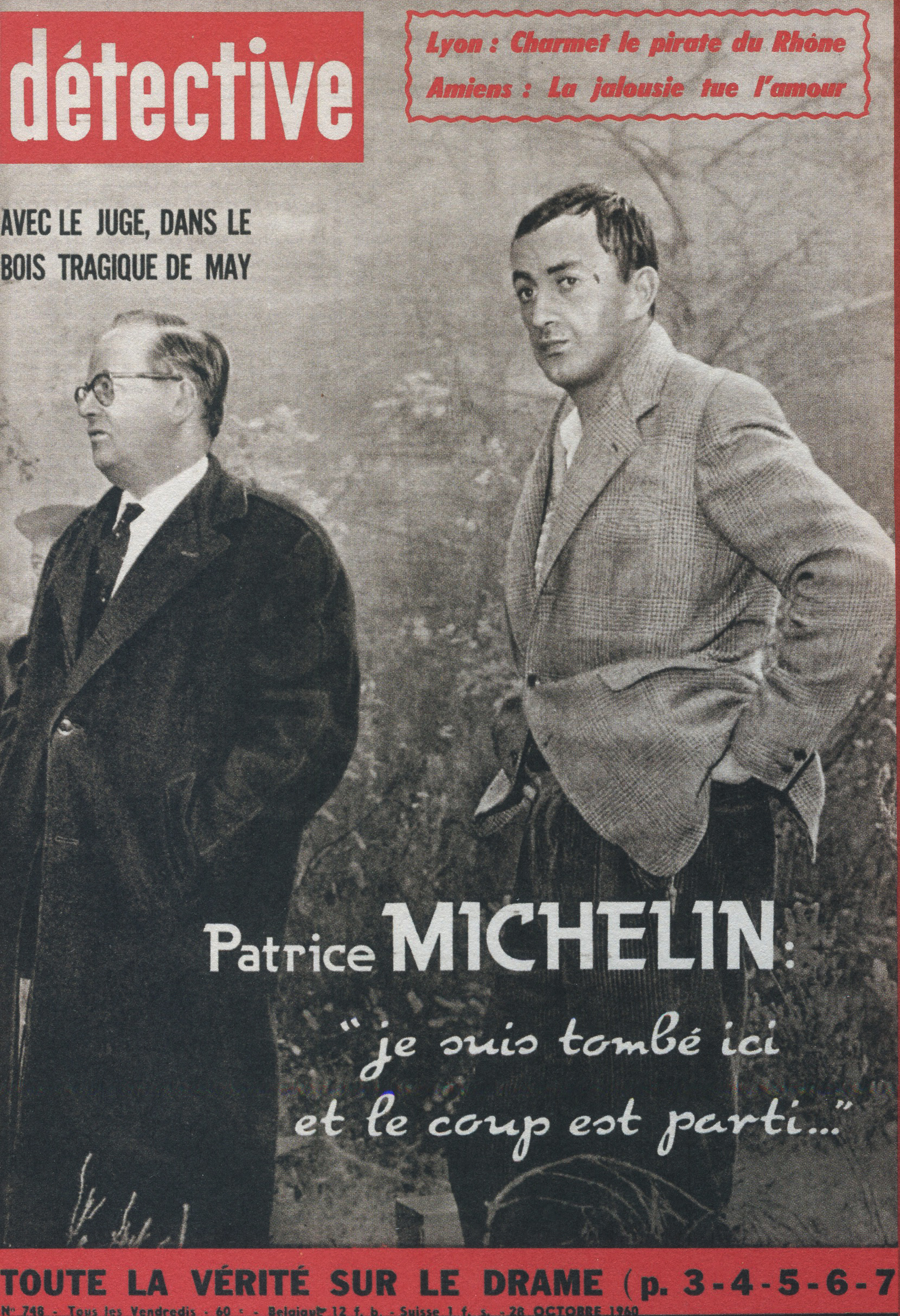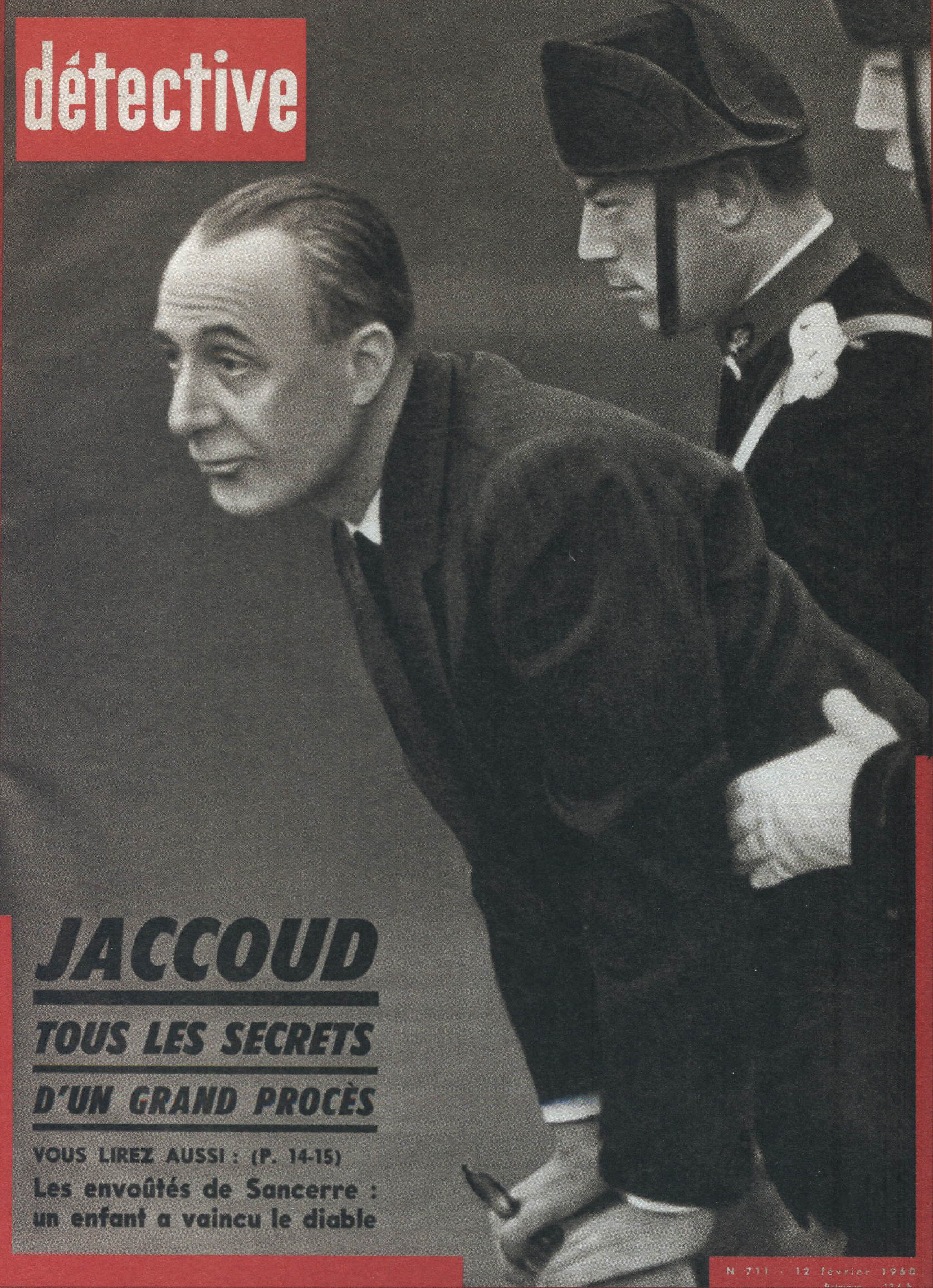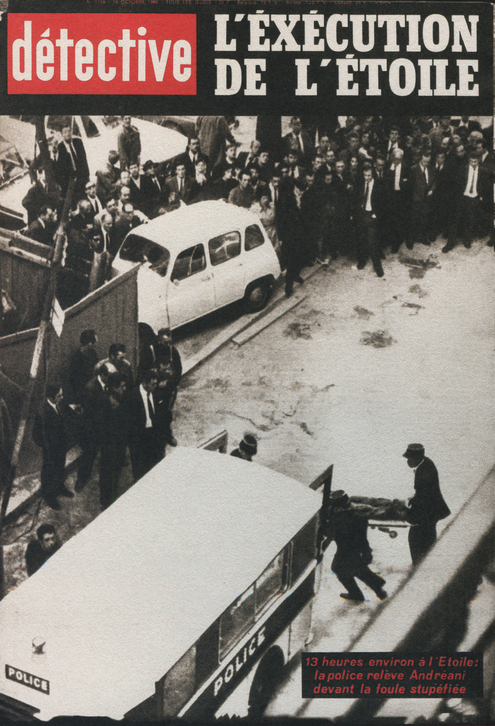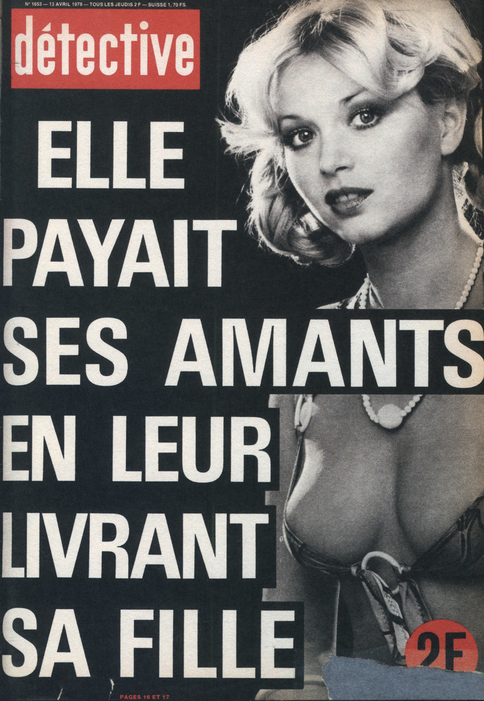 Ainsi, le titre a été racheté par les éditions Beyler. Après 1946, une nouvelle identité visuelle prend la couverture. Le nom change aussi. On passe de “Détective” à “Qui ? Détective”, jusqu’en 1958. Les anciens tons sépias disparaissent pour donner place à des couvertures noires et blanches. Ainsi, la guerre constitue un grand changement au niveau de la représentation criminelle au sein de la société. En effet, les horreurs de cette dernière, ayant exposé les français à des images d’une violence inédite (camps, ruines, morts de masse,…), le crime individuel paraît presque mineur face à un génocide. Ainsi, le fait divers n’est plus l’horreur suprême, et le crime ne peut plus être montré, ni pensé, de la même manière. Alors progressivement, on assiste à une disparition des cadavres visibles en couverture. Ne pouvant plus miser uniquement sur le choc, moins de scènes de crime sont explicitées, et le photojournalisme devient plus suggestif que démonstratif : reconstitutions photographiques, images prises après coup, photographies d’objets, de lieux vides, de traces, … Le crime est traduit par indices, reprenant les codes de l’enquête. Ainsi, la violence du fait divers est moins frontale. En 1958, le bandeau de titrage finit alors lui aussi par disparaître, pour faire revenir le nom d’origine de la revue, et finir en simple cartouche, en coin supérieur gauche de la page. Même police de caractère, mais cette fois-ci toute en minuscule, Détective accueille une deuxième couleur qu’il ne quittera plus : le rouge. Utilisée seulement pour des éléments de titrage, jamais dans ses photographies, elle devient une couleur de substitut au choc photographique des années sépias. S’inscrivant d’abord dans l’évolution des techniques d’impression de l’après-guerre, généralisant l’impression en bichromie ou trichromie, moins coûteuse et plus stable, le rouge est immédiatement perceptible. Captant l’œil à distance, hiérarchisant la page, le rouge n’informe pas, il signale. Le crime annoncé visuellement, on assiste alors à un réel appel au regard dans l’espace saturé des kiosques. Commence, de ce fait, à pointer le bout de son nez, les “crimes passionnels”, atteignant réellement leur pic de popularité durant les années 1970 – 1980. Jalousie, amour, drame conjugal, … les sujets intéressent d’autant plus, et circulent dans le climat du crime, approfondissant l’aspect psychologique (mobiles, troubles, enfance, caractère) des horreurs énoncées. Alors défilent une longue série de portraits, que ce soit de victimes ou de tortionnaires. Des cadrages cinématographiques au compositions plus aérées, la sans sérif finit par dominer la une, et les titres secondaires s’amoindrissent, eux aussi, peu à peu.