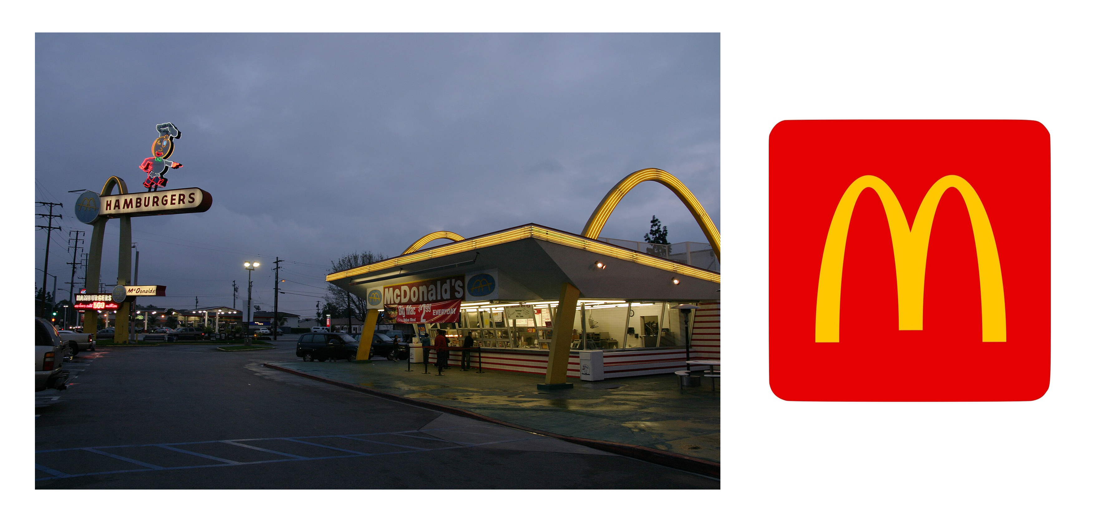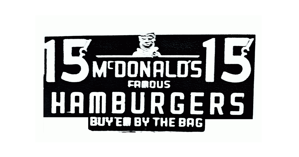 Quelques années plus tard, McDonald’s deviendra la référence absolue du design graphique dans les chaînes de fast-food, en développant une identité aujourd’hui instantanément reconnaissable. Si aujourd’hui McDonald’s est l’une, si ce n’est la chaîne de fast-food la plus populaire au monde, c’est en partie grâce à son identité visuelle qui est restée quasiment intacte depuis 1960. Depuis son origine et jusque dans les années 1960, le logo du restaurant a évolué trois fois. Dans un premier temps, fondé sur un concept de barbecue, le restaurant s’appelait « McDonald’s Famous Barbecue » et le logo employait trois polices de caractères différentes, une serif italique pour la partie supérieure, une sans-serif en majuscule au centre, et une serif robuste pour la partie inférieure annonçant le mot « Barbecue ». Au travers de ce mélange typographique, la marque renvoyait une image à la fois élégante et traditionnelle, tout en ayant un aspect strict et solide. Au fil des années, les hamburgers sont devenus de plus en plus populaires aux États-Unis, remplaçant ainsi le concept de barbecue. Par la suite, le titre du restaurant a été modifié en « McDonald’s Famous Hamburgers » et le logo a changé pour une plaque signalétique blanche sur fond noir, utilisant une police de caractère sans serif, avec une image blanche du chef souriant. Le résultat renvoie une image beaucoup plus industrielle et moins attirante qu’à l’origine.