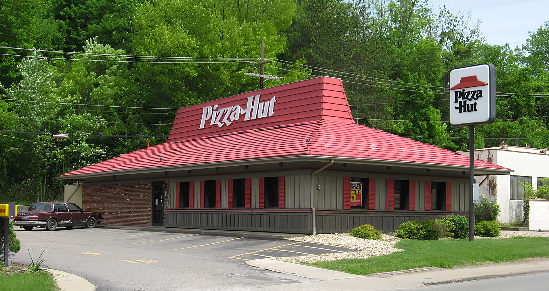 Un autre exemple emblématique de chaîne de restauration rapide, est Pizza Hut, comme son nom l’indique, une chaîne spécialisée dans la préparation et la livraison de pizzas. Historiquement, depuis la création de la chaîne en 1958, son nom n’a pas changé et est resté lié au mot-symbole : « Pizza Hut », qui renvoie à l’idée des deux étudiants fondateurs, Frank et Dan Carney, d’ouvrir un kiosque à pizza. Son logo suit le même schéma, en reprenant aussi ce mot-symbole, et en subissant que très peu de modifications au fil des années. Pendant les dix-sept premières années, le logo est uniquement typographique, passant d’une composition avec des lettres majuscules utilisant une police serif présentant des terminaisons et des sommets anguleux (notamment sur les lettres A, T et Z), de couleur rouge écarlate et non-alignées sur un même axe horizontal, donnant une touche ludique, à une composition noire sur deux niveaux, conservant un décalage sur certaines lettres. Par la suite et jusqu’aujourd’hui, l’entreprise à garder cette structure en deux niveaux, avec « Pizza » écrit au-dessus de « Hut » mais en rajoutant un chapeau rouge au-dessus, reprenant la conception du toit des bâtiments originaux, conçu par Richard D. Burke en 1969, évoquant le toit d’une hutte et symbolisant la protection et la sécurité.
