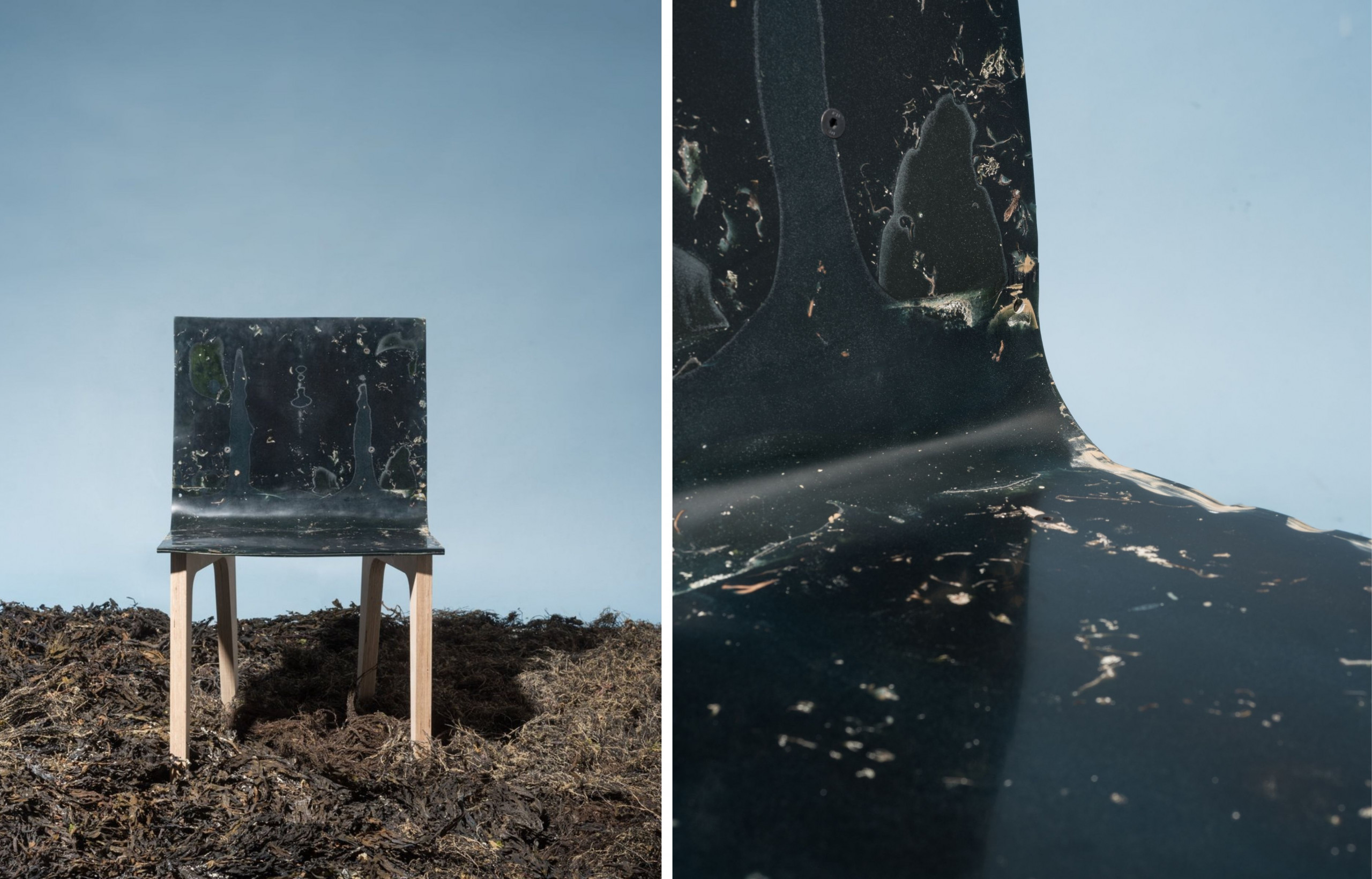 L’algue permet d’avoir diverses textures et différentes couleurs. Les matériaux tirés de cette dernière peuvent prendre une apparence de carton, des teintes de marron, de vert, émeraude et fluorescentes. À partir de ce nouveau matériau créé à base d’algues, Samuel Tomatis a développé une chaise13. Cette dernière montre les qualités esthétiques et mécaniques des algues dont il exploite ses propriétés. Chaque variété joue un rôle spécifique dans la structure de ce matériau. Par exemple, les fibres de l’algue viennent remplacer les fibres de verre. Il démontre ainsi qu’il est possible d’utiliser les algues à échelle industrielle.