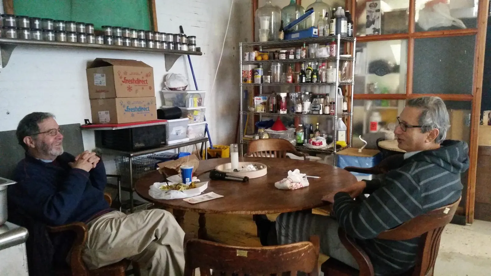 Larry Melnick (à gauche)et Andy Berks discutent pendant le déjeuner dans la cuisine commune du biolab communautaire Genspace basé à Brooklyn. – Ellen Jorgensen