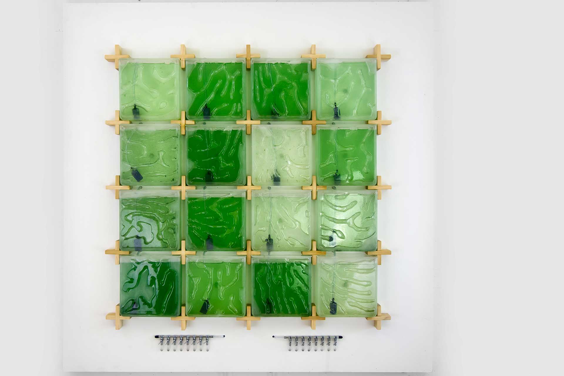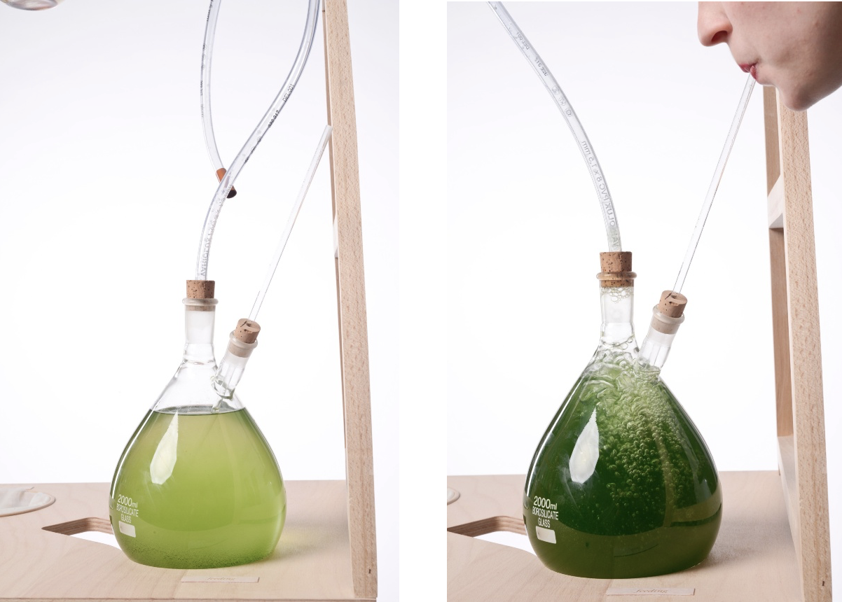A présent nous allons nous intéresser au projet The Coral14 de An Hyun-Seok. A travers ce projet il propose aux foyers du futur de cultiver, récolter et consommer des algues au quotidien. Ce projet est présenté comme une culture murale de micro-algues incrustée dans des pavés de verre qui permettraient de visualiser la croissance de la culture. Chaque carreau abrite un petit volume d’eau, du sel, des nutriments et des micro-algues, ces dernières se développent progressivement, transformant la lumière, le CO2 et les nutriments en biomasse comestible. À mesure de la croissance, les cellules changent de couleur : de transparentes elles deviennent vert sombre, signalant que les micro-algues sont prêtes à être récoltées. De ce fait, en plus d’être écologique, cette installation a une vision esthétique par sa forme de mosaïque et ses différentes teintes.