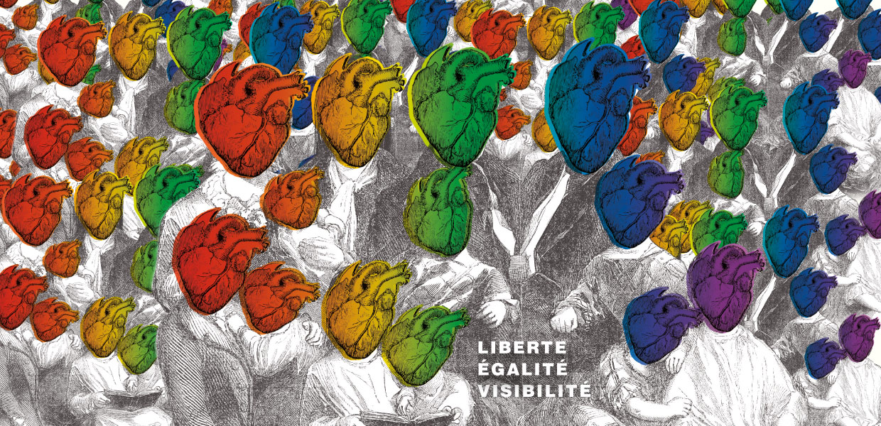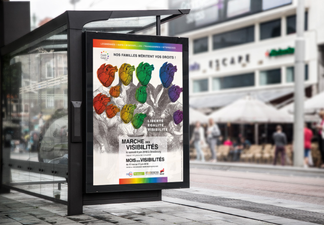 Marche des visibilités, 2018, affiche créée par le studio D’ailleurs pour le collectif organisateur de la Marche. L’identité visuelle questionne la notion de « famille traditionnelle » à travers les symboles rainbow LGBT+. illustre cette problématique. Conçu pour l’espace public institutionnel, leur esthétique, fondée sur la chaleur humaine et la déconstruction de la “famille” traditionnelle, privilégie une lisibilité grand public au détriment de la radicalité formelle historique du design queer. Les visuels, bien qu’ils mettent en scène l’égalité et la pluralité des configurations familiales adoptent des codes graphiques consensuels, appropriés pour tout le monde, qui s’éloignent de l’esthétique brute, transgressive et contre-culturelle des origines. Cette normalisation visuelle révèle comment les institutions peuvent diluer la charge subversive du design queer pour le rendre acceptable au plus grand nombre.