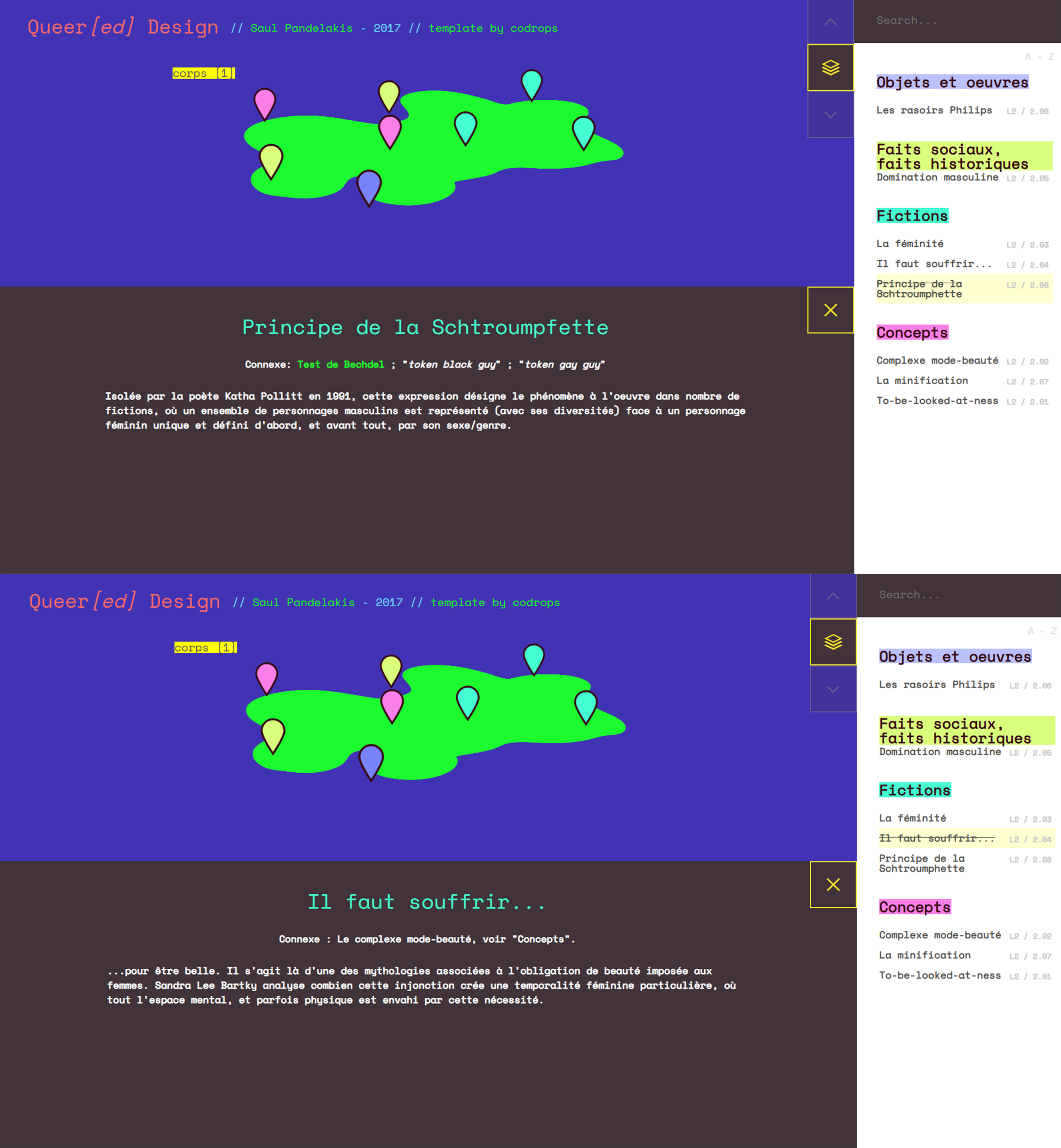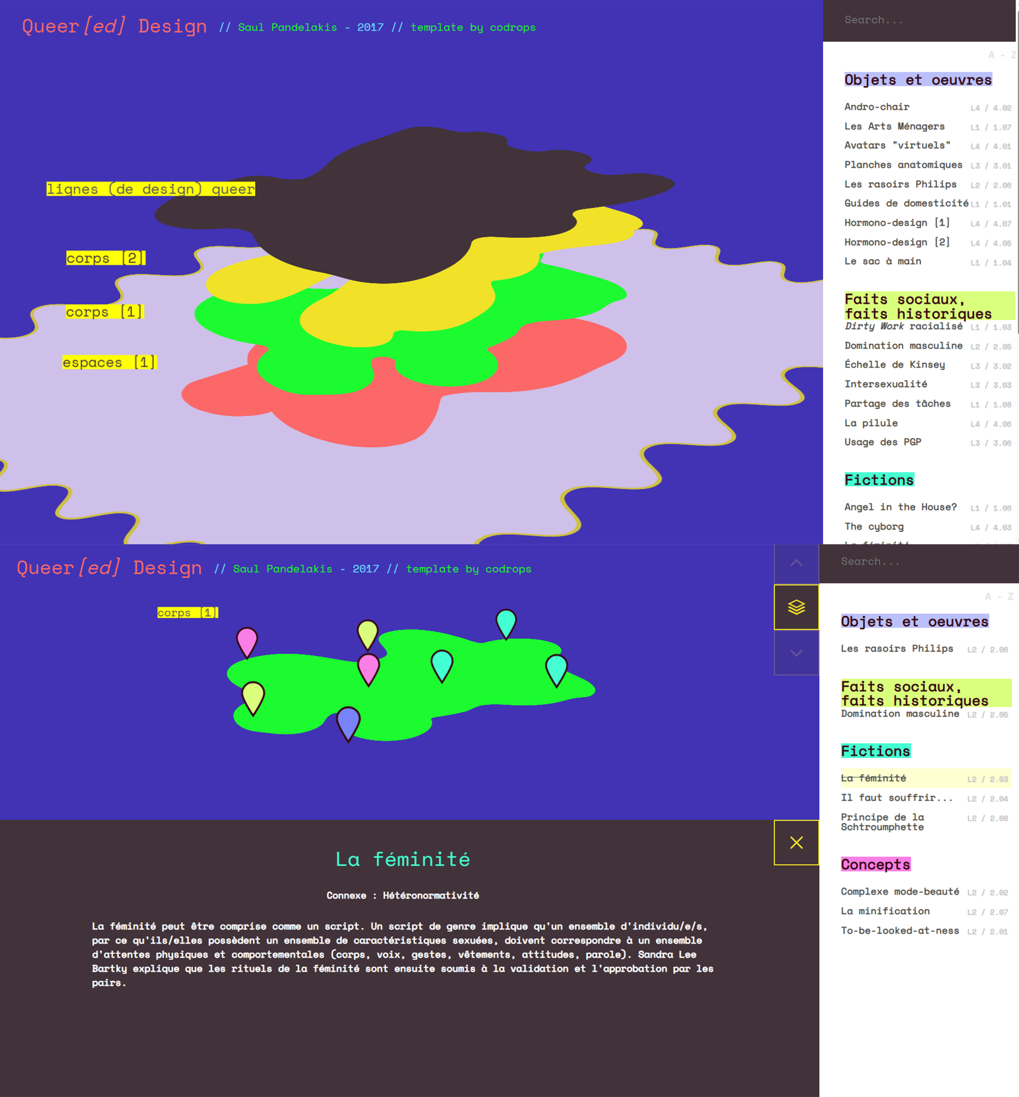Visuellement, le site incarne cette volonté de déconstruction dès la page d’accueil. Le contenu principal se déploie comme une cartographie interactive. Il se trouve plusieurs strates organiques aux contours irréguliers se superposent, fonctionnant comme des territoires thématiques. Sur ces surfaces sont disposées des “pins” de localisation colorés, chacun renvoyant à une définition ou un concept théorique. Cette métaphore cartographique transforme le savoir en territoire à explorer. L’utilisateur navigue entre les couches conceptuelles comme on parcourait une géographie des savoirs queer. Le design devient ainsi performatif, pratiquant la déconstruction qu’il théorise en refusant la hiérarchie linéaire traditionnelle du site web au profit d’une exploration spatiale et tactile.