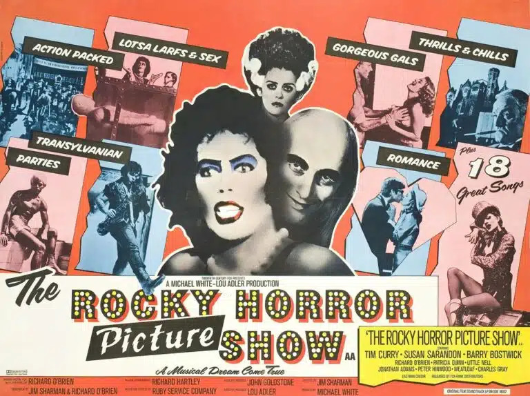 En parallèle, il y a l’affiche du film The Rocky Horror Picture Show de 1975. Son style visuel est volontairement kitsch, exagéré et provocant, et on le voit bien dans ses affiches. Elles mélangent des images découpées, utilisent des couleurs qui claquent, et ont des polices d’écriture particulières. Tout ça, c’est une façon de rejeter les règles classiques du design graphique, et cela rappelle le théâtre et le spectacle. Comme FILE, The Rocky Horror Picture Show transforme le visuel en acte de résistance, en détournant les conventions, il offre une version alternative des corps, des genres et du désir, participant à l’élaboration d’un graphisme queer, conscient et militant.