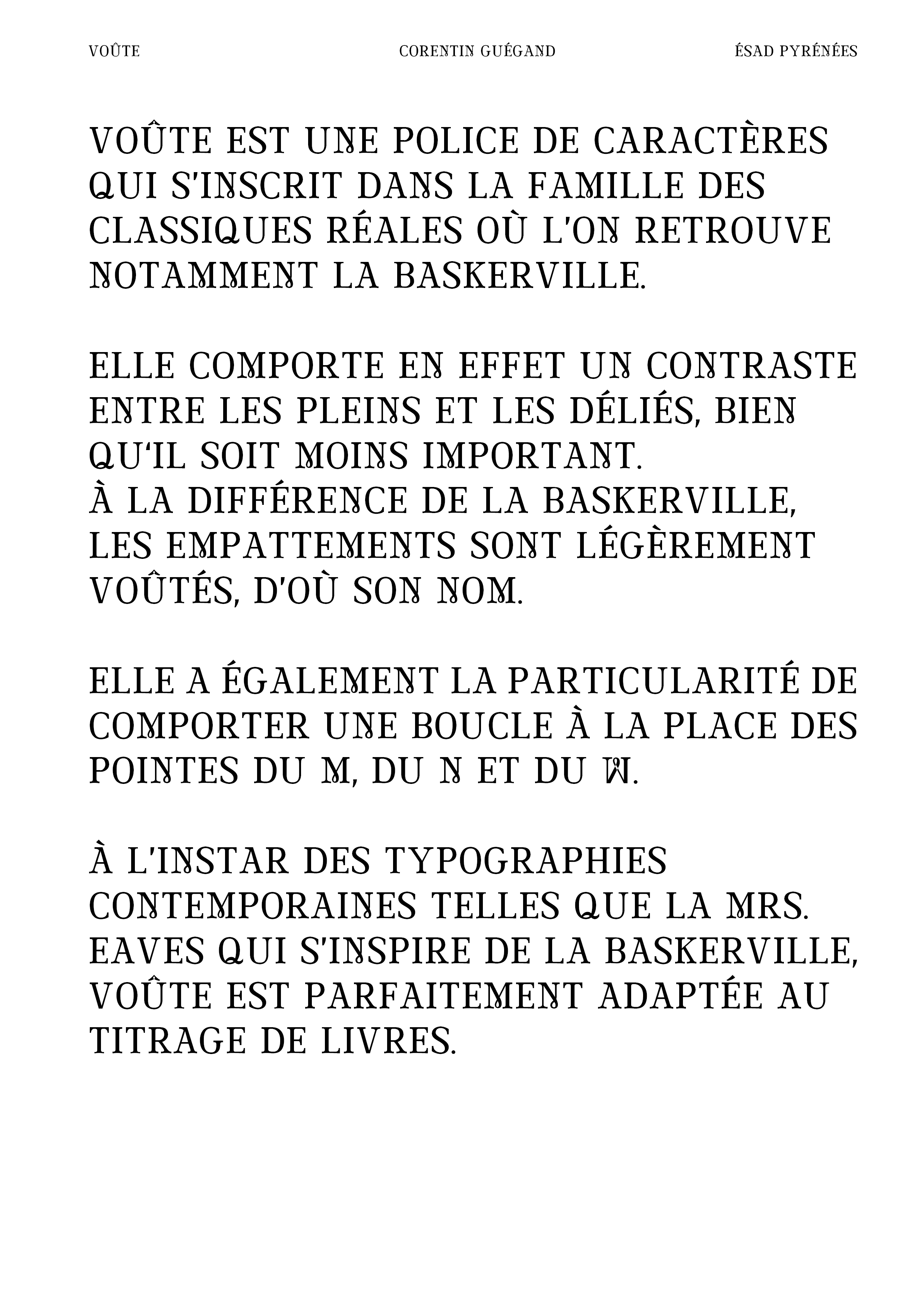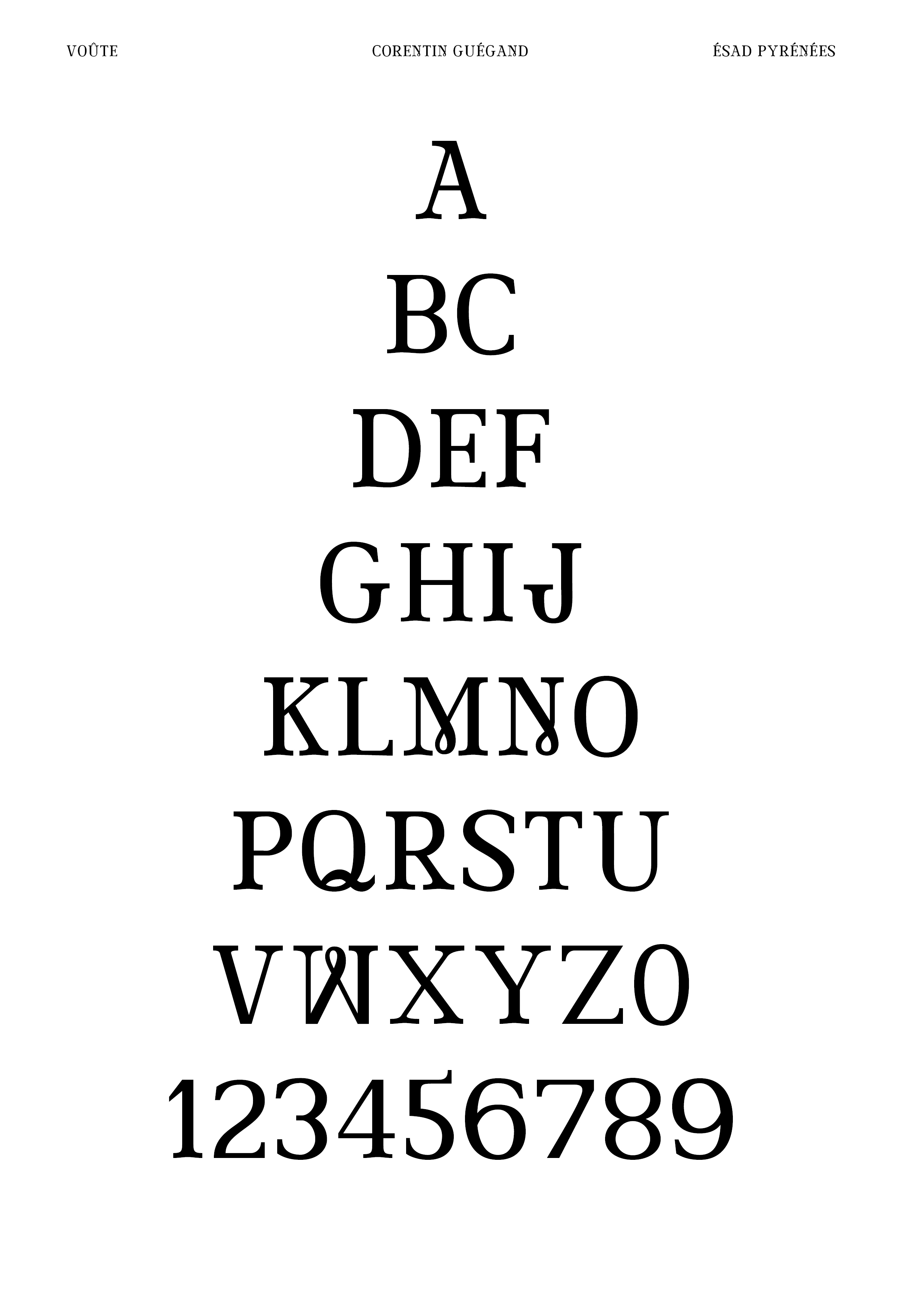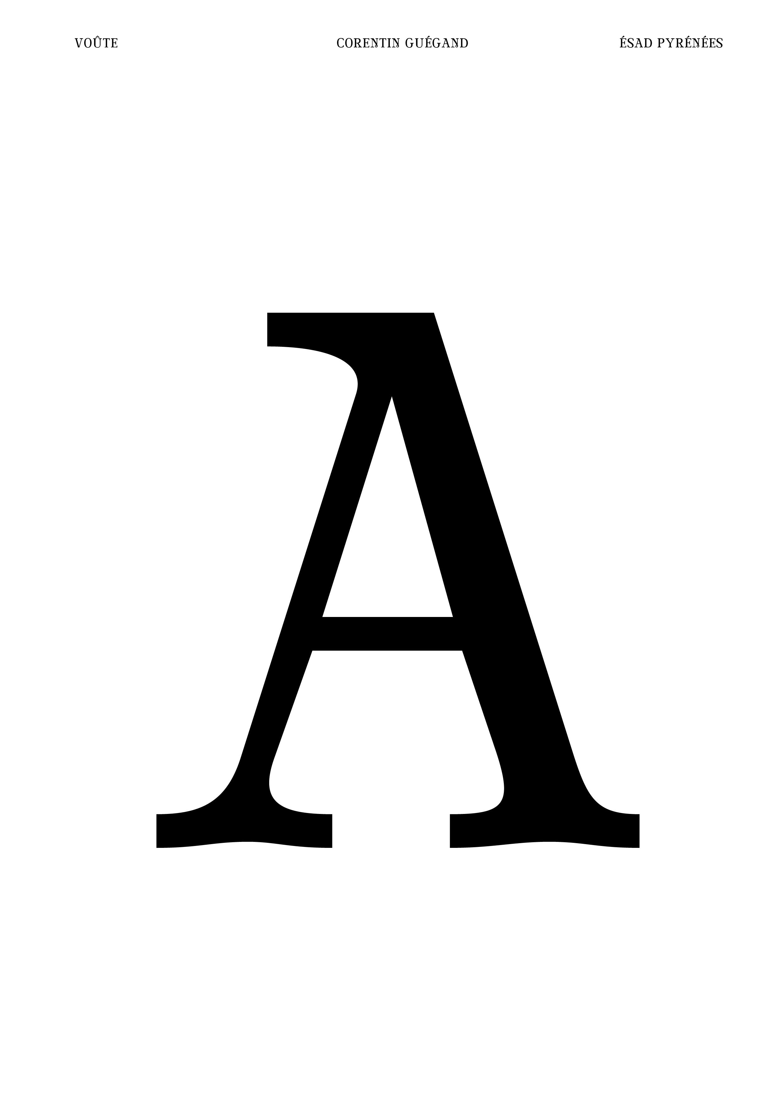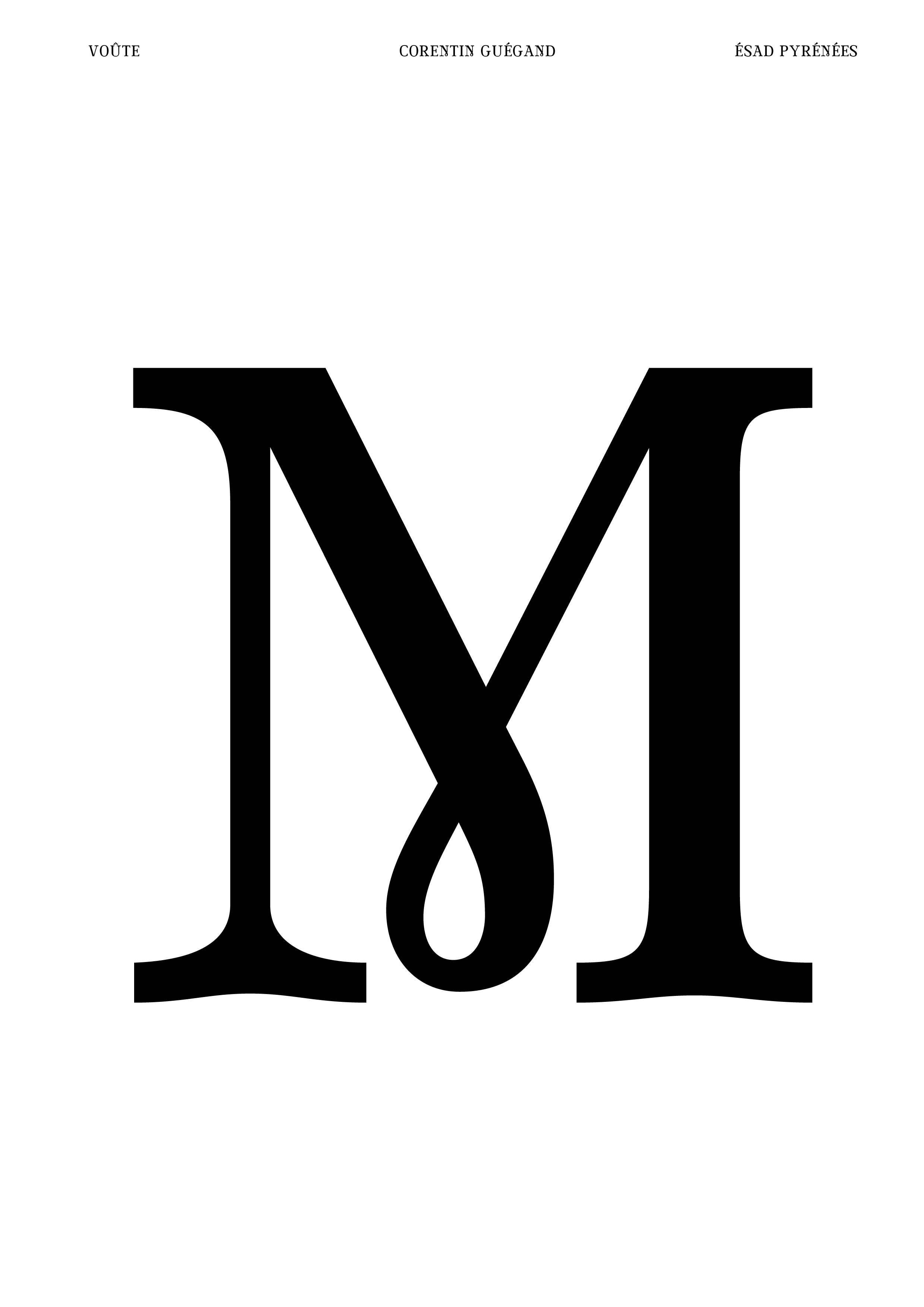 Réalisation d’une police de caractères (chiffres, signes et majuscules) à partir d’un lettrage. À partir de cinq lettres, j’ai dû composer l’ensemble de la police de caractères (majuscules, chiffres et signes) en conservant les caractéristiques du lettrage original : empattements légèrement voûtés, boucle à la pointe du M, contraste des graisses ... Je les ai ensuite vectorisés sur Glyphs afin de pouvoir utiliser Voûte (nom de ma fonte) sur l’ordinateur. Enfin, j’ai produit sur Indesign un spécimen permettant de valoriser la qualité de ma police de caractères, en particulier dans le titrage de livres.