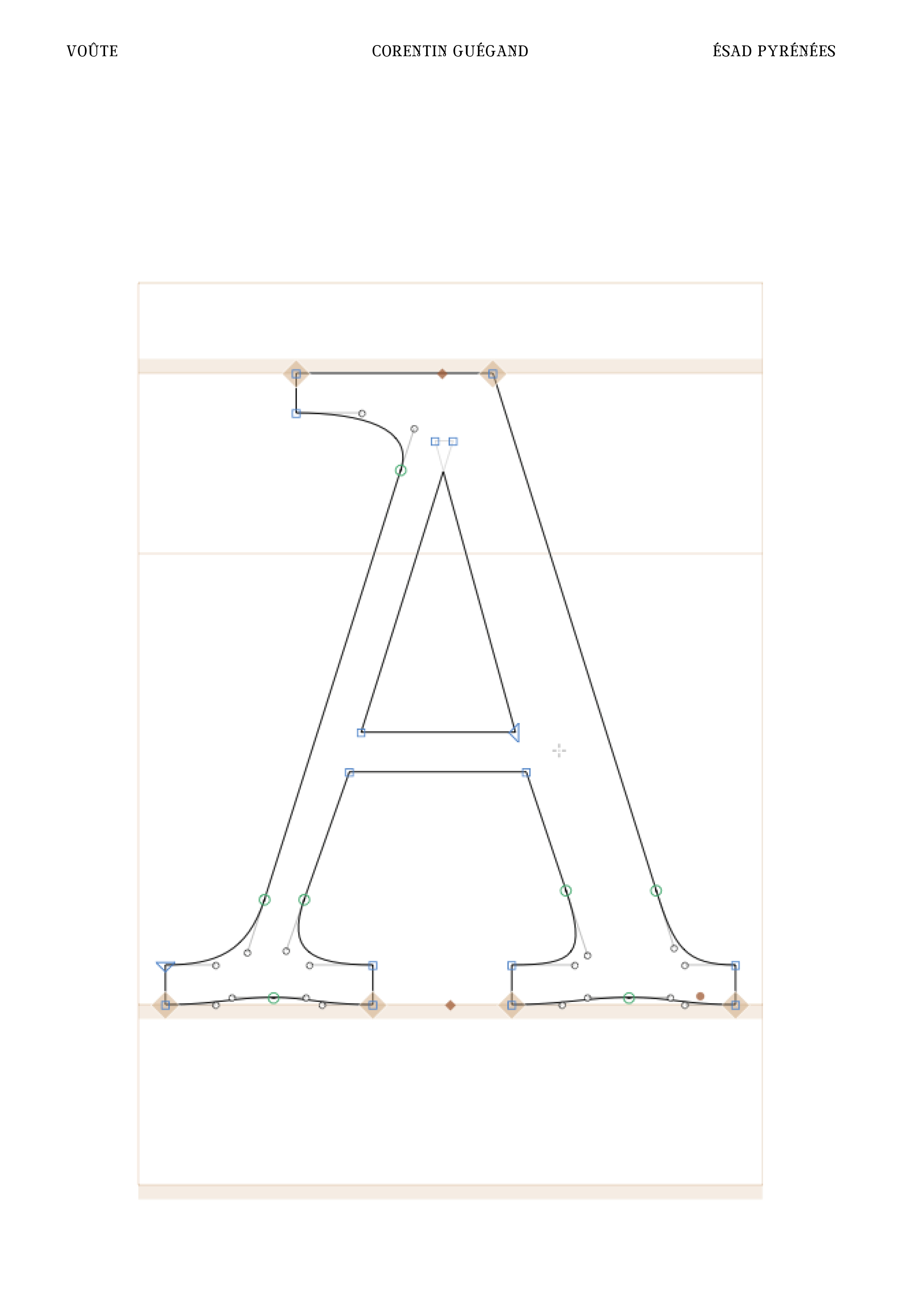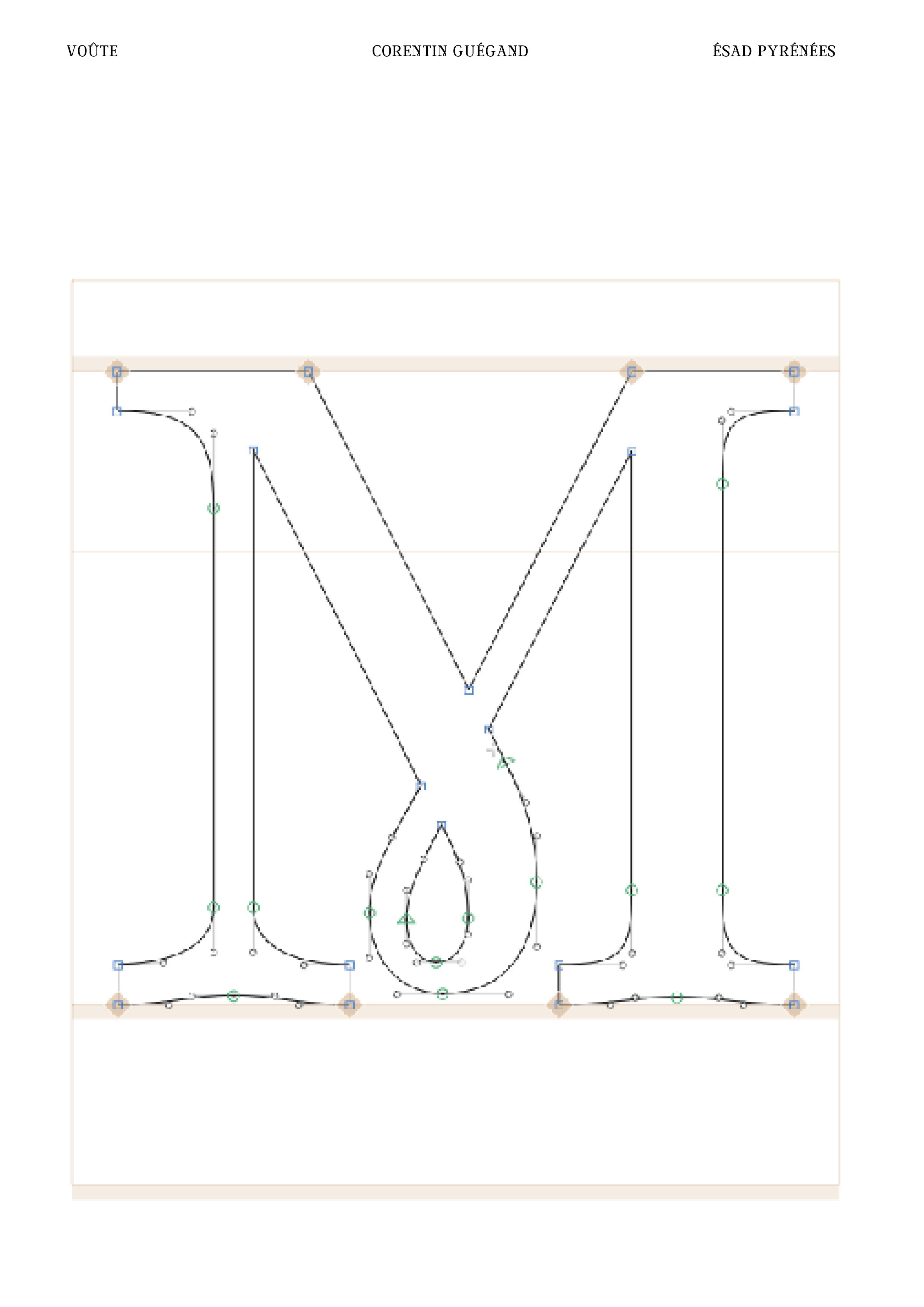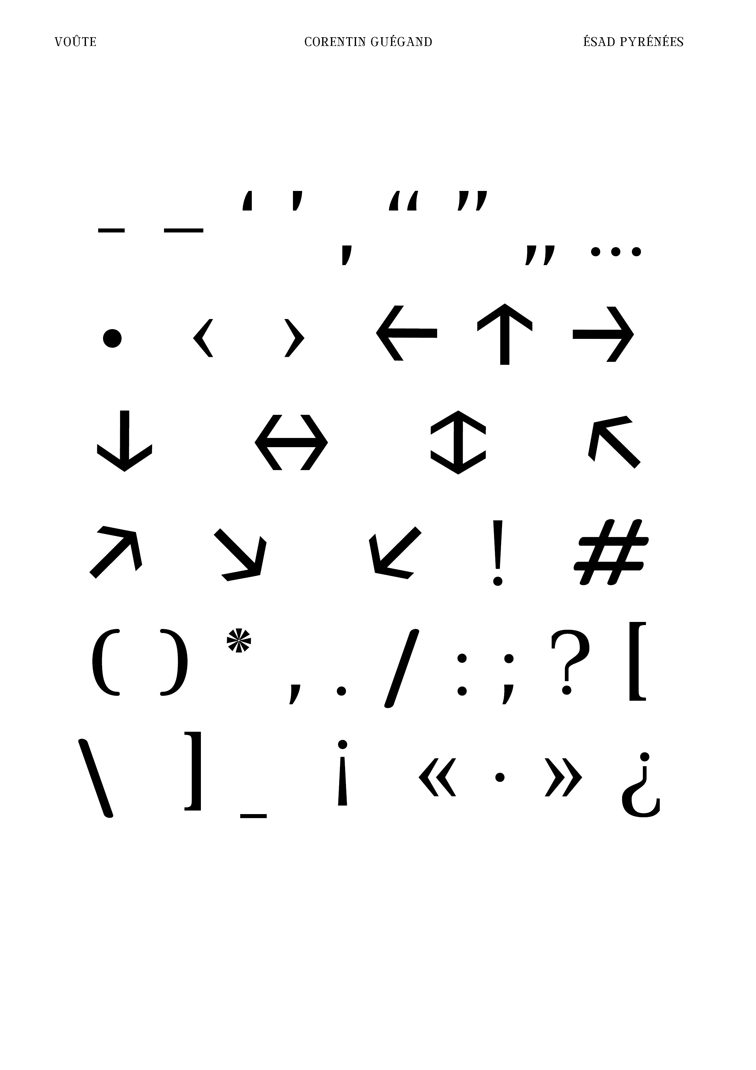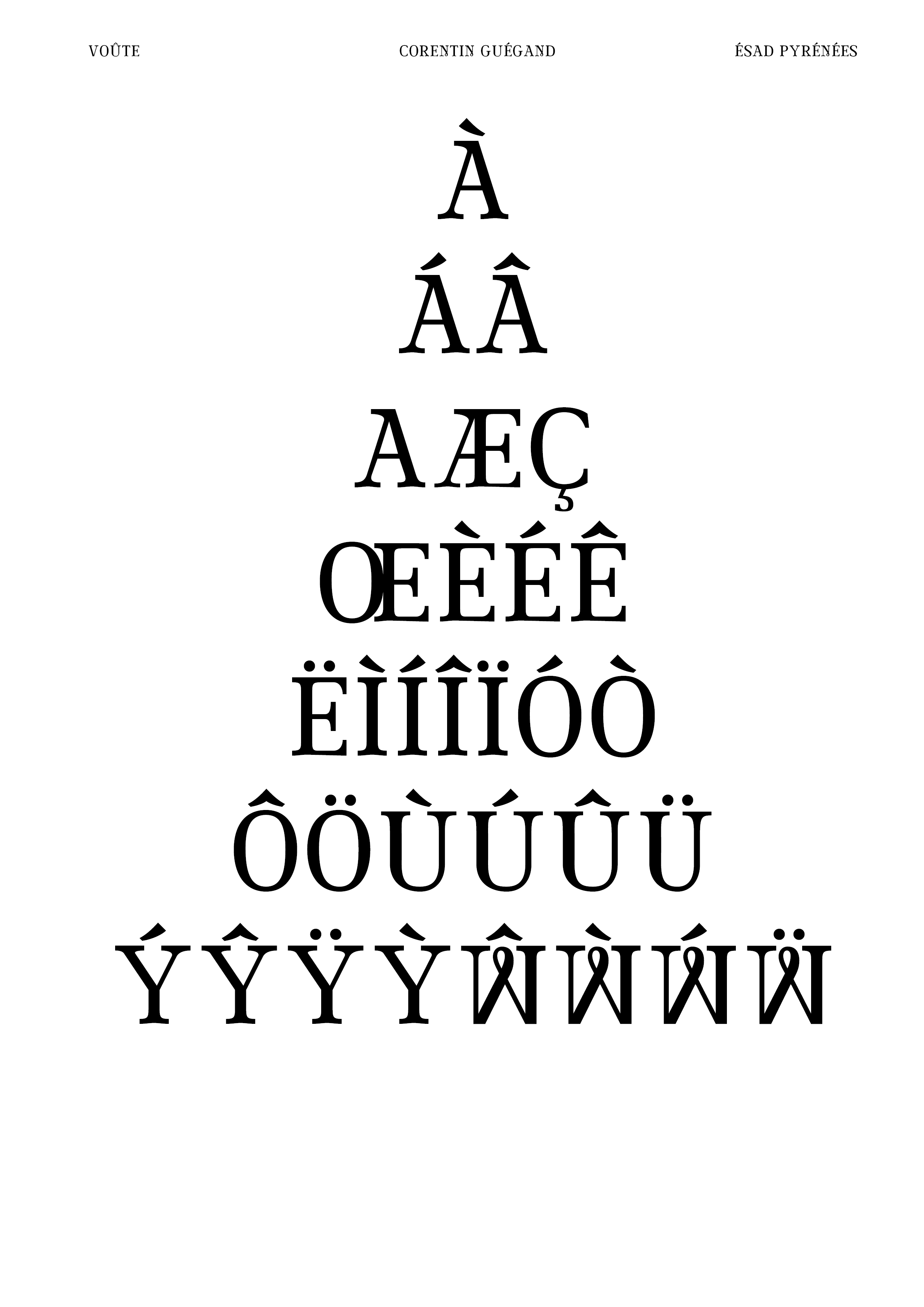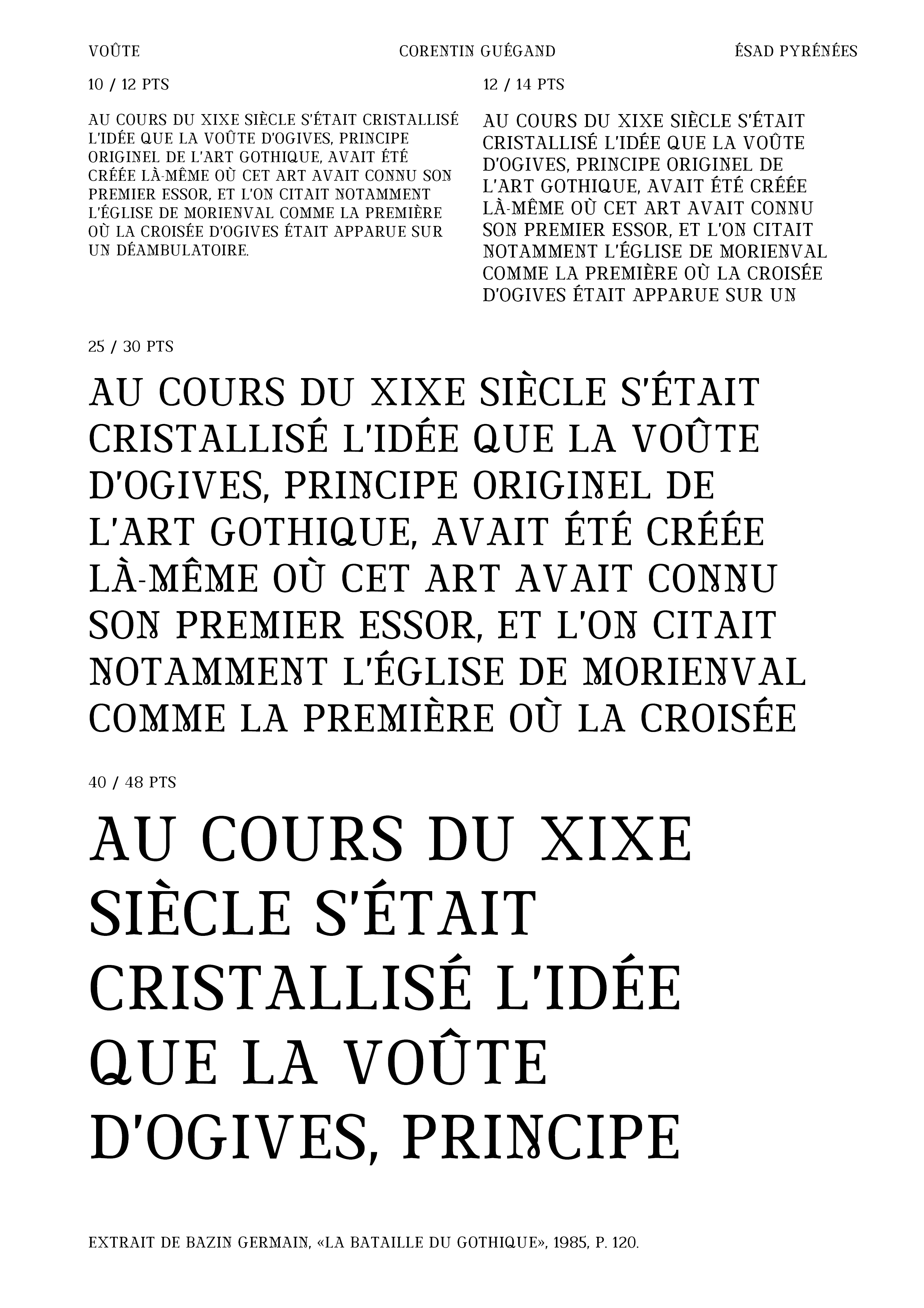 Réalisation d’une police de caractères (chiffres, signes et majuscules) à partir d’un lettrage. À partir de cinq lettres, j’ai dû composer l’ensemble de la police de caractères (majuscules, chiffres et signes) en conservant les caractéristiques du lettrage original : empattements légèrement voûtés, boucle à la pointe du M, contraste des graisses ... Je les ai ensuite vectorisés sur Glyphs afin de pouvoir utiliser Voûte (nom de ma fonte) sur l’ordinateur. Enfin, j’ai produit sur Indesign un spécimen permettant de valoriser la qualité de ma police de caractères, en particulier dans le titrage de livres.