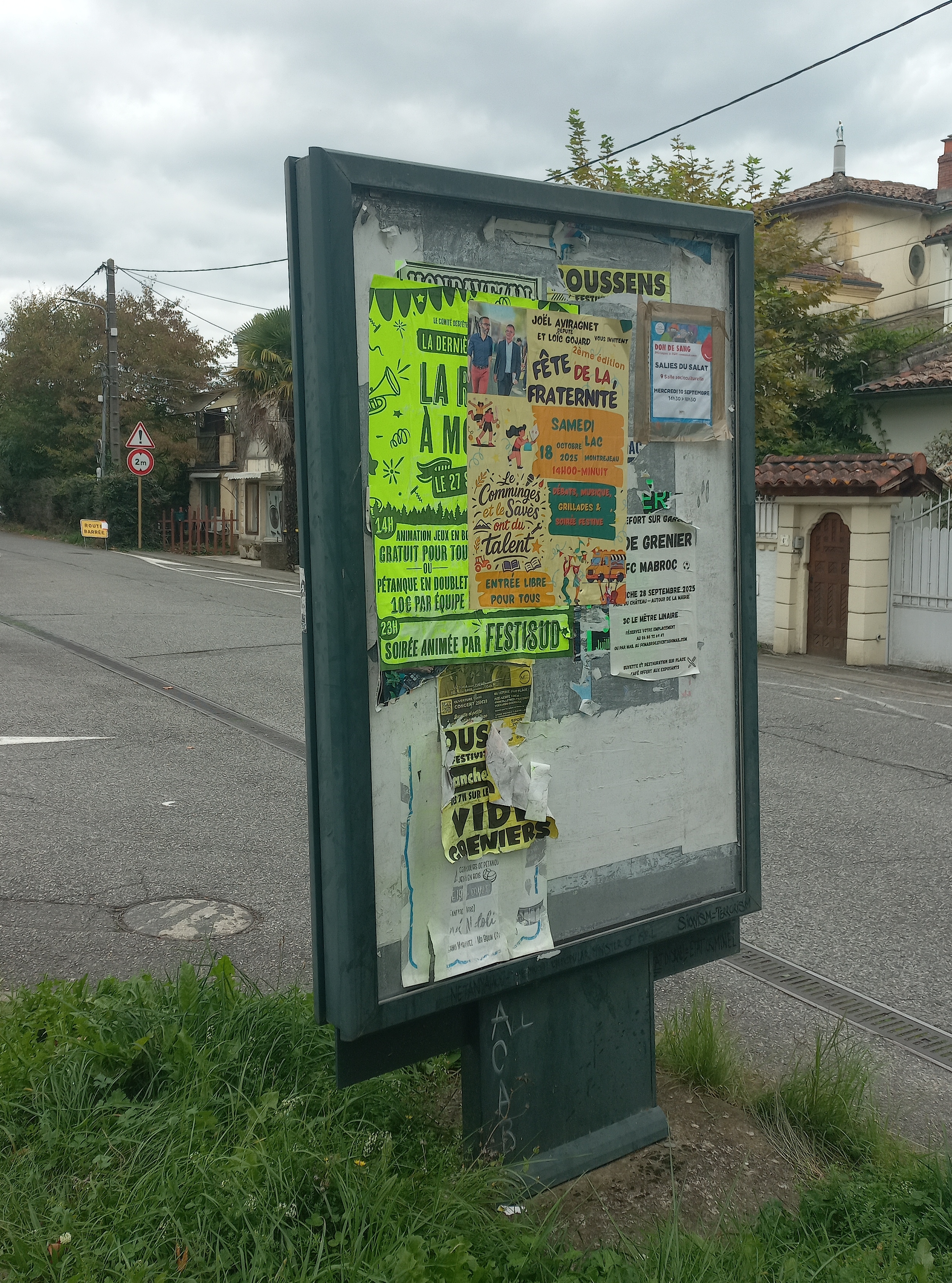 Au-delà des bords de route où s’élèvent les pancartes, des manifestations visuelles apparaissent sur divers supports d’affichage, plus ou moins rustiques. Les tableaux d’affichage, les façades et les abris-bus deviennent des lieux d’exposition à part entière, sur lesquels l’accumulation d’affiches et de flyers, aux formats A5, A4, A3, marque différentes périodes, comme si l’on était témoins d’une mémoire historique de ces lieux, retraçant les événements passéUn cumul de documents graphiques innondant un mur..