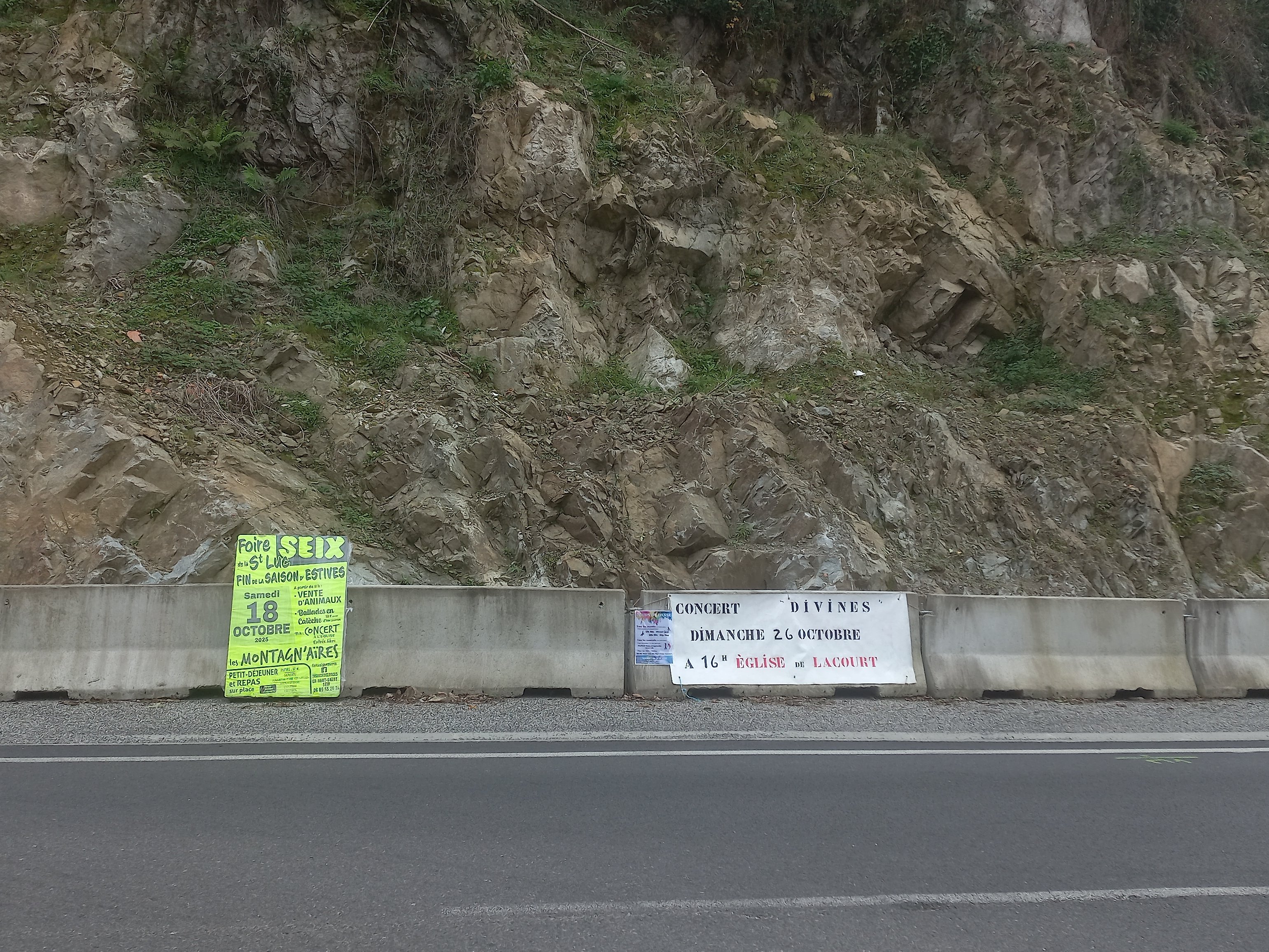 J’ai l’impression de redécouvrir le champ graphique rural, alors que, paradoxalement, de par mes origines pedzouilles, je suis censée connaître ces outils visuels, souvent amateurs. Pourtant, il me suffit de prendre la route qui longe l’Arac en direction de Guzet, de passer à côté du pont qui mène à Soulan, pour arriver au rond-point de Kercabanac, qui constitue un carrefour important reliant les bourgades alentours. Je trouve sur le bord de route un petit trésor d’objets graphiques campagnards : une affiche A3 jaune fluorescente pour la « Foire de la Saint-Luc » à Seix, une banderole cloutée au sol pour la « Foire d’automne, marché agricole et artisanal », entièrement en capitales. Des panneaux faits main à partir de bois ou de palettes, servant tantôt à coller des affiches, tantôt à peindre directement sur la surface boisée, avec une irrégularité dans la composition de ces dernières, pour annoncer, par exemple, le concours de la « Funky Family Soupe », le marché de Soueix, etc[fig. 1]Rond point de Kerkabanac..