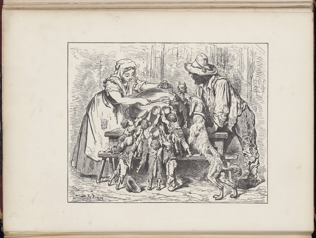 Le Petit Poucet , illustration de Gustave Doré pour Les Contes de Charles Perrault, 1862 sont devenus des classiques de la littérature pour enfants. Les chiens y apparaissent dans des contextes variés, souvent associés à la protection et à la loyauté. Même si leur présence peut sembler secondaire par rapport aux personnages principaux, ils incarnent des valeurs essentielles pour le développement moral des jeunes lecteurs. Perrault utilise ces animaux pour renforcer l’idée de sécurité, thème fondamental dans les récits destinés à l’enfance.