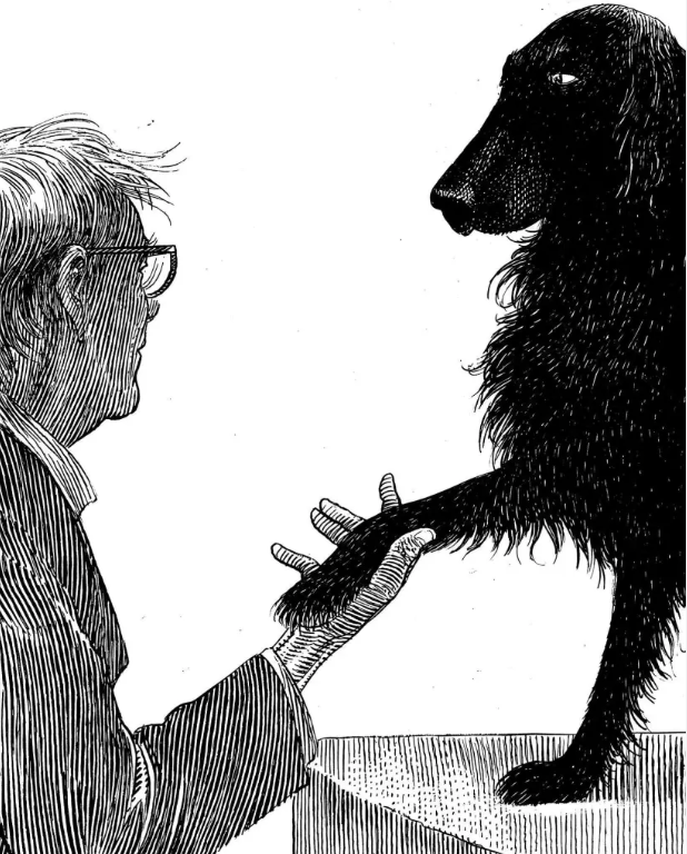 Le Chien Bleu, album jeunesse écrit et illustré par Nadja, 1989, qui devient son protecteur face à un danger menaçant. Les illustrations minimalistes et les contrastes de couleurs, notamment le bleu éclatant du chien et les arrière-plans sombres, renforcent le caractère presque surnaturel de ce compagnon. Bleu n’est pas un simple chien ; il est une figure protectrice et bienveillante qui incarne la sécurité et le courage. Cette oeuvre aborde des thématiques importantes comme la peur et la confiance, tout en véhiculant un language visuel qui parle autant aux enfants qu’aux adultes. Nadja offre ici une représentation du chien comme un guide et un gardien, reflétant une vision plus introspective et émotionnelle du rôle de l’animal. Cette oeuvre aborde des thématiques importantes comme la peur et la confiance