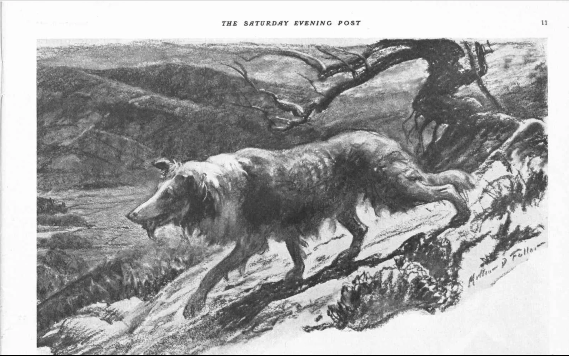 Lassie Come-Home, illustration de Norman Rockwell, 1943, pour le roman d’Eric Knight qui accompagnent ces récits, les scènes héroïques de Lassie sont représentées de manière très réaliste. Par exemple, dans les dessins de Norman Rockwell 10, l’expression de Lassie est travaillée pour transmettre à la fois la détermination, l’intelligence et le dévouement. Ses postures sont soigneusement choisies pour transmettre une forme de noblesse tranquille. On la voit souvent dans des scènes où elle surmonte des obstacles pour protéger son jeune maître, ce qui devient un moyen pour l’illustrateur de symboliser l’idéalisme moral. Les détails des paysages et des vêtements des personnages mettent en avant une époque révolue, où l’engagement moral des animaux était aussi important que celui des humains.