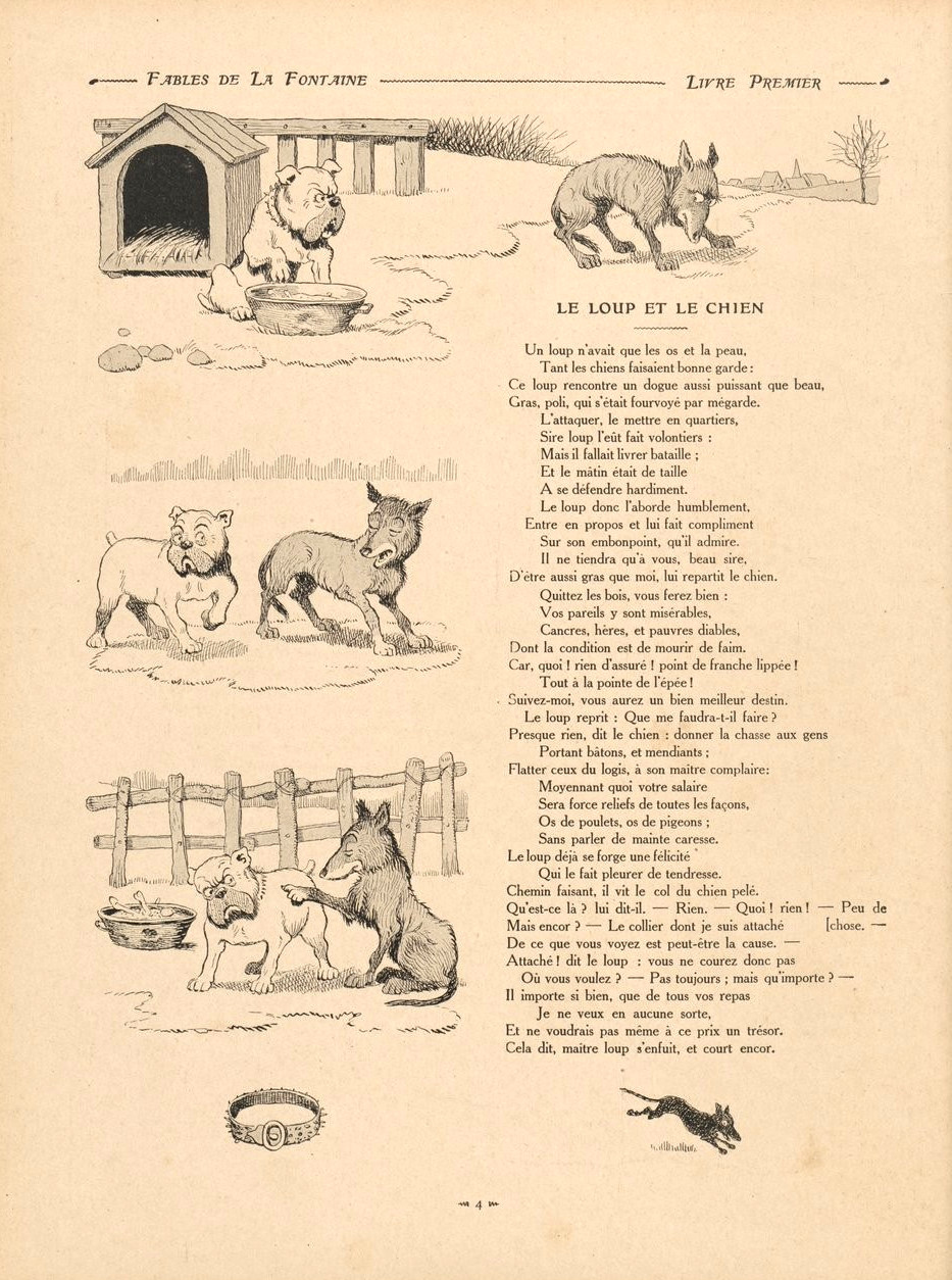 Le Loup et le Chien, illustration de Benjamin Rabier, début du XXe siècle, au début du XXe siècle, propose une lecture humoristique et expressive.