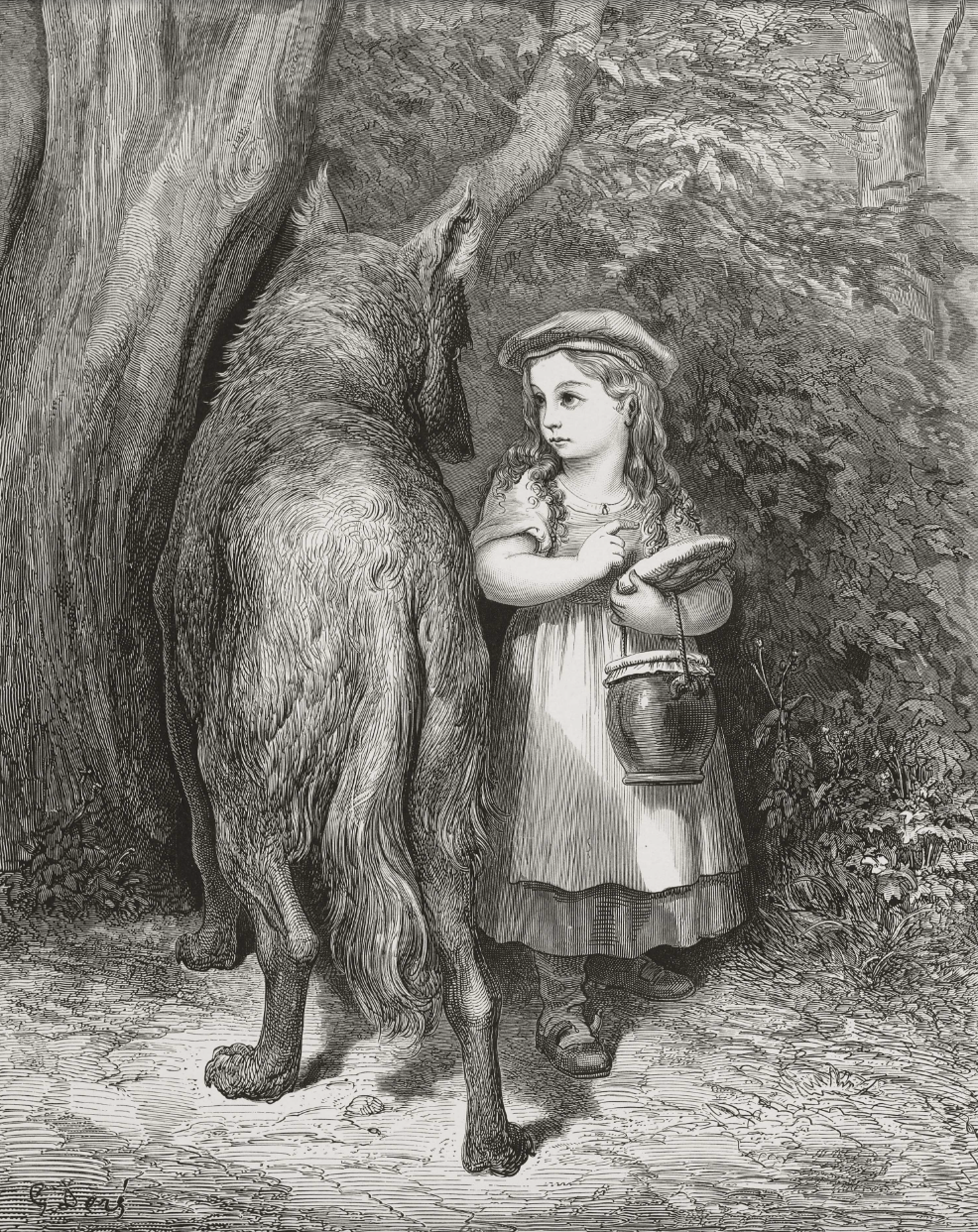 Le Petit Poucet , illustration de Gustave Doré pour Les Contes de Charles Perrault, 1862. Comme d’autres animaux présents dans le conte, il devient un acteur qui illustre le thème de l’assistance dans un contexte périlleux. Le héros, tout comme la princesse de Peau d’Âne, doit faire face à des dangers multiples et bénéficie, directement ou indirectement, de l’aide animale. Les premières éditions illustrées mettent en avant des scènes où des chiens agissent comme des guides pour les enfants perdus ou pour les personnages en situations critiques. Bien que souvent relégué au second plan, le chien devient un élément visuel qui renforce la sécurité et la bienveillance, accentuant le contraste entre les périls du monde extérieur et la protection qu’il offre. Sa vigilance envers les enfants dans leurs épreuves correspond à un modèle d’aide altruiste et désintéressée, soulignant ainsi le rôle moral des animaux dans les récits éducatifs.