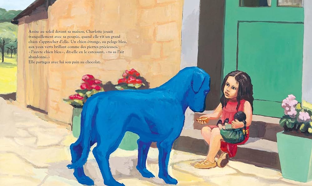 Dans un registre plus onirique, Le Chien Bleu de Nadja se distingue également par ses illustrations marquantes. Ce récit explore le lien profond entre une petite fille, Charlotte, et un chien mystérieux nommé Bleu