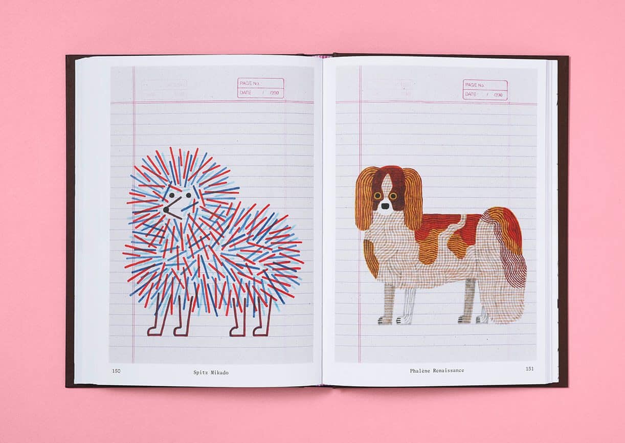 Chiens, ouvrage graphique de Jochen Gerner, 2023, éd B42 réduit les chiens à leurs formes essentielles, jouant avec les aplats de couleurs et les textures pour composer une série de représentations graphiques à la fois abstraites et évocatrices. Chaque dessin adopte un style simple où la réduction des détails met en valeur l’aspect universel et intemporel du sujet. Ce travail témoigne de la manière dont les artistes contemporains utilisent le chien comme prétexte à des expérimentations visuelles.