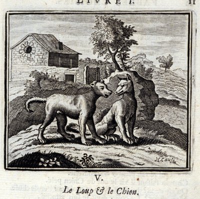Dans Le Loup et le Chien,le contraste entre les deux animaux illustre ce dilemme : le chien représente la sécurité et la soumission, tandis que le loup incarne la liberté, bien que précaire. Les premières éditions des Fables, illustrées par François Chauveau (1668)