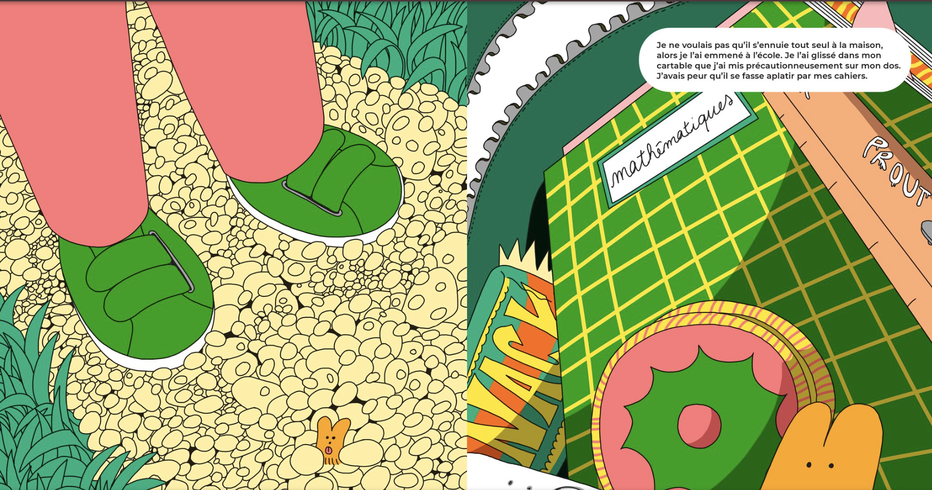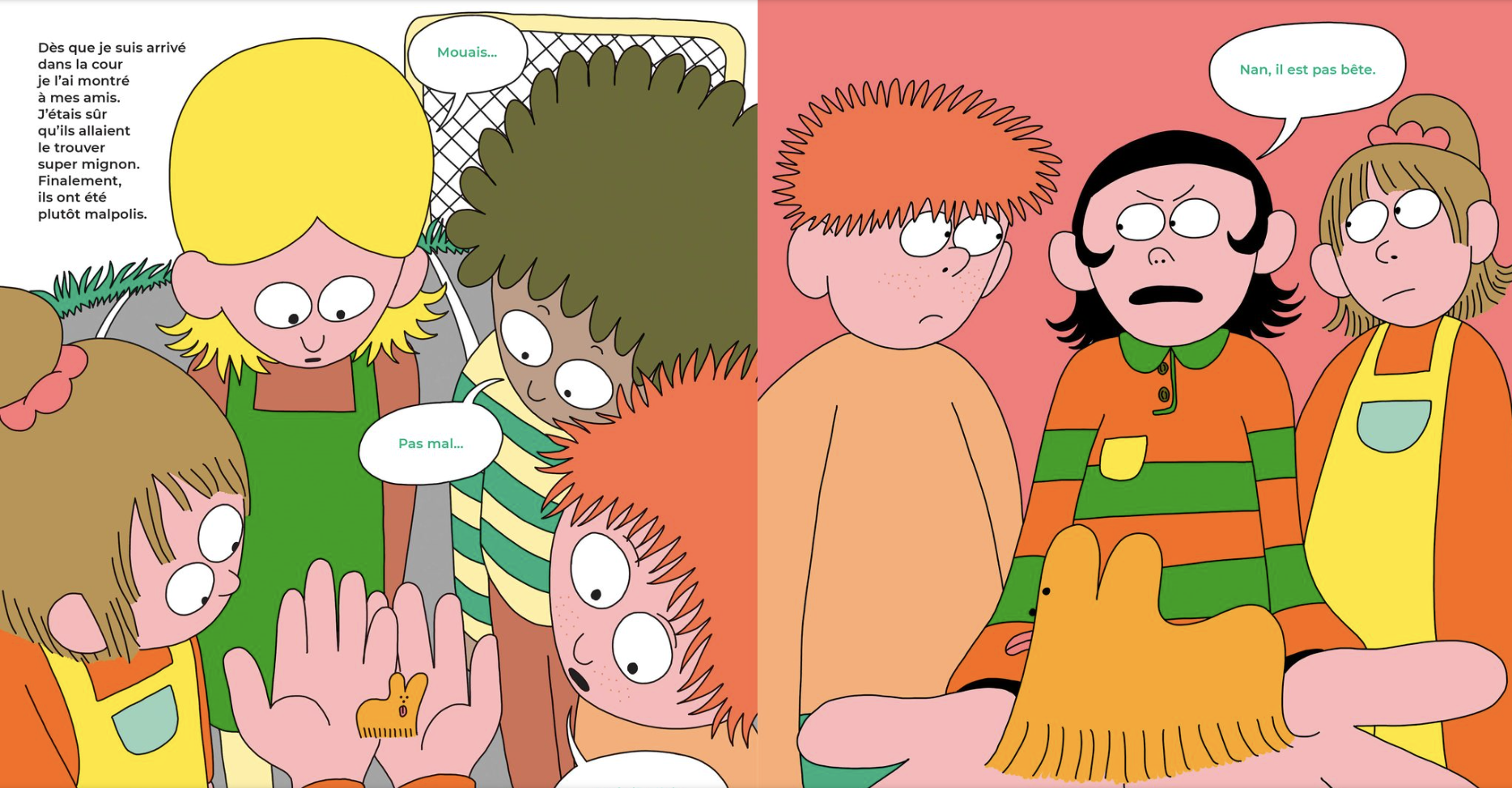 Dans certaines oeuvres, le minimalisme est mis en avant, permettant aux émotions des chiens de prendre le pas sur les détails graphiques. Par exemple, Le Mini Chien de Mona Granjon s’inscrit parfaitement dans cette tendance. L’album utilise un style graphique épuré aux couleurs douces et une narration visuelle subtile, pour aborder des thèmes d’acceptation et de tolérance. Le Mini Chien
